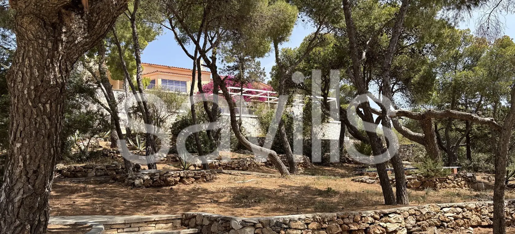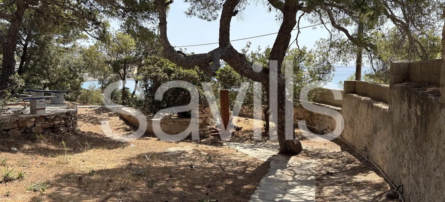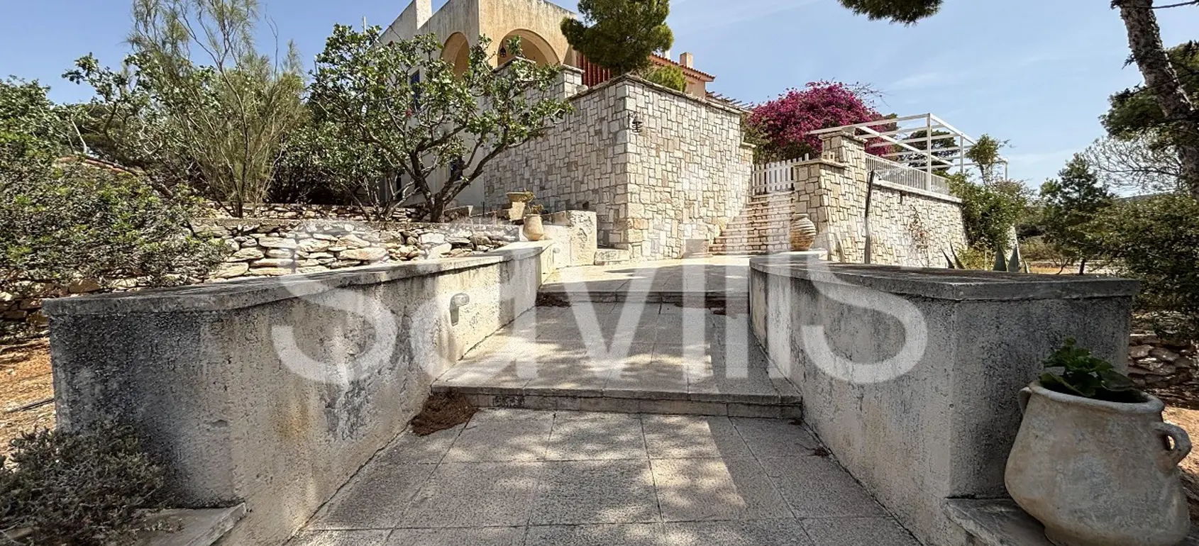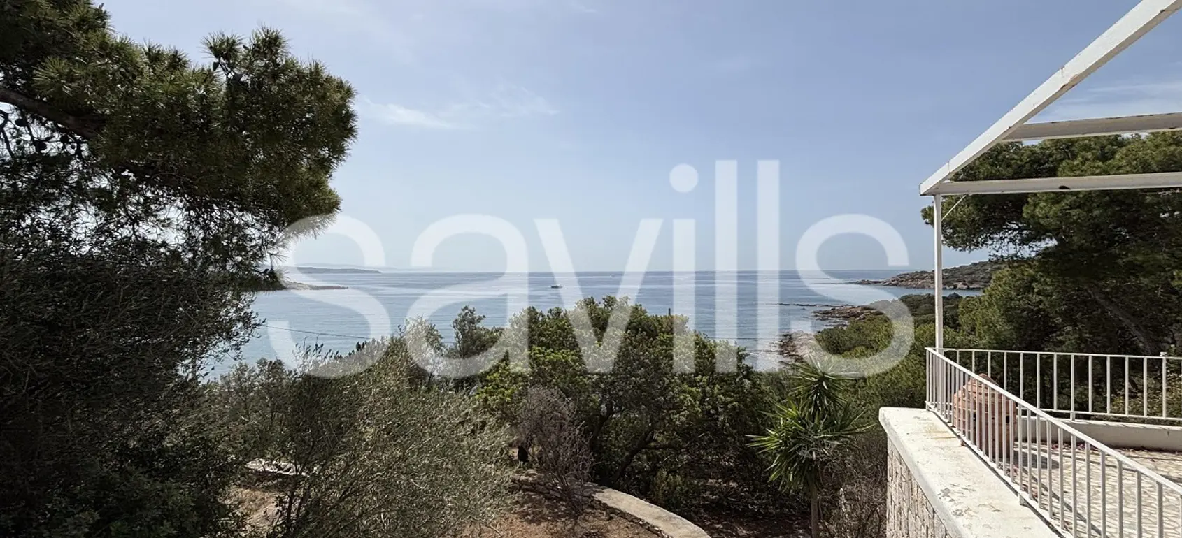 A large seaside plot featuring a main villa and additional auxiliary buildings