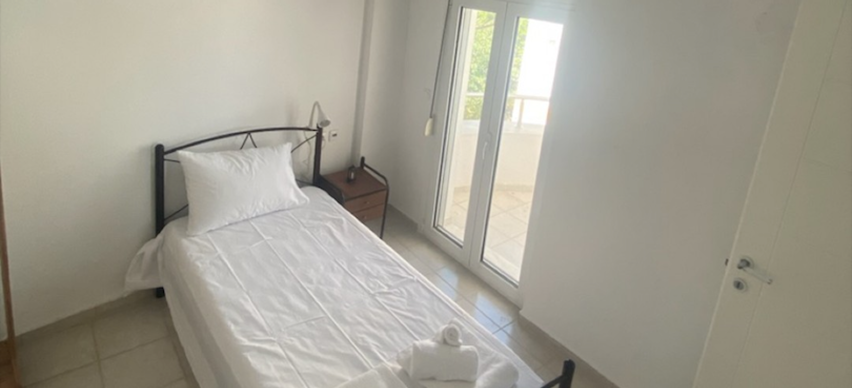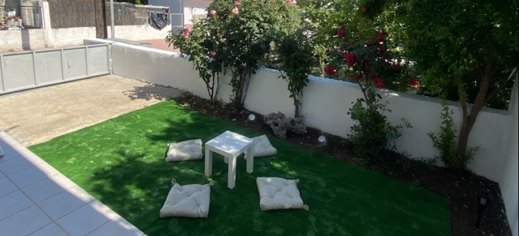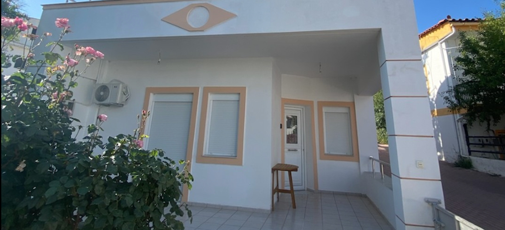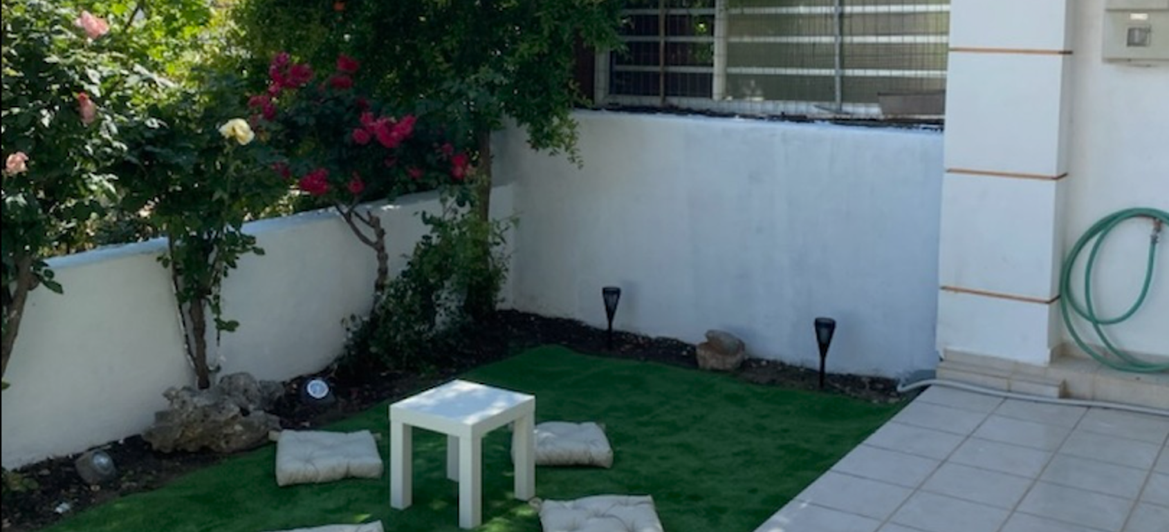 A garden provides a quiet retreat, and the central balcony captures partial views of the Libyan Sea and surrounding mountains. Fully furnished and equipped with air conditioning and autonomous heating, the property is suited to year-round living.