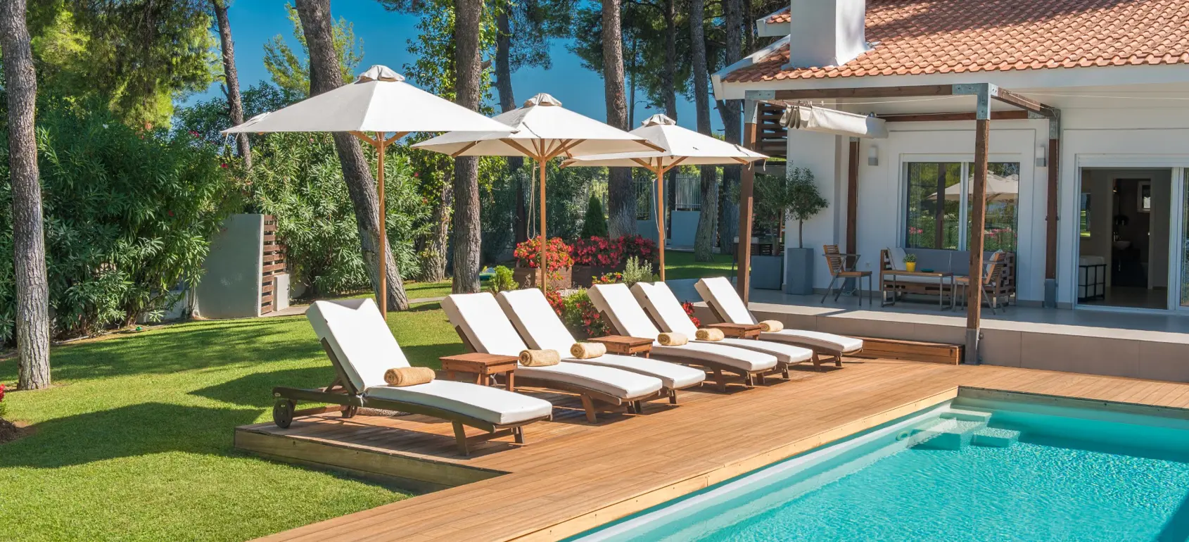 The main living area is exceptionally bright, thanks to expansive glazed doors that open directly onto the pool terrace, creating a seamless indoor–outdoor flow. The kitchen is conveniently positioned on the entrance level, adjacent to the dining area, while one of the bedrooms is also located on this floor. The remaining three bedrooms are situated one level below, alongside a second living area that offers additional comfort and privacy. The top floor feels wonderfully secluded, featuring two further bedrooms, one of which includes an en suite bathroom.