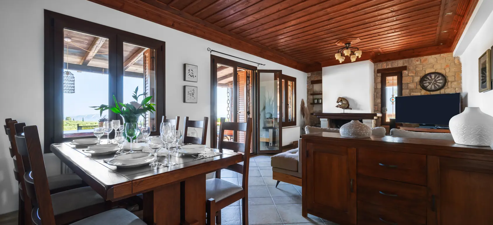 Spacious interiors and inviting common areas make this villa an exceptional retreat. Upon entering, you are welcomed into an elegant dining and living area, where a charming fireplace creates a warm and relaxing ambiance. Adjacent to this space is a fully equipped kitchen featuring a central island, ideal for meal preparation and offering direct access to the outdoor BBQ and traditional wood oven.