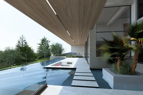 The villa is thoughtfully divided into two wings: the main residence and an independent guest wing. Together they provide six en‑suite bedrooms, expansive living and dining areas, and multiple indoor and outdoor spaces for entertainment and relaxation. The main house unfolds across three levels, connected by both staircase and private elevator. A dramatic double‑height living room with floor‑to‑ceiling glass creates an airy atmosphere filled with natural light, while the open‑plan kitchen and dining area are ideal for both casual and formal gatherings. The upper level hosts additional bedrooms with serene views, while the lower level is dedicated to leisure, featuring a home theater, billiard room, and a unique sauna with a glass wall offering an underwater view into the pool above. A secure garage with direct indoor access completes this section.