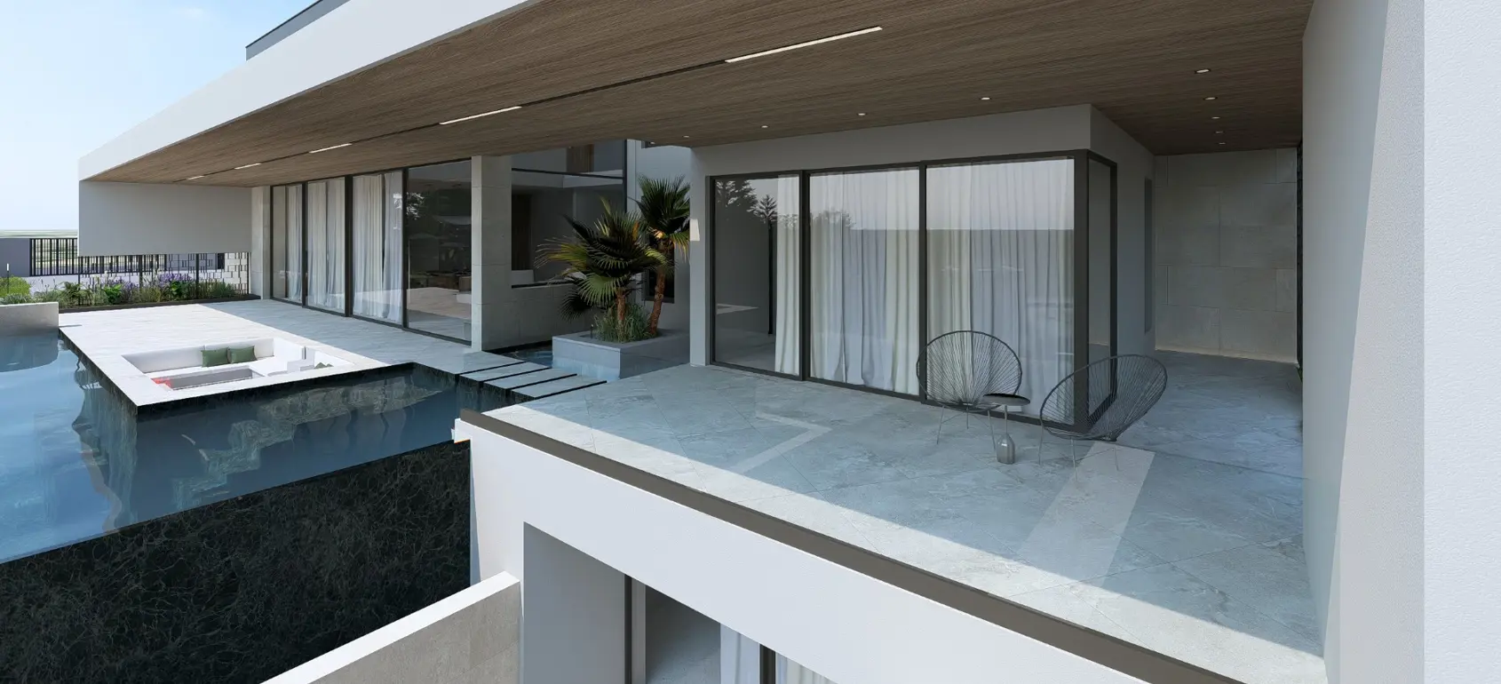 Outdoor living is equally impressive, with a covered veranda for year‑round dining, a stylish patio and a spectacular 25m swimming pool that stretches toward the horizon, reflecting the sea and sky. The guest wing, fully independent, includes two en‑suite bedrooms, a modern living room, and a secondary kitchen, making it perfect for visitors, extended family, or premium rental use.