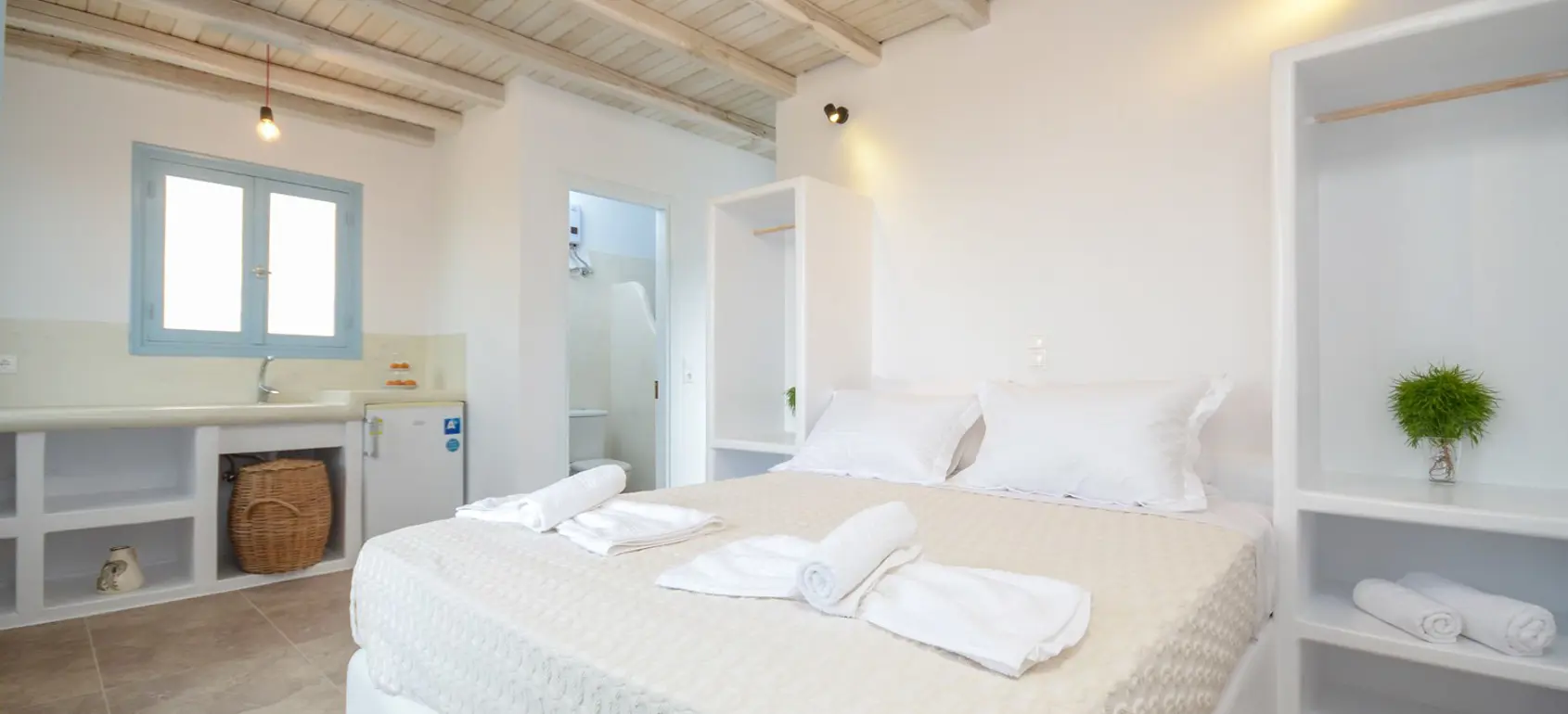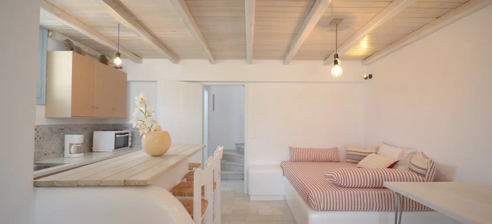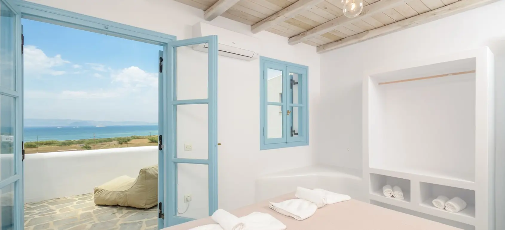 The complex further benefits from a dedicated parking area and an expansive garden. Its location is exceptional: set within a peaceful rural environment that ensures quietness and relaxation, yet just moments away from all amenities, vibrant island life, and within walking distance of the renowned Plaka sandy beach.