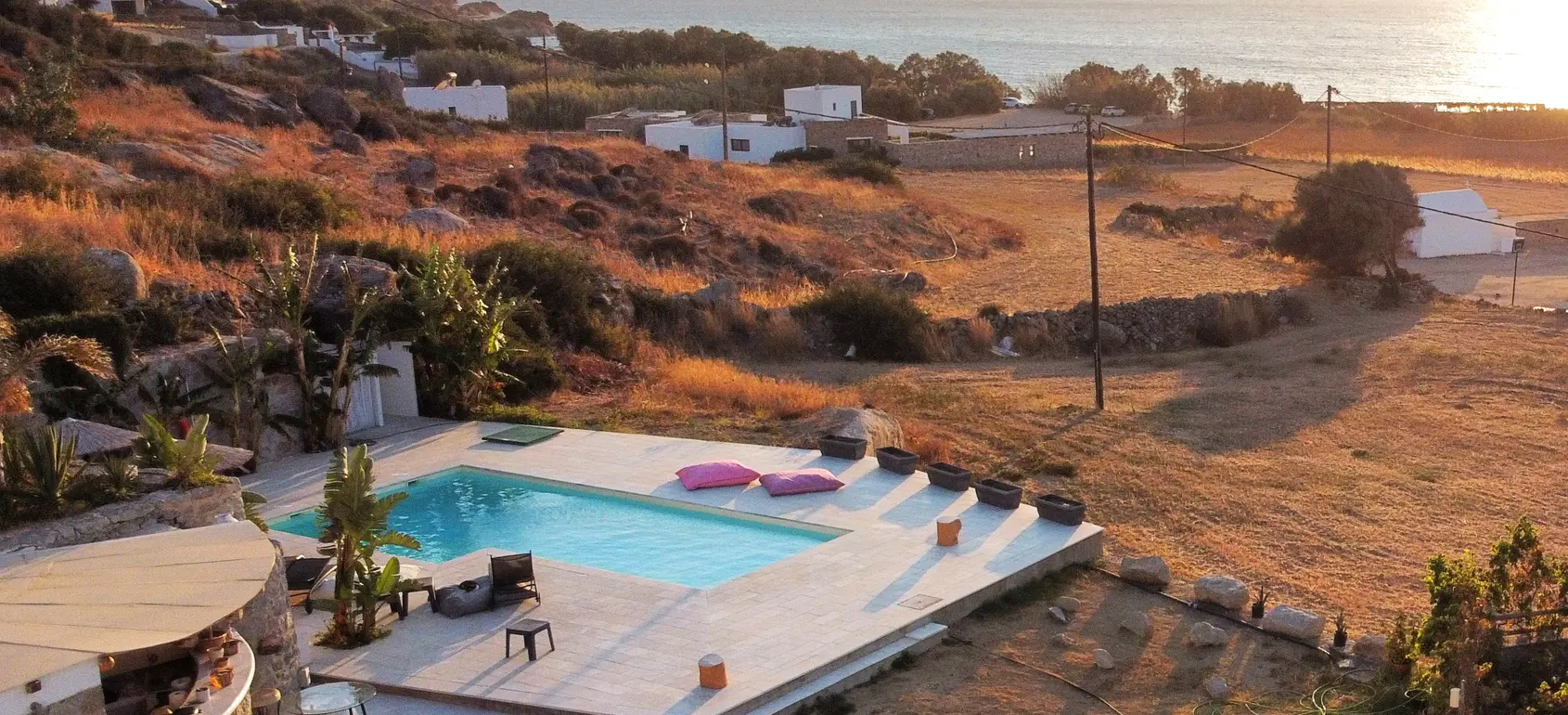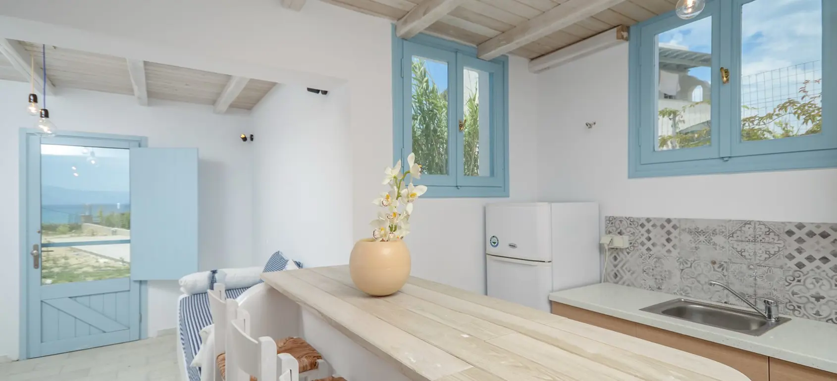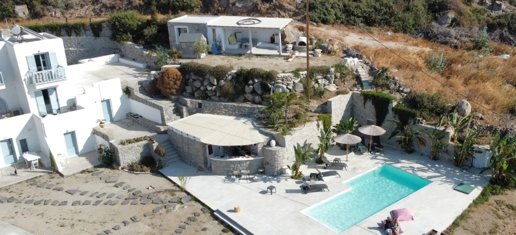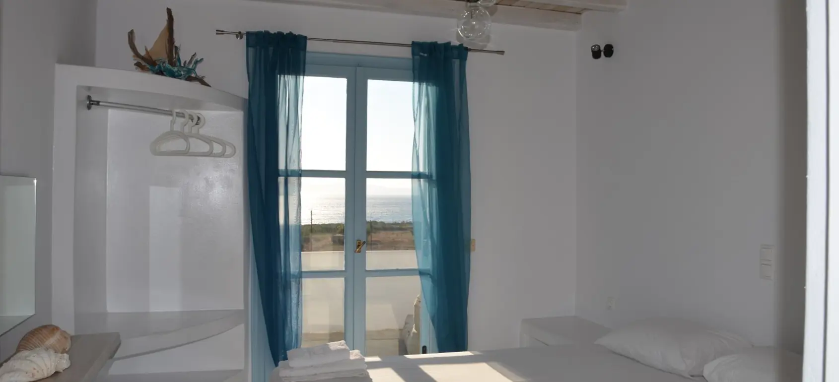 The complex further benefits from a dedicated parking area and an expansive garden. Its location is exceptional: set within a peaceful rural environment that ensures quietness and relaxation, yet just moments away from all amenities, vibrant island life, and within walking distance of the renowned Plaka sandy beach.
