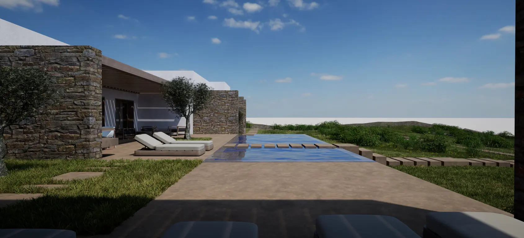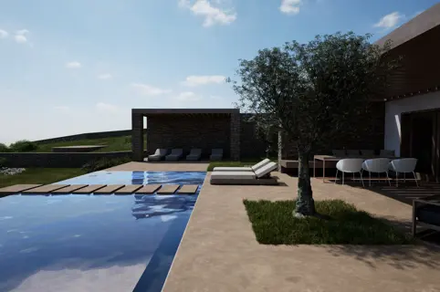 Stepping outside, the expansive terrace reveals a magnificent view of the Aegean Sea, especially during sunset time. Elegant loungers surround the swimming pool, while the dining area and adjacent lounge set the scene for unforgettable evening meals and cocktails. Additional outdoor spots offer the choice between uninterrupted sea vistas or serene landscape views.