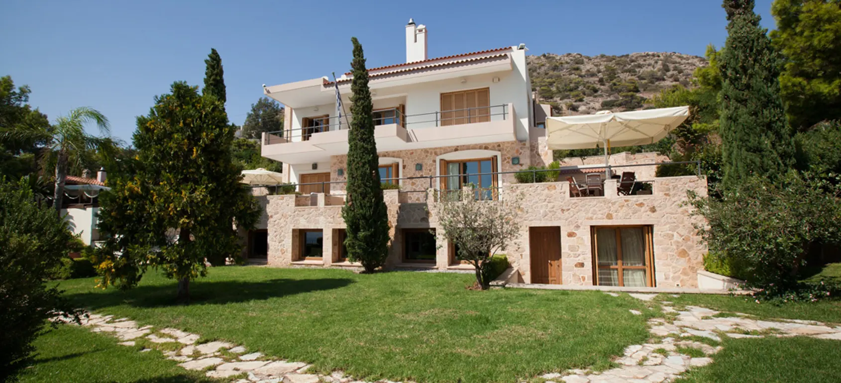 This exceptional 983 sqm residence is set on a professionally landscaped 3,537 sqm hillside plot just 300 meters from the beach, offering breathtaking, unobstructed sea views. The serene garden and elegant 120 sqm pool area—complete with a stylish pool bar, pergolas, and bespoke architectural features—create the perfect setting for both relaxation and high-end entertaining. Inside, the villa boasts a grand reception area with a spacious living room, fireplace, and formal dining space, alongside a fully equipped independent kitchen ideal for catering. The upper level features four luxurious master suites with Jacuzzi bathrooms, study areas, and private sea-view verandas, while the lower level offers a sophisticated playroom with bar, kitchen, fireplace, dining area, and snooker space, complemented by a gym, wellness facilities, staff quarters, and storage rooms. Fully air-conditioned with underfloor heating, advanced security systems, and a 60kW generator, this property ensures ultimate comfort, privacy, and autonomy.