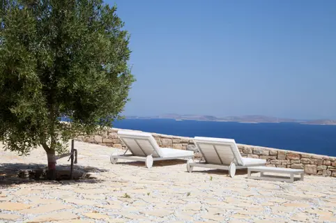 The house consists of two buildings, sleeping area and living area, connected by external stairs. The sleeping area has three bedrooms, each with a bathroom Each room has an independent access The living area is around 65 sqm and has its own bathroom and an open kitchen as well as a fireplace. The kitchen is equipped with appliances (fridge, oven and dishwasher). There is also a garage, two small storages, in one of which there is a washing machine. Above the living area there is a solarium. Around the house in total 2,896 sqm of land is planted with fruit trees (2 fig trees, 1 apricot tree, 1 olive tree, some vine shoots, a pine tree, hedges of lavender, rosemary and a vegetable garden). Just in front of the house is the small island of Arki with some wonderful coves with the Caribbean coloured sea water.