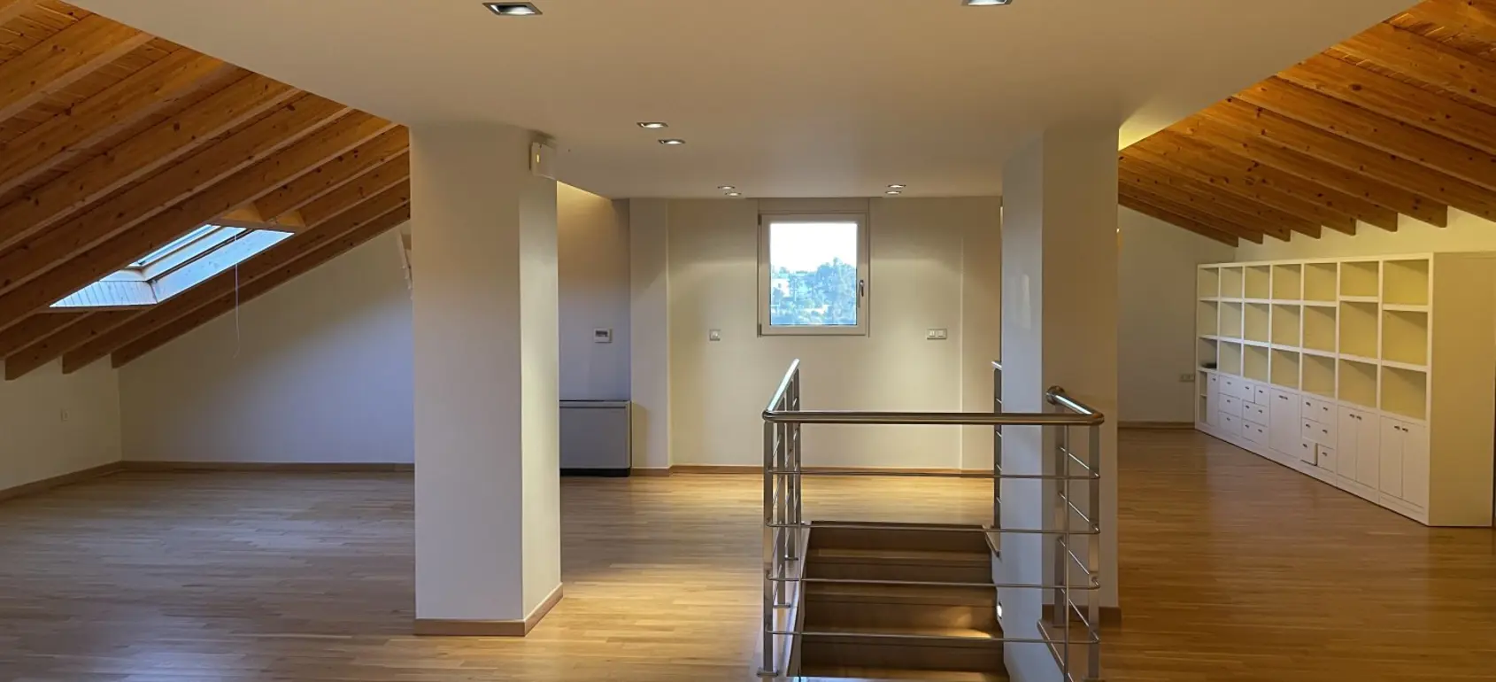The attic is not like a typical attic. It has normal ceiling height and four windows, making it very bright and creating a pleasant atmosphere.