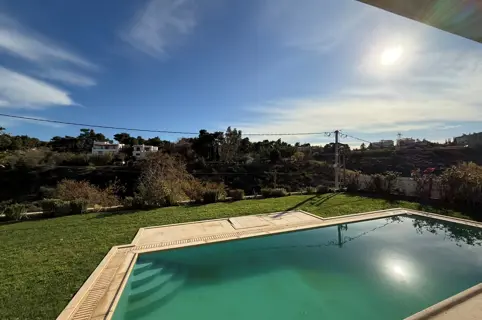 Separate dining area. Very bright living space with access and view to the front garden and the pool. Enclosed built-in kitchen with dining table and its own sitting area with fireplace.