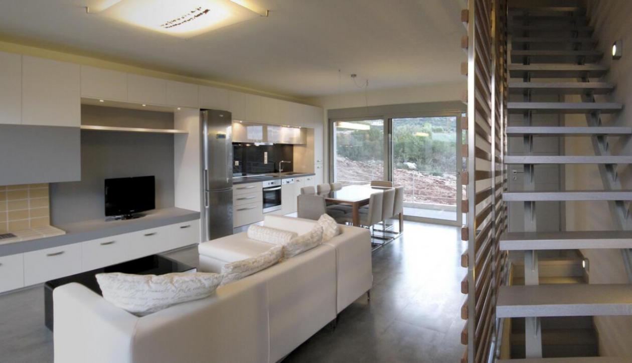 Interior spaces include two bedrooms and a spacious open-plan living, dining, and kitchen area. Additional amenities comprise an attic terrace offering panoramic sea views and a versatile lower-level space with a bathroom, ideal for use as a playroom, guest suite, or multipurpose room.