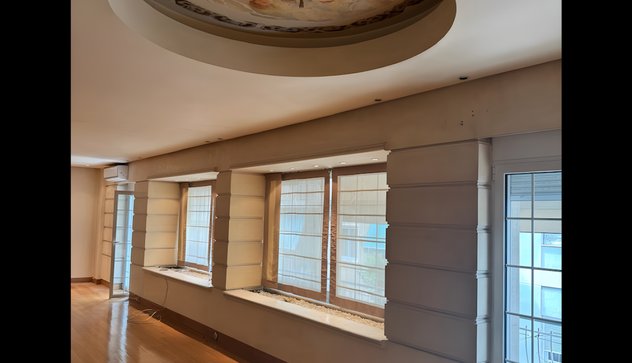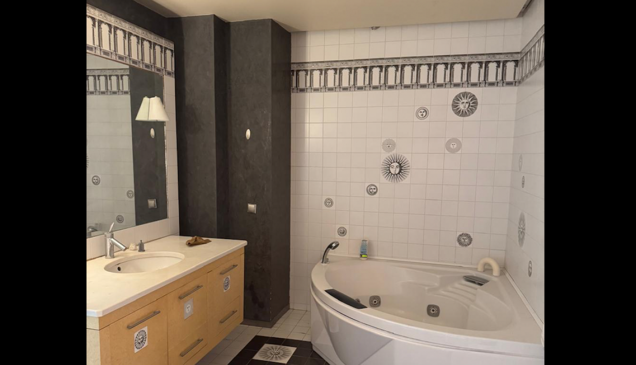 The apartment’s standout features include floor-to-ceiling wardrobes with integrated mirrors, creating a sense of openness and maximising storage. High ceilings enhance the living space, while a beautifully designed ceilings and a traditional fireplace in the large living room. The functional kitchen complements the home’s practical layout.