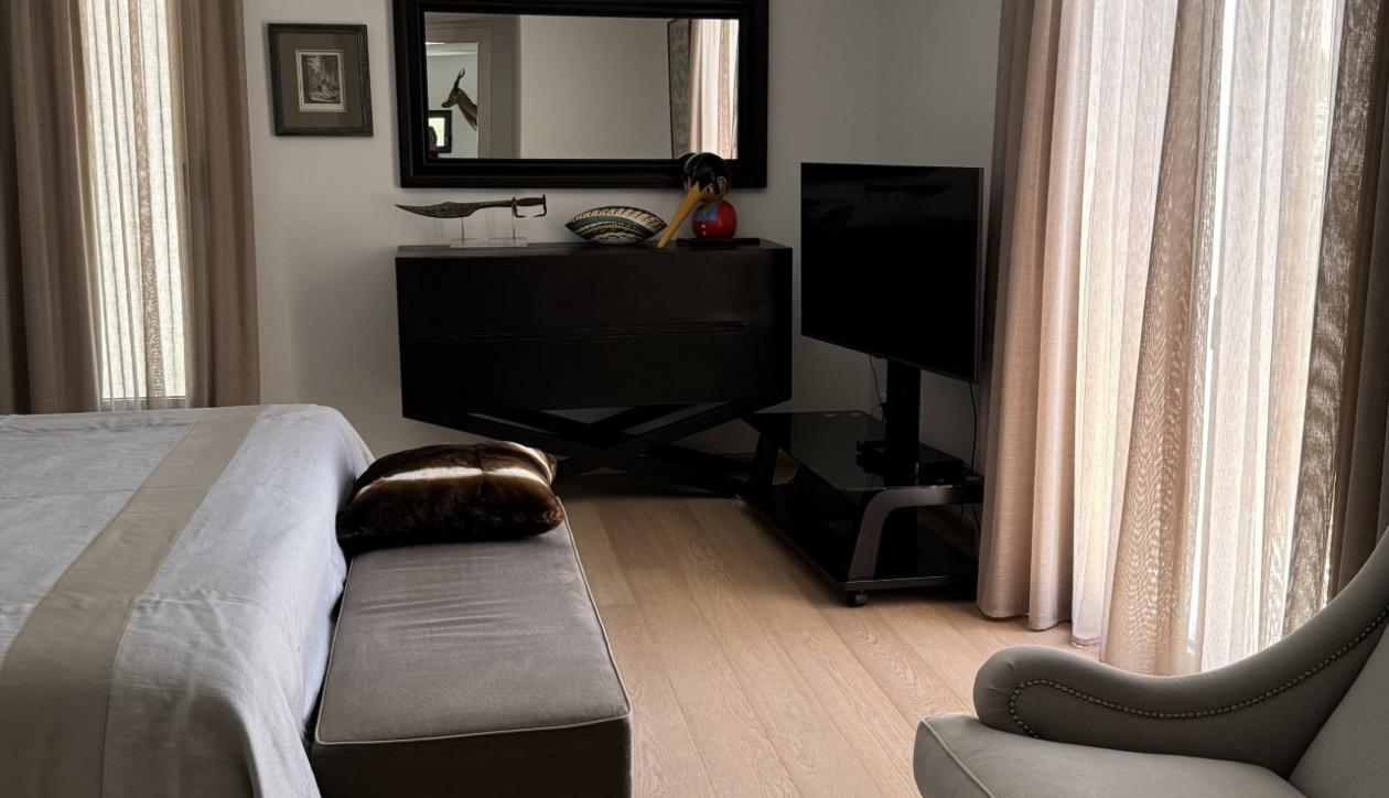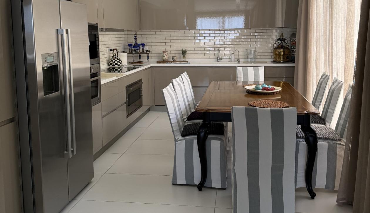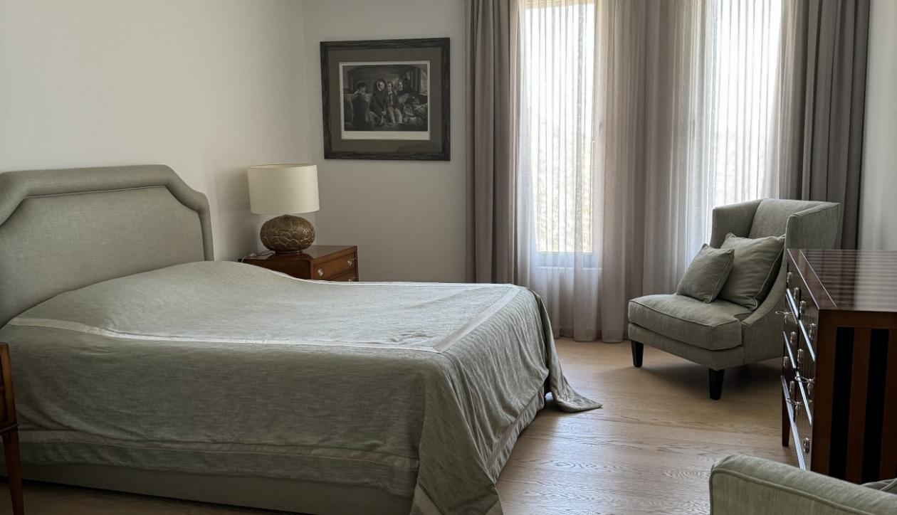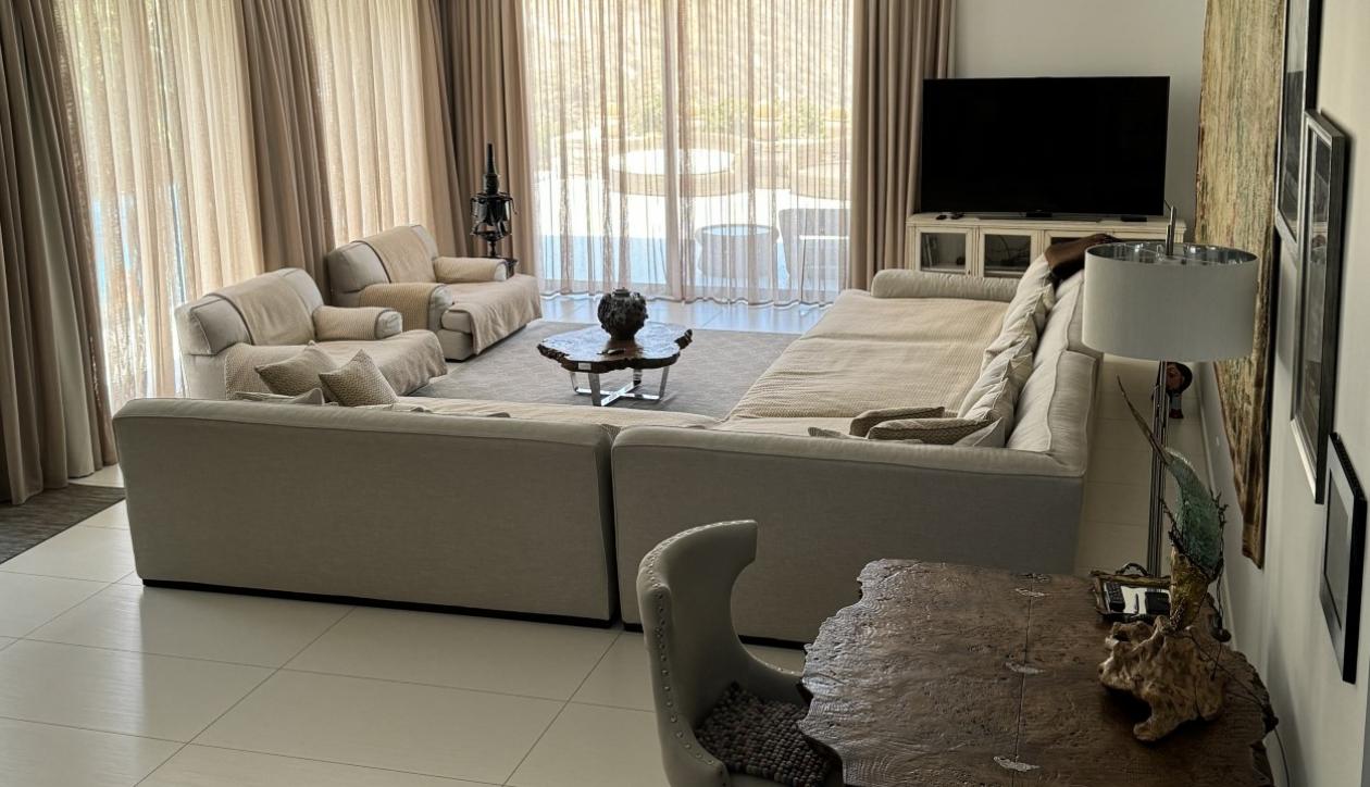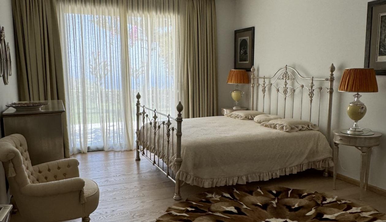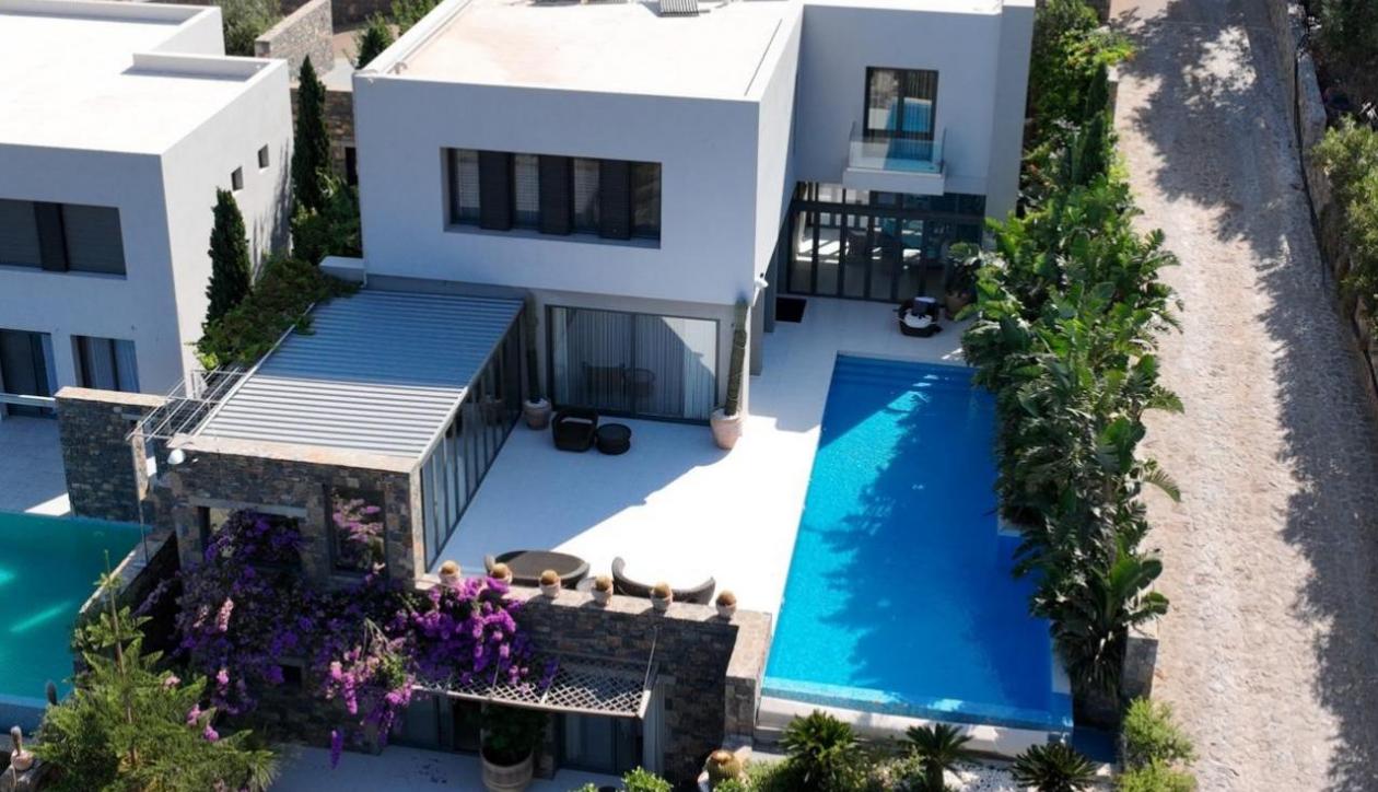 On a gated community of 6 premium class villas, the property consists of: a three-storey main house (420 sqm), a swimming pool, a gym, a barbecue area, a glazed dining area with air conditioning, a guest house (studio), a garage for 2 cars, a garden with fruit trees and unique ornamental plants. It does not require any repairs. The guest house has a studio, a living room combined with a kitchen, a bathroom (shower cabin and bathroom), washing machine and dishwasher, conditioning system. The main house has three levels. Ceilings over 3.5 meters, panoramic windows with views of Spinalonga Island, sunrise. The upper level has 3 huge bedrooms with walk-in closets and bathrooms with large showers. The master bedroom has access to the balcony. The area of the bedrooms is from 30 sqm. The floor covering is oak parquet. The middle level has a living room with an adjoining kitchen with access to a barbecue area and a glazed dining area with the possibility of opening the entire glazing area. A large stove- fireplace Castelmonte, which allows you to live in the autumn-winter period. The laundry room is equipped with a washing machine and dryer. Guest bathroom. On the lower level: 2 full-fledged, large bedrooms with access to the garden, with separate bathrooms, with dressing areas. The villa is fully furnished with unique high-end furniture. Equipped with Mile appliances, kitchen: refrigerator, coffee machine, oven -2 pieces, extractor hood, hob. Mile washing, drying, and ironing systems. The guest house is equipped with similar equipment. Iron shutters on the windows. Garage for two cars with air conditioning system. The pool is 5x15 m. Water treatment system, pool heating system, automatic irrigation system, high degree of water purification in the pool (chlorine-free chemistry). A system of solar heaters on the roof. Underground freshwater tank of 50 cubic meters. Centralized ducted air conditioning. The villa has a manager. All documents are ready for a quick transaction.
