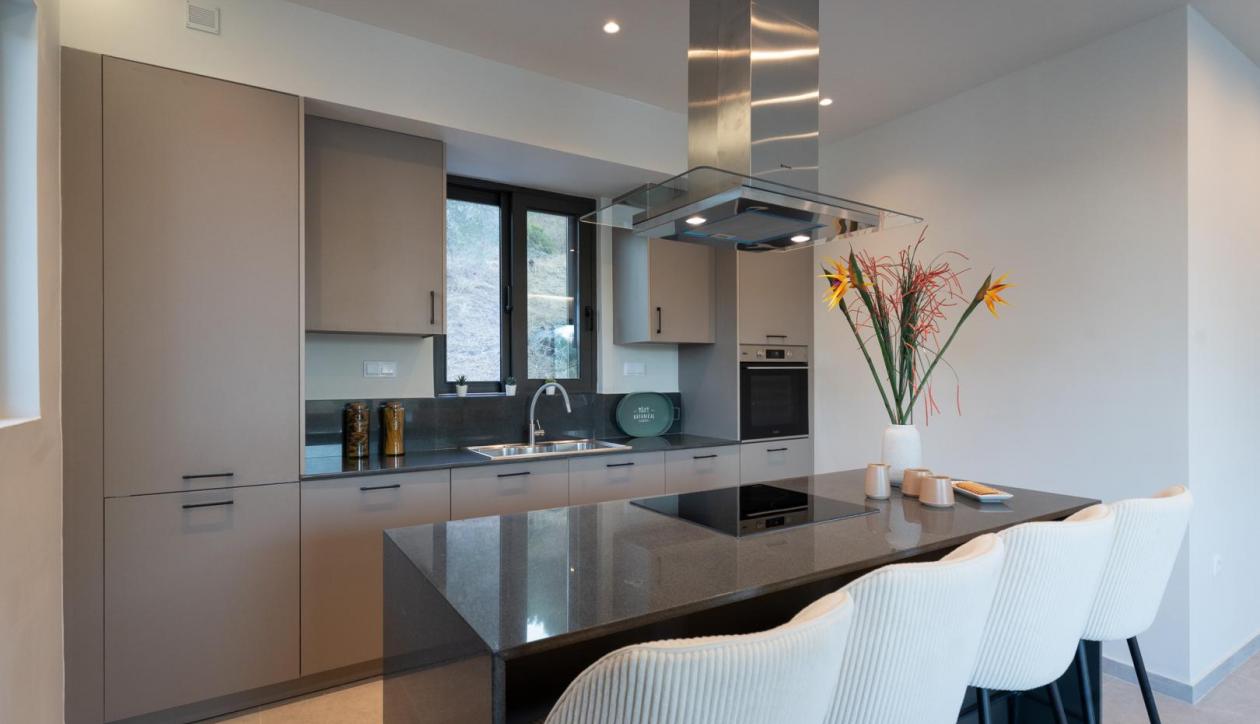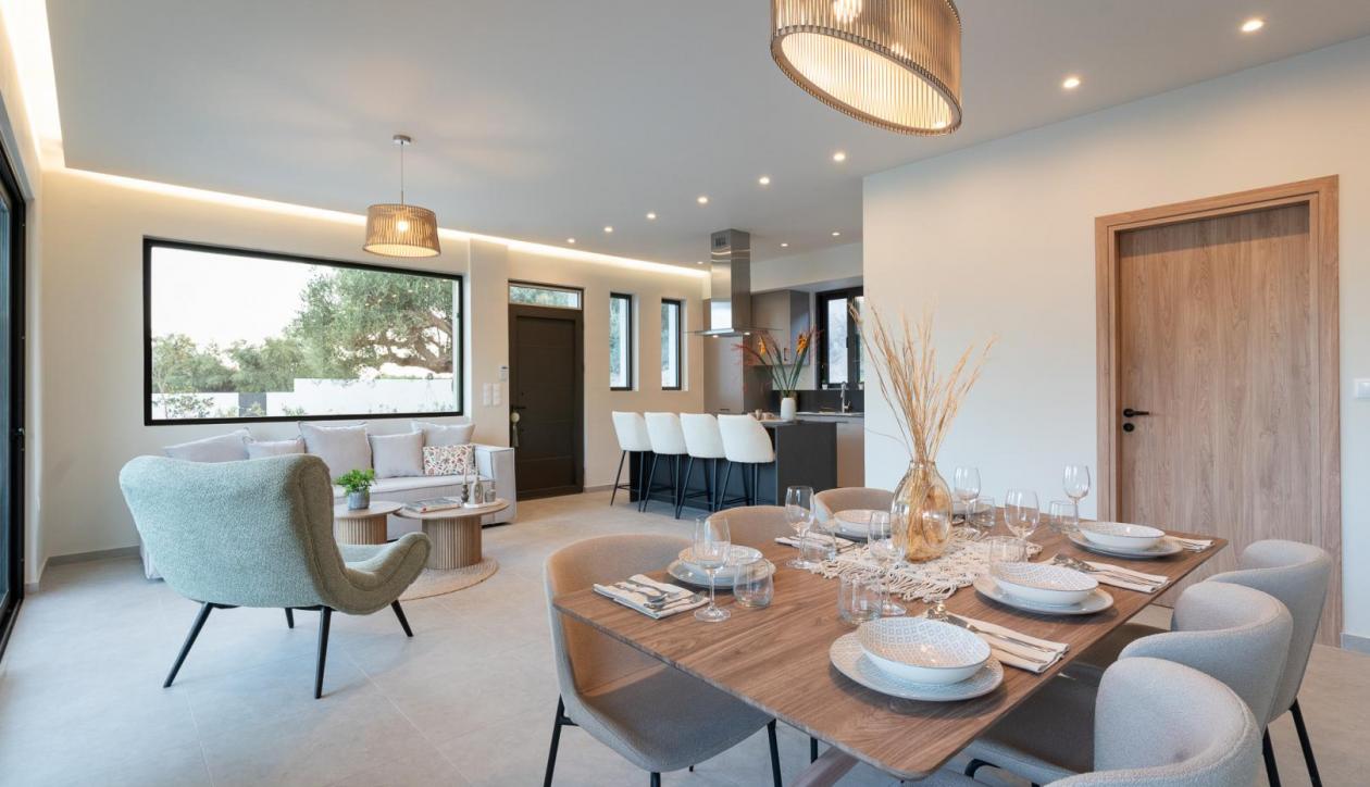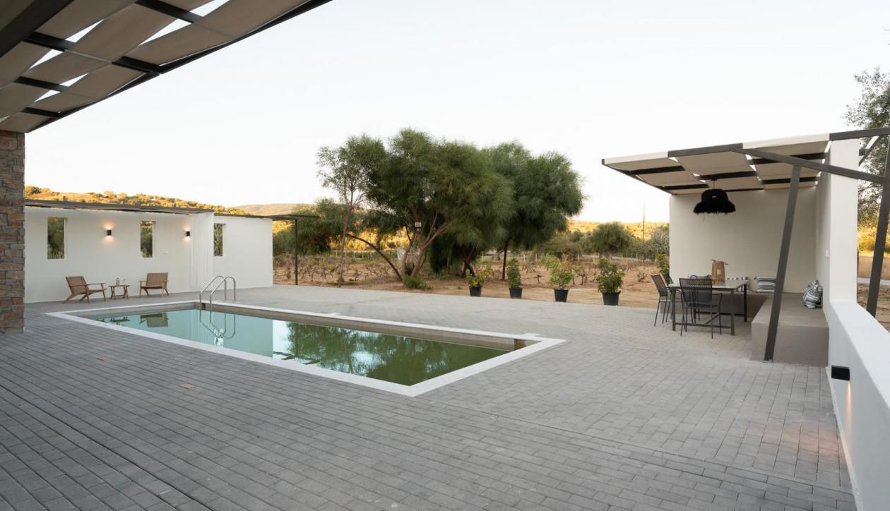 Set on an expansive plot, the grounds include flourishing vineyards of 2,500 sqm and ten olive trees. With a south-facing orientation, the estate enjoys abundant natural light throughout the day, enhancing both indoor and outdoor living spaces.