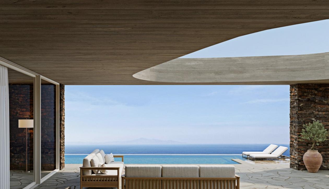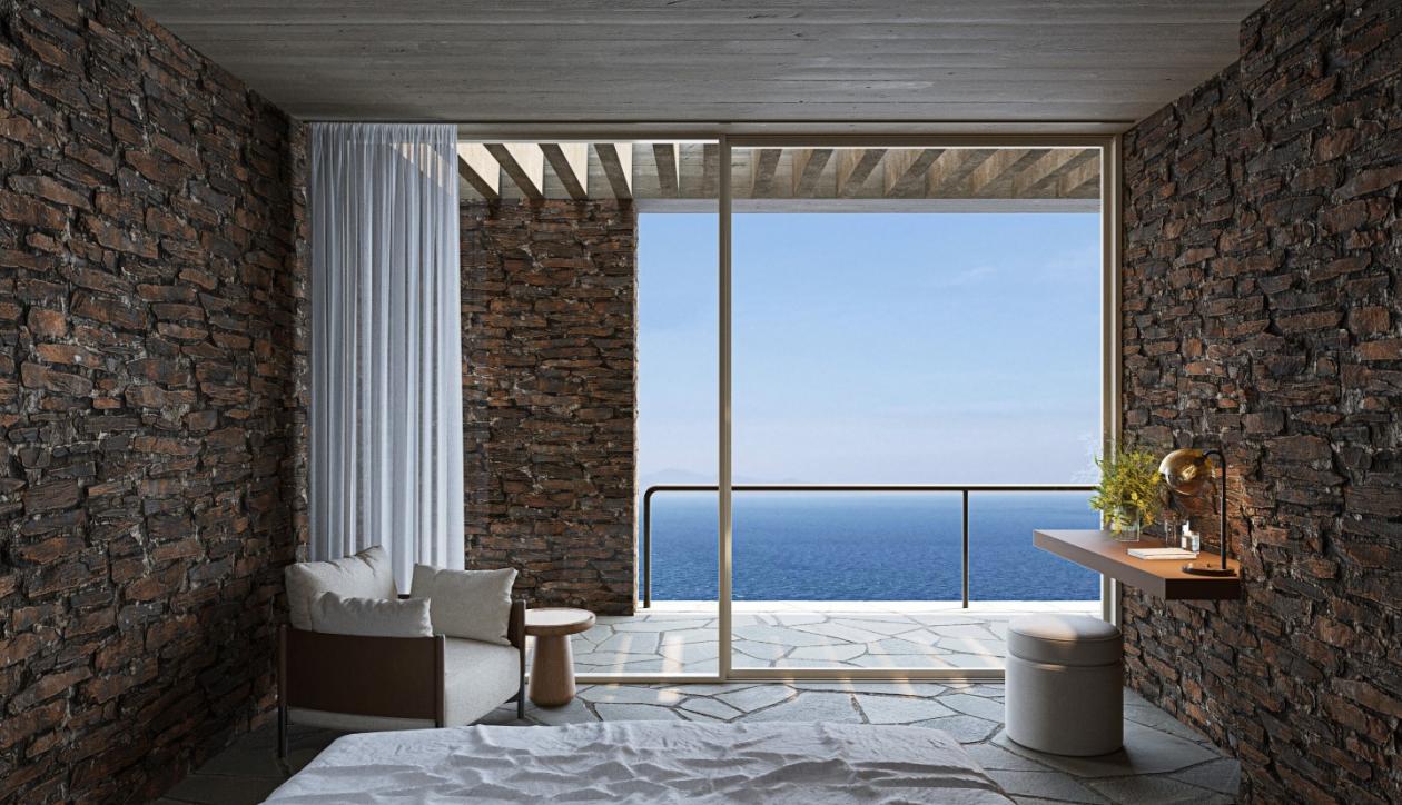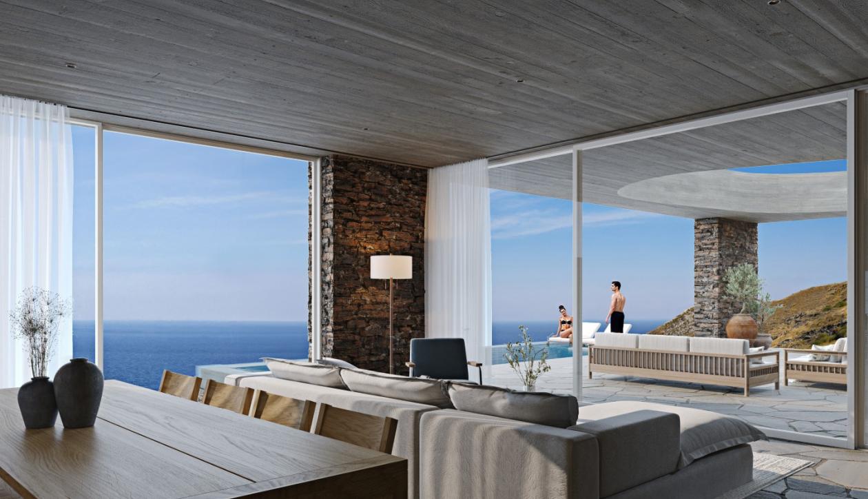 Outdoors, the experience is equally captivating. A terrace invites you to unwind and soak in panoramic sea vistas, offering the perfect setting for alfresco dining and entertaining.