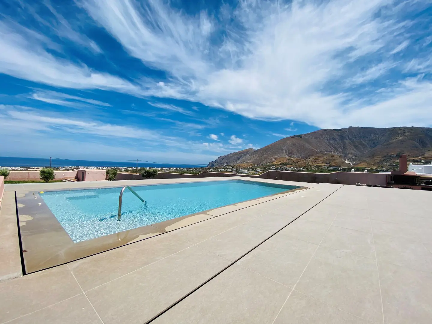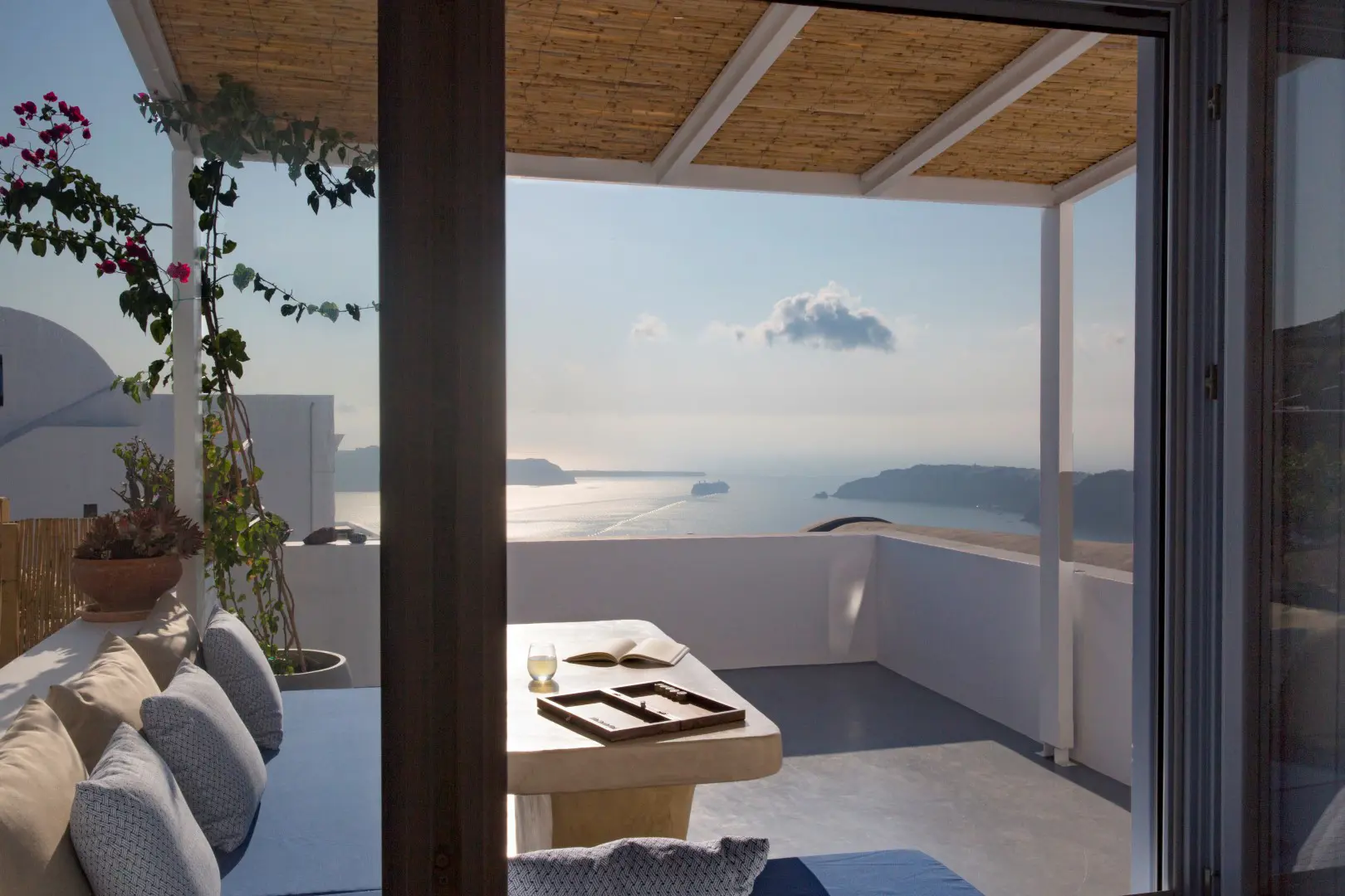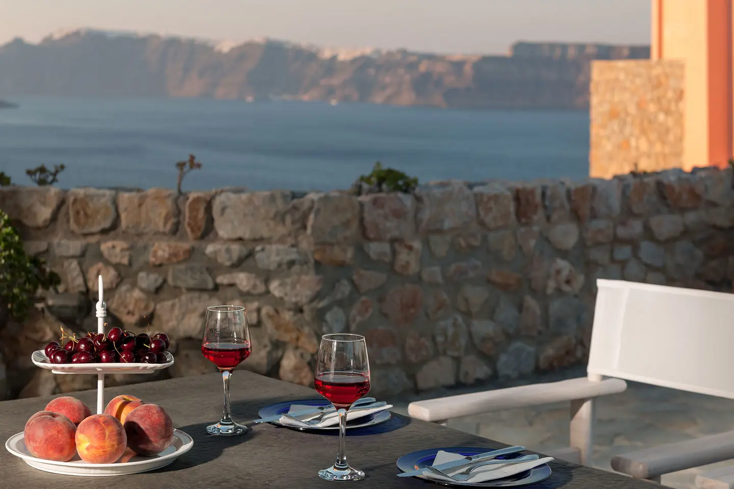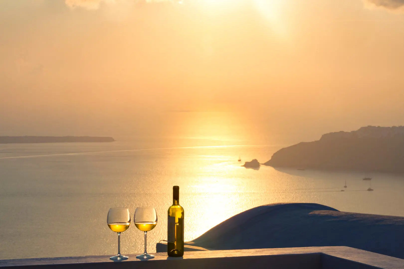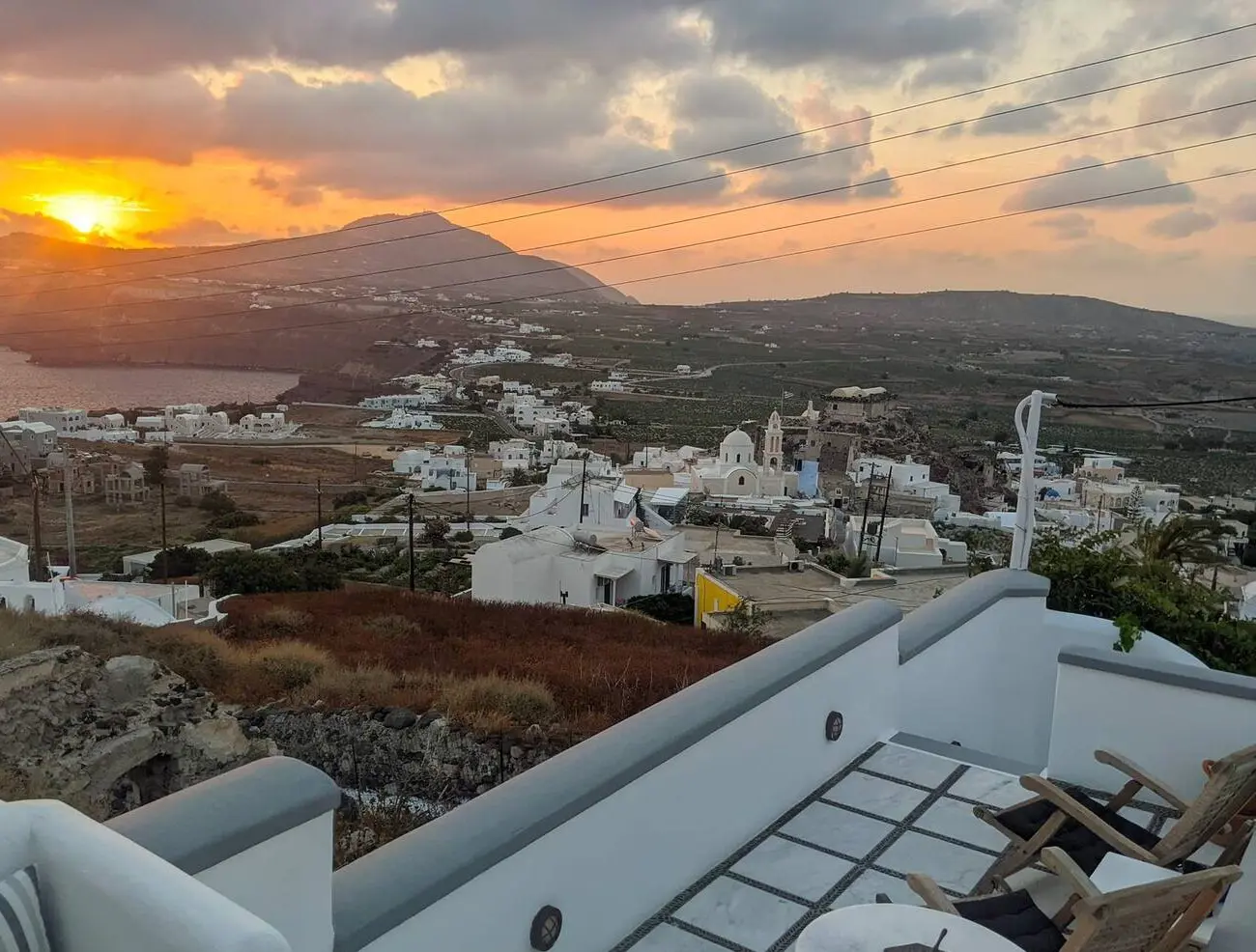 Panoramic views properties of the azure Aegean Sea and the world-famous Santorini sunset