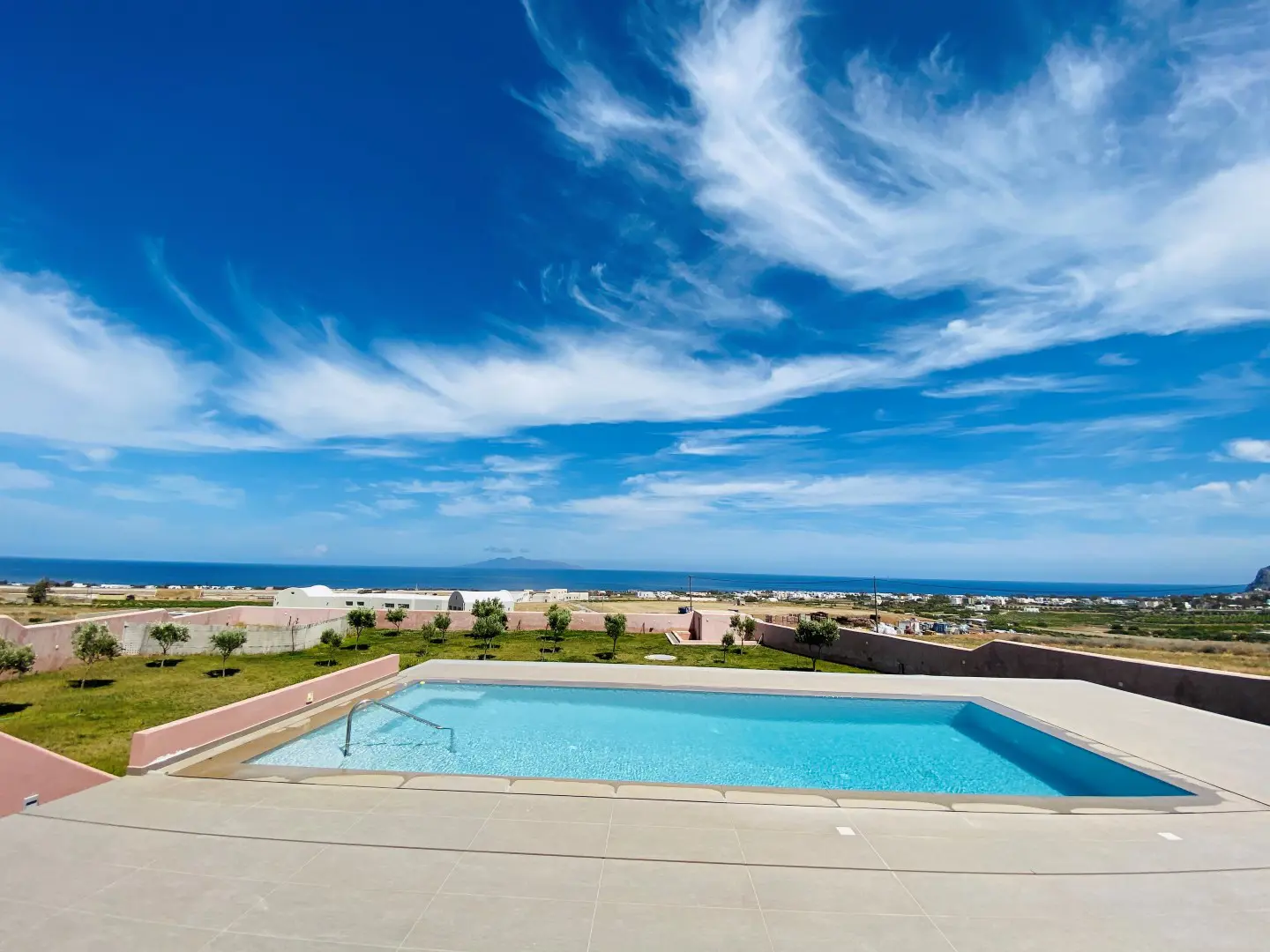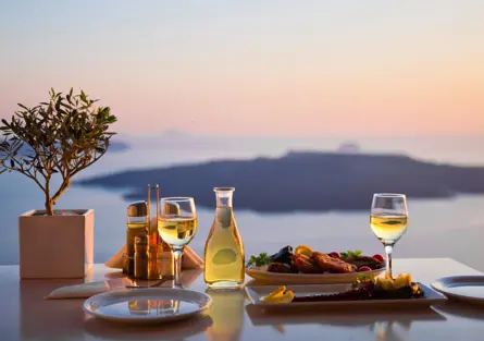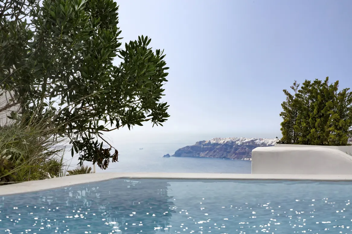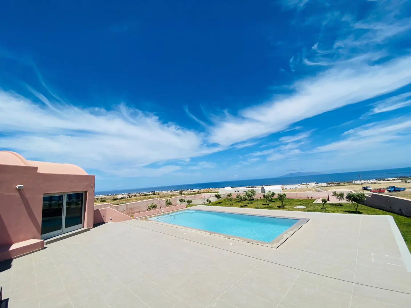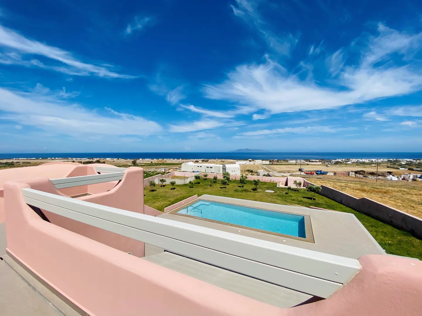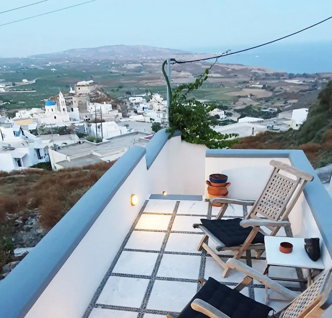Panoramic views properties of the azure Aegean Sea and the world-famous Santorini sunset