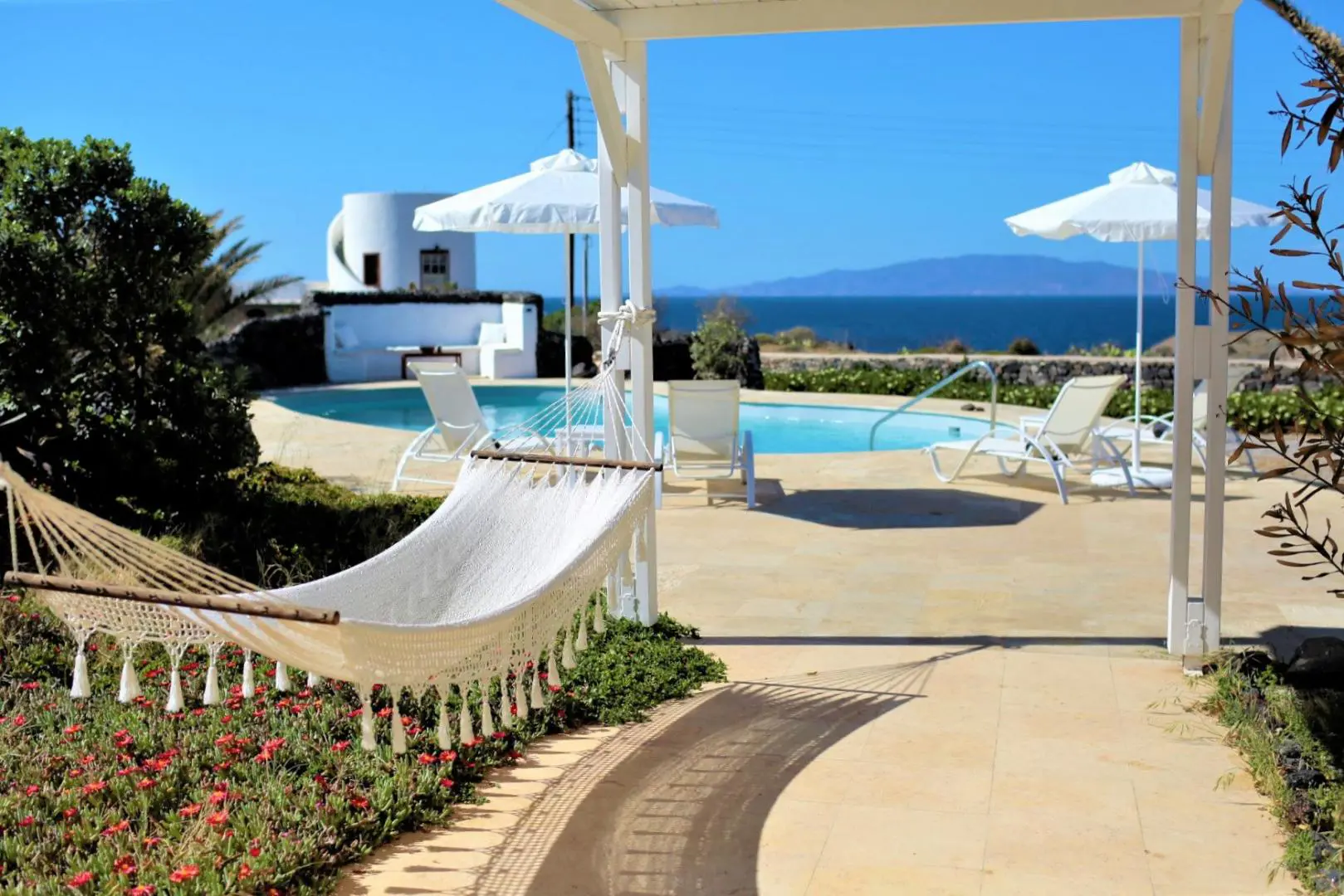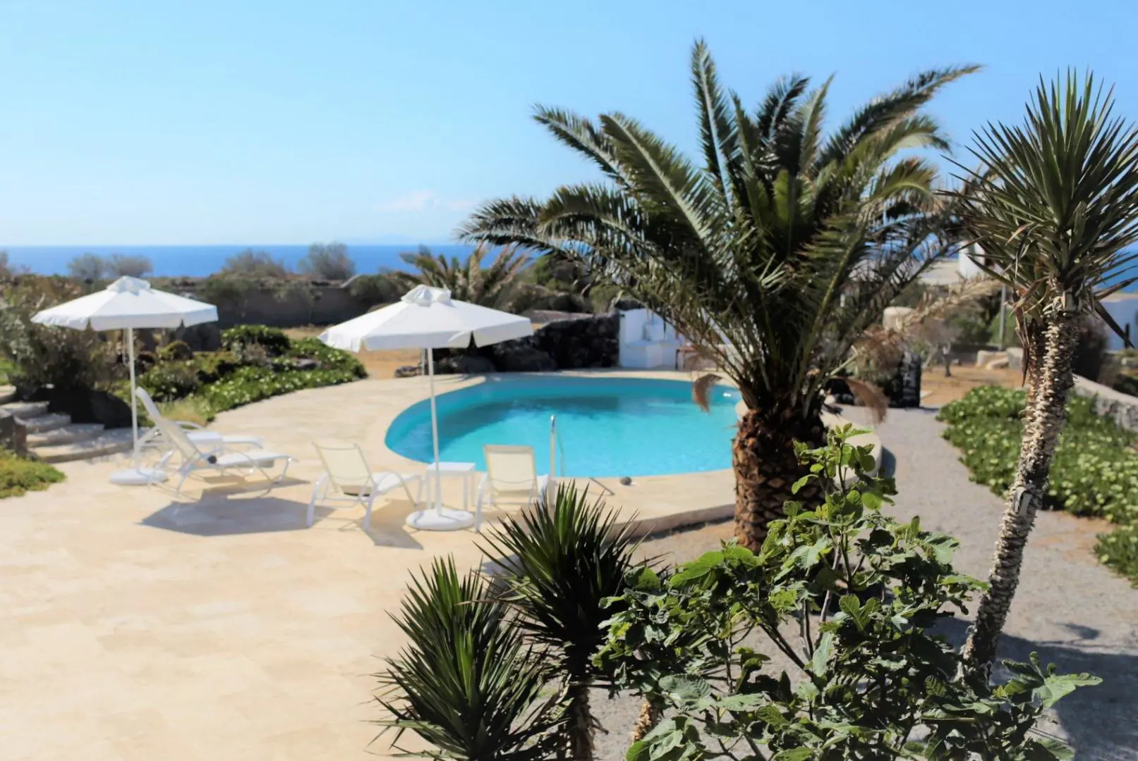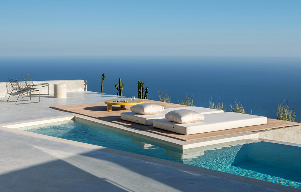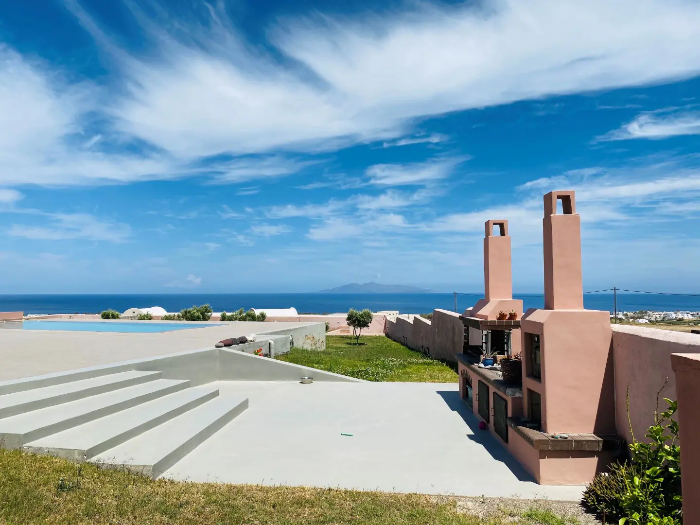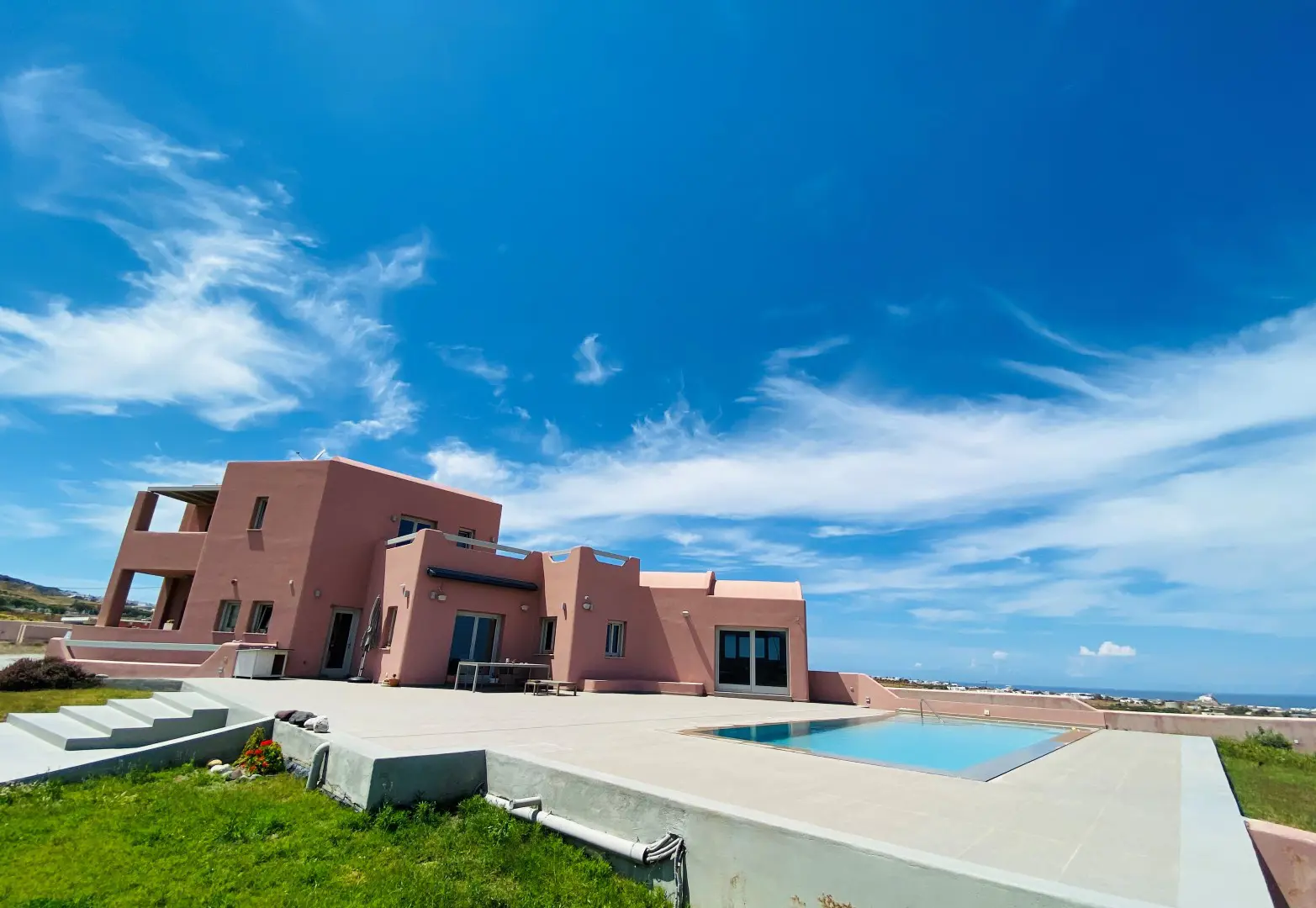 Panoramic views properties of the azure Aegean Sea and the world-famous Santorini sunset