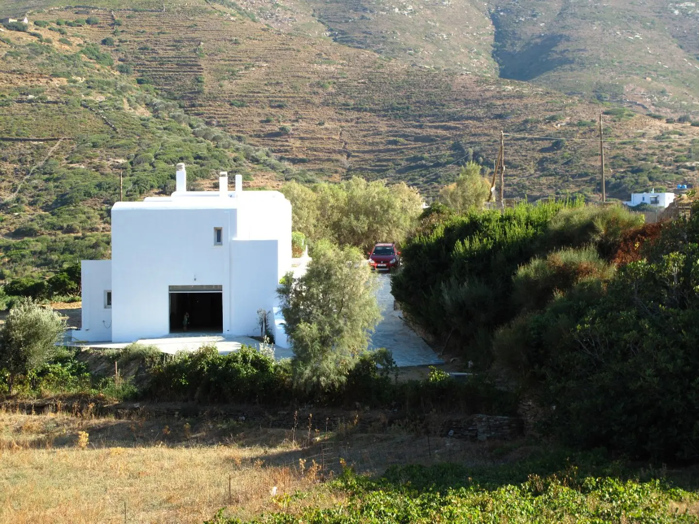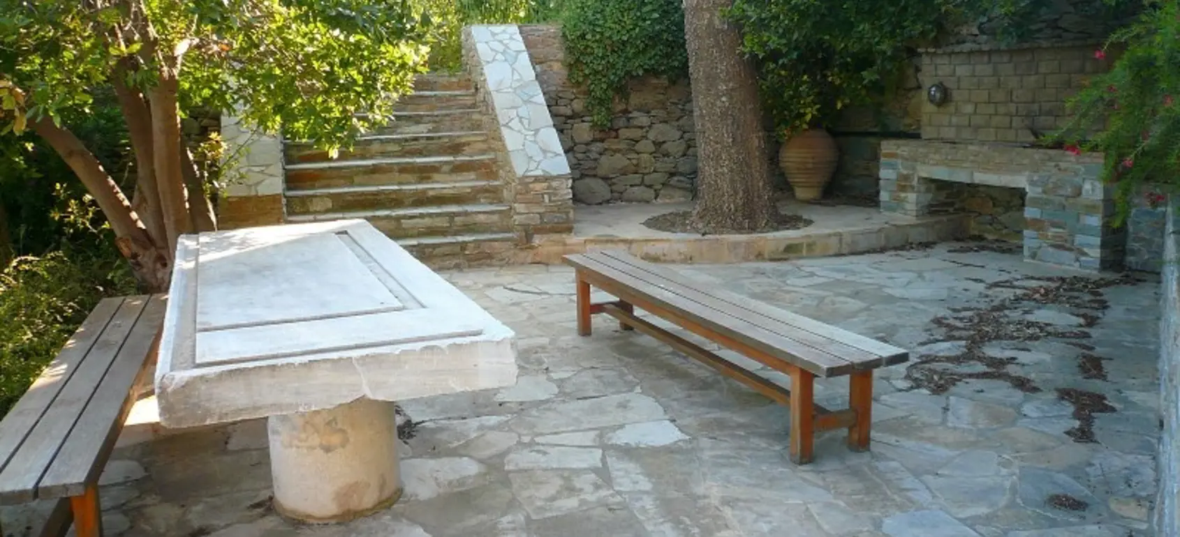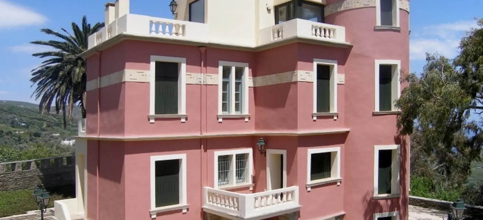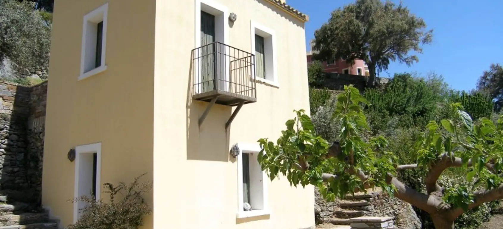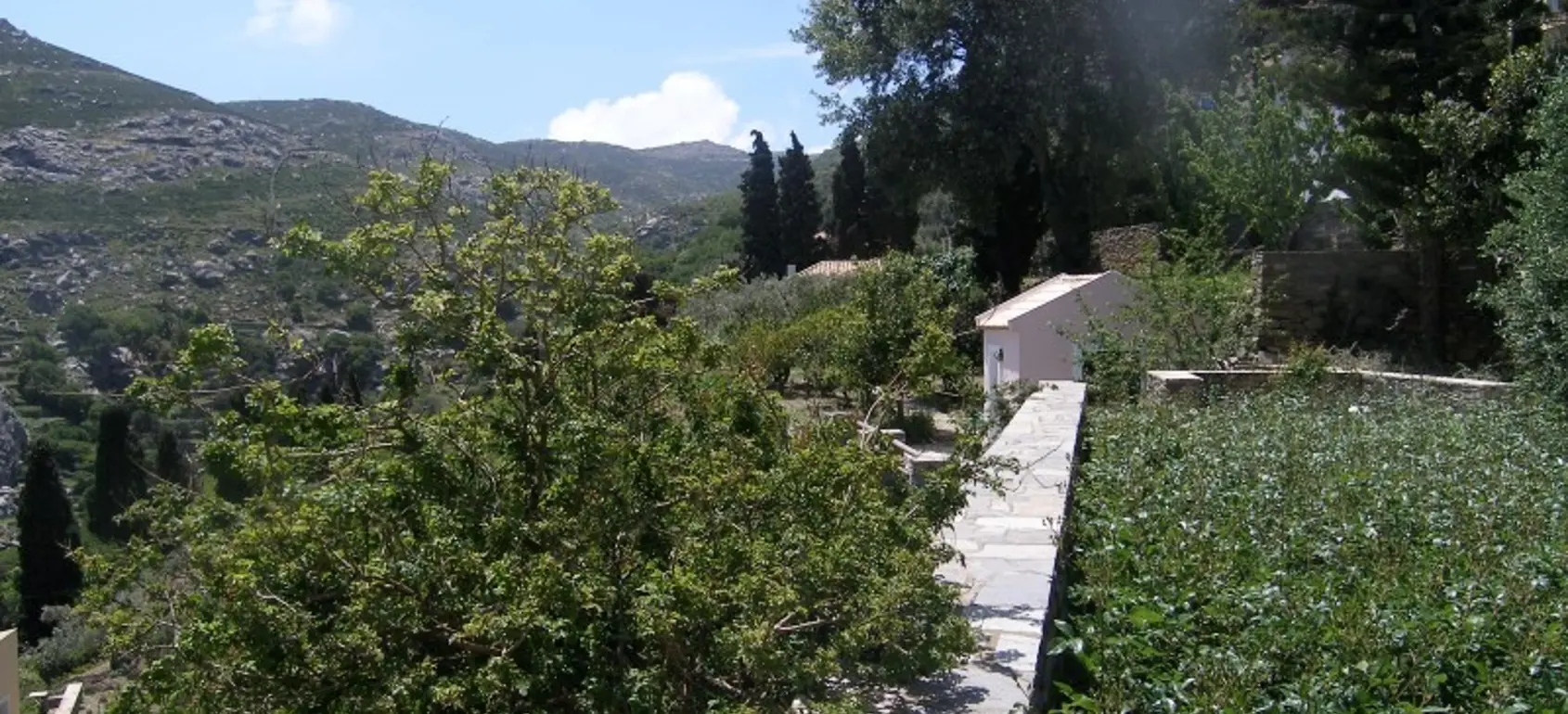 The property is situated on the hill slope of Apoikia, close to the Sariza spring famous for its mineral water, and offers panoramic views of the Aegean Sea and the surrounding hills. It contains the main residence, two old farm houses that have been turned into guest houses and a storehouse. It was built in the ‘40s and its architectural style refers to the noble tower-houses prominent in Andros over the course of three centuries (from 17th to the 19th). They belonged to the families of sea captains and were built in selected inland spots, thus offering protection from pirate invasions. They are characterized by a rectangular layout and they usually comprise three levels and a terrace. The residence has been fully renovated and has a central heating, two fireplaces and a fully equipped kitchen. The garden surrounding the residence and the total landscaping of the plot are a source of delight for the senses. The space around the main residence and the guesthouses is enclosed with a stone fence and has been paved with local stone interrupted by wonderful flower-beds. It has outdoor sitting facilities including a beautiful white marble dinner table, a BBQ and a large parking area. The rest of the plot is divided into terraces supported by dry stone walls that follow the inclination of the ground and is filled with olive and citrus fruit trees, flower and vegetable gardens.