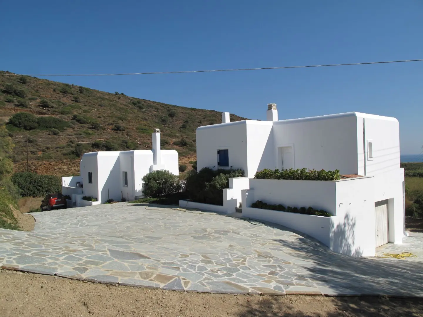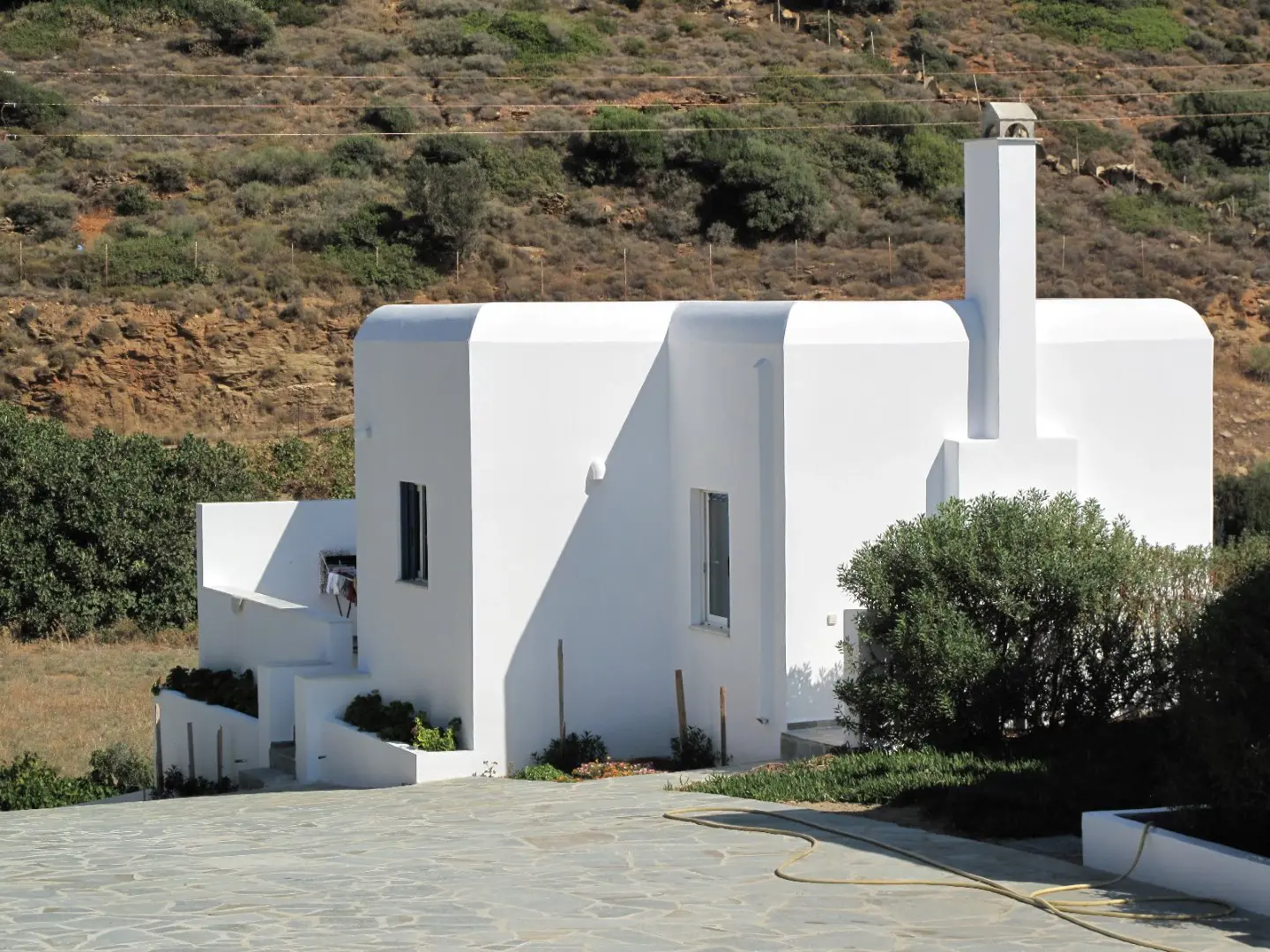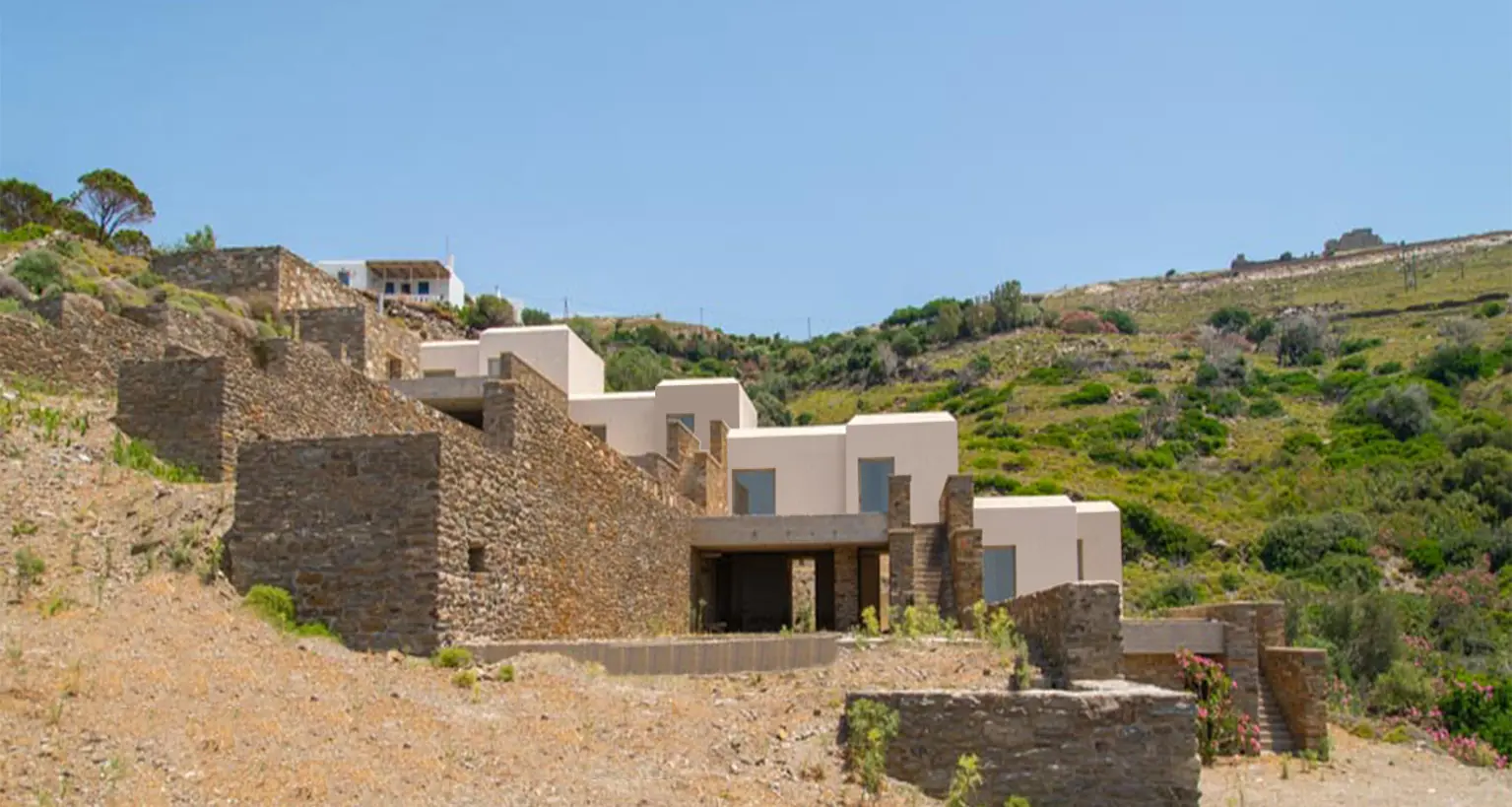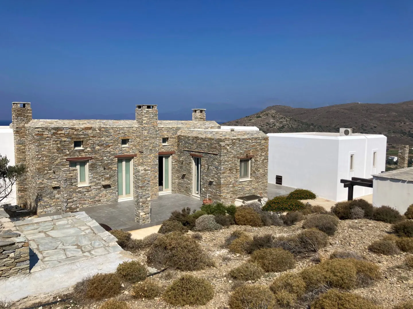 The property is situated on the hill slope of Apoikia, close to the Sariza spring famous for its mineral water, and offers panoramic views of the Aegean Sea and the surrounding hills. It contains the main residence, two old farm houses that have been turned into guest houses and a storehouse. It was built in the ‘40s and its architectural style refers to the noble tower-houses prominent in Andros over the course of three centuries (from 17th to the 19th). They belonged to the families of sea captains and were built in selected inland spots, thus offering protection from pirate invasions. They are characterized by a rectangular layout and they usually comprise three levels and a terrace. The residence has been fully renovated and has a central heating, two fireplaces and a fully equipped kitchen. The garden surrounding the residence and the total landscaping of the plot are a source of delight for the senses. The space around the main residence and the guesthouses is enclosed with a stone fence and has been paved with local stone interrupted by wonderful flower-beds. It has outdoor sitting facilities including a beautiful white marble dinner table, a BBQ and a large parking area. The rest of the plot is divided into terraces supported by dry stone walls that follow the inclination of the ground and is filled with olive and citrus fruit trees, flower and vegetable gardens.