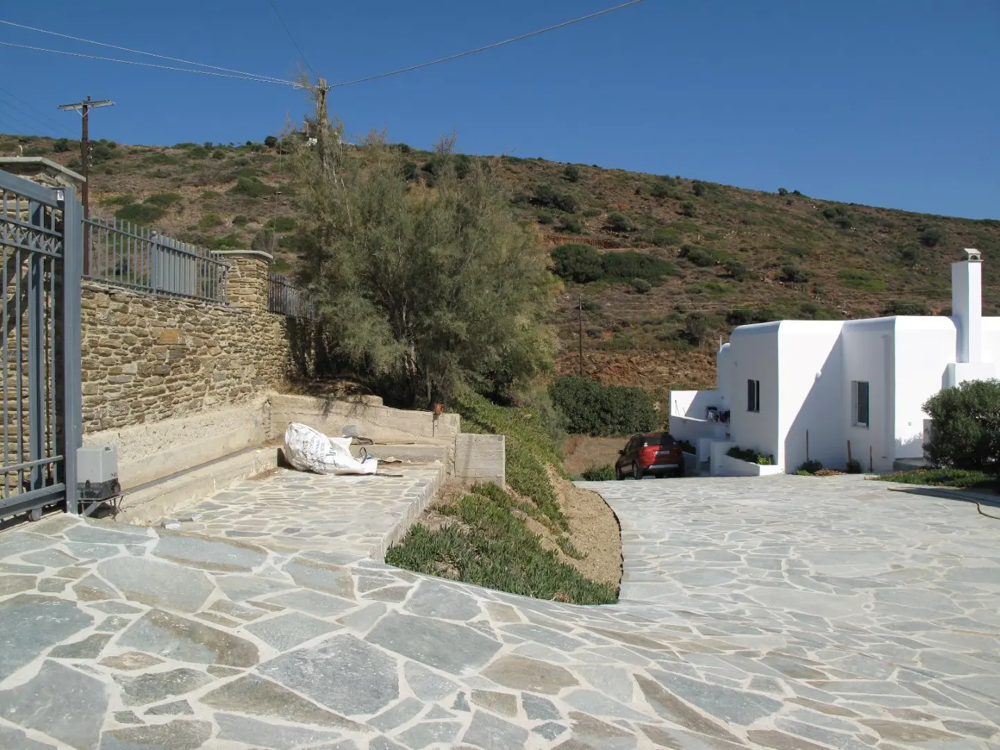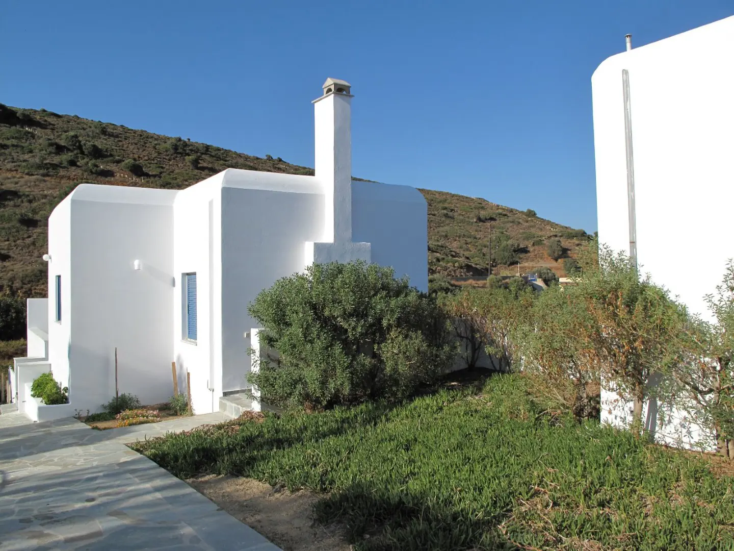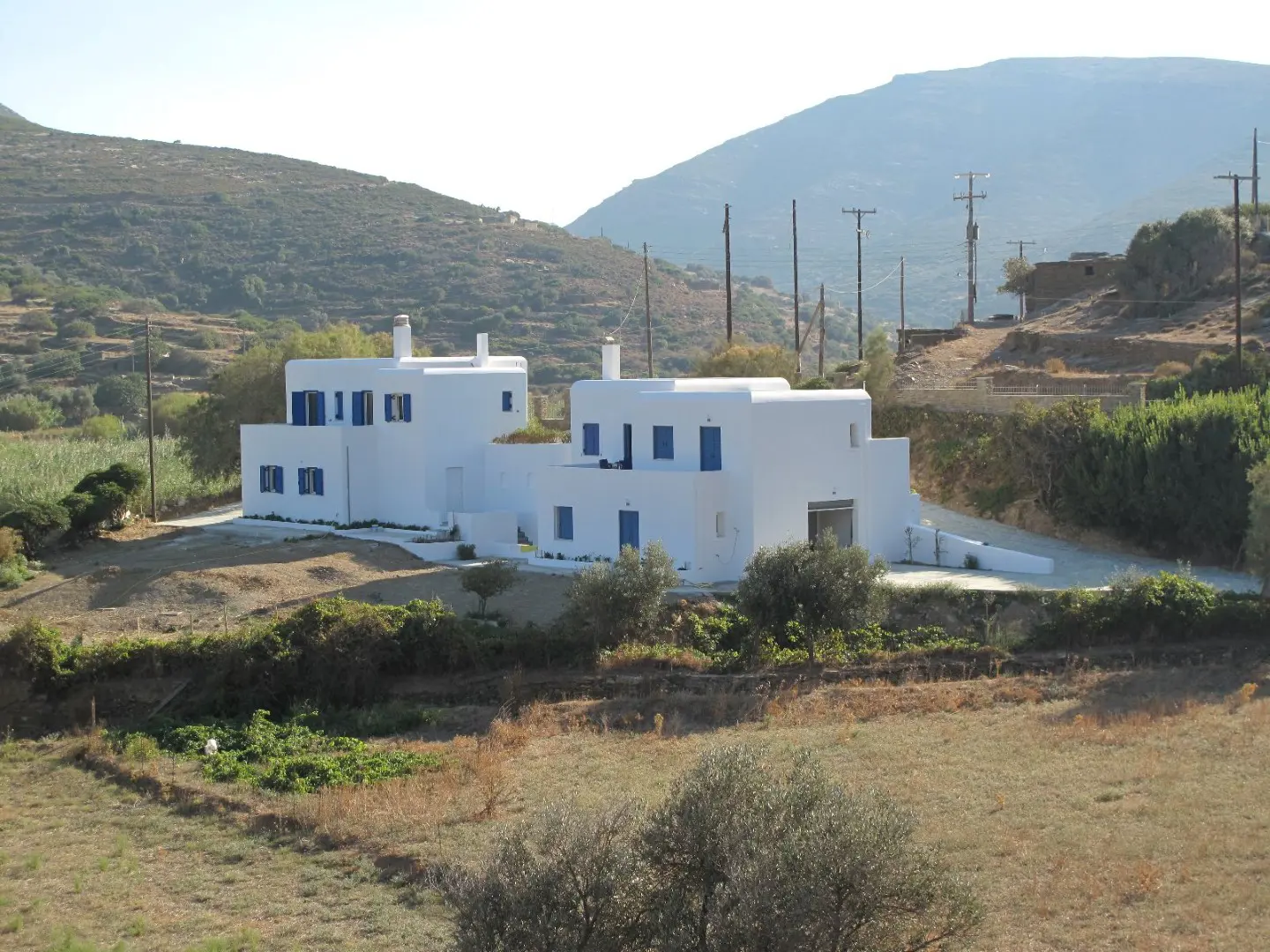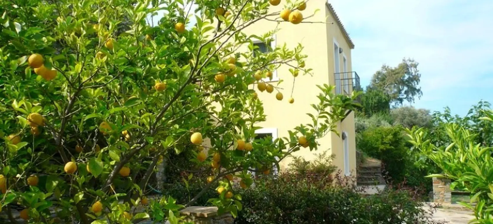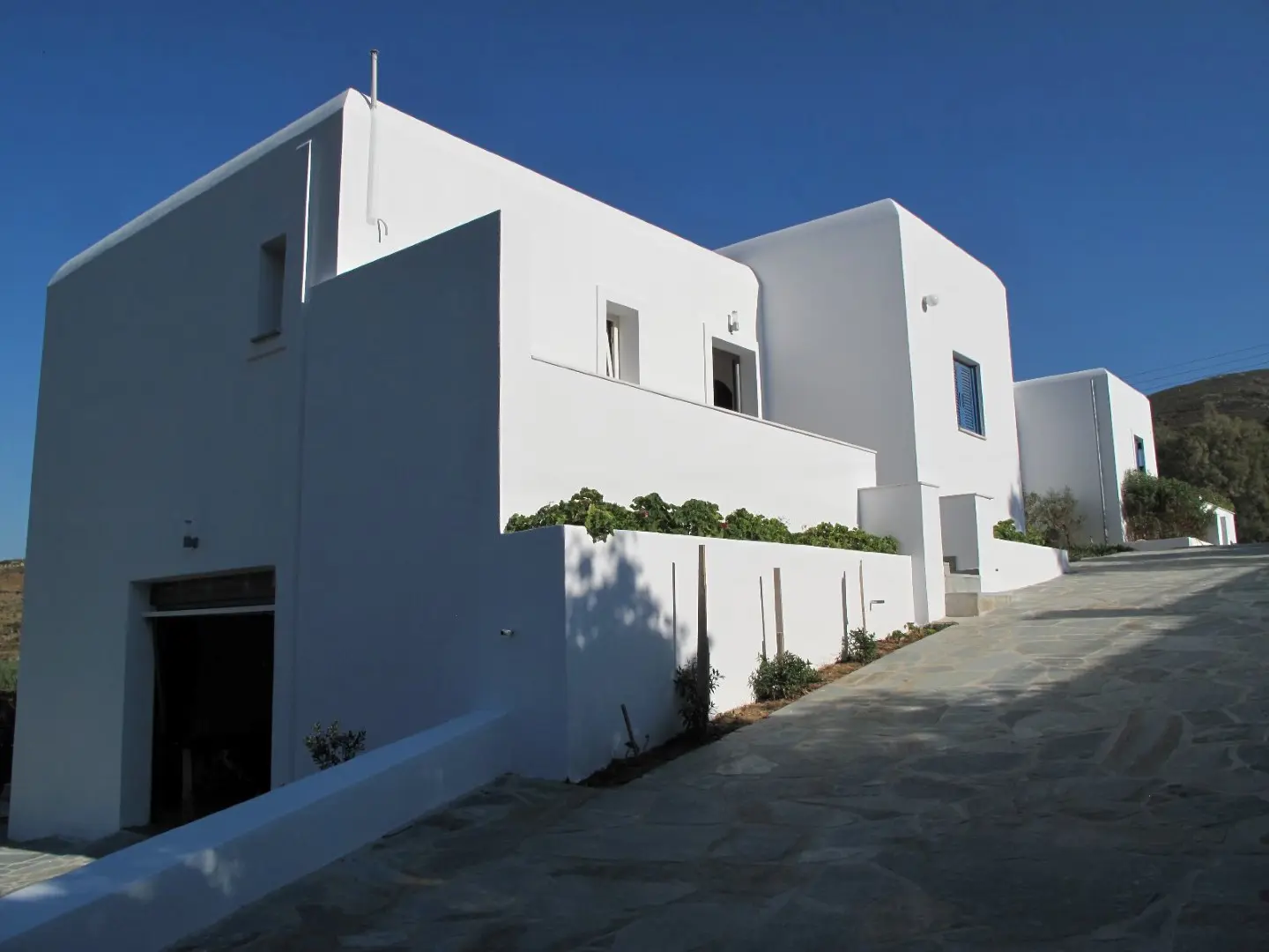 The property is situated on the hill slope of Apoikia, close to the Sariza spring famous for its mineral water, and offers panoramic views of the Aegean Sea and the surrounding hills. It contains the main residence, two old farm houses that have been turned into guest houses and a storehouse. It was built in the ‘40s and its architectural style refers to the noble tower-houses prominent in Andros over the course of three centuries (from 17th to the 19th). They belonged to the families of sea captains and were built in selected inland spots, thus offering protection from pirate invasions. They are characterized by a rectangular layout and they usually comprise three levels and a terrace. The residence has been fully renovated and has a central heating, two fireplaces and a fully equipped kitchen. The garden surrounding the residence and the total landscaping of the plot are a source of delight for the senses. The space around the main residence and the guesthouses is enclosed with a stone fence and has been paved with local stone interrupted by wonderful flower-beds. It has outdoor sitting facilities including a beautiful white marble dinner table, a BBQ and a large parking area. The rest of the plot is divided into terraces supported by dry stone walls that follow the inclination of the ground and is filled with olive and citrus fruit trees, flower and vegetable gardens.