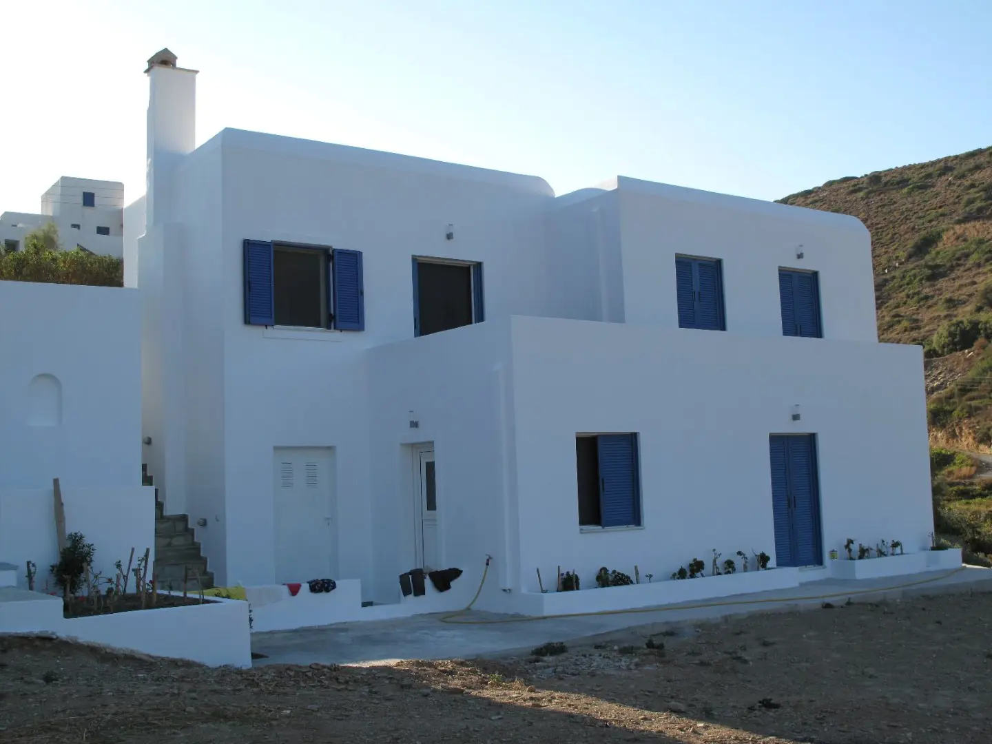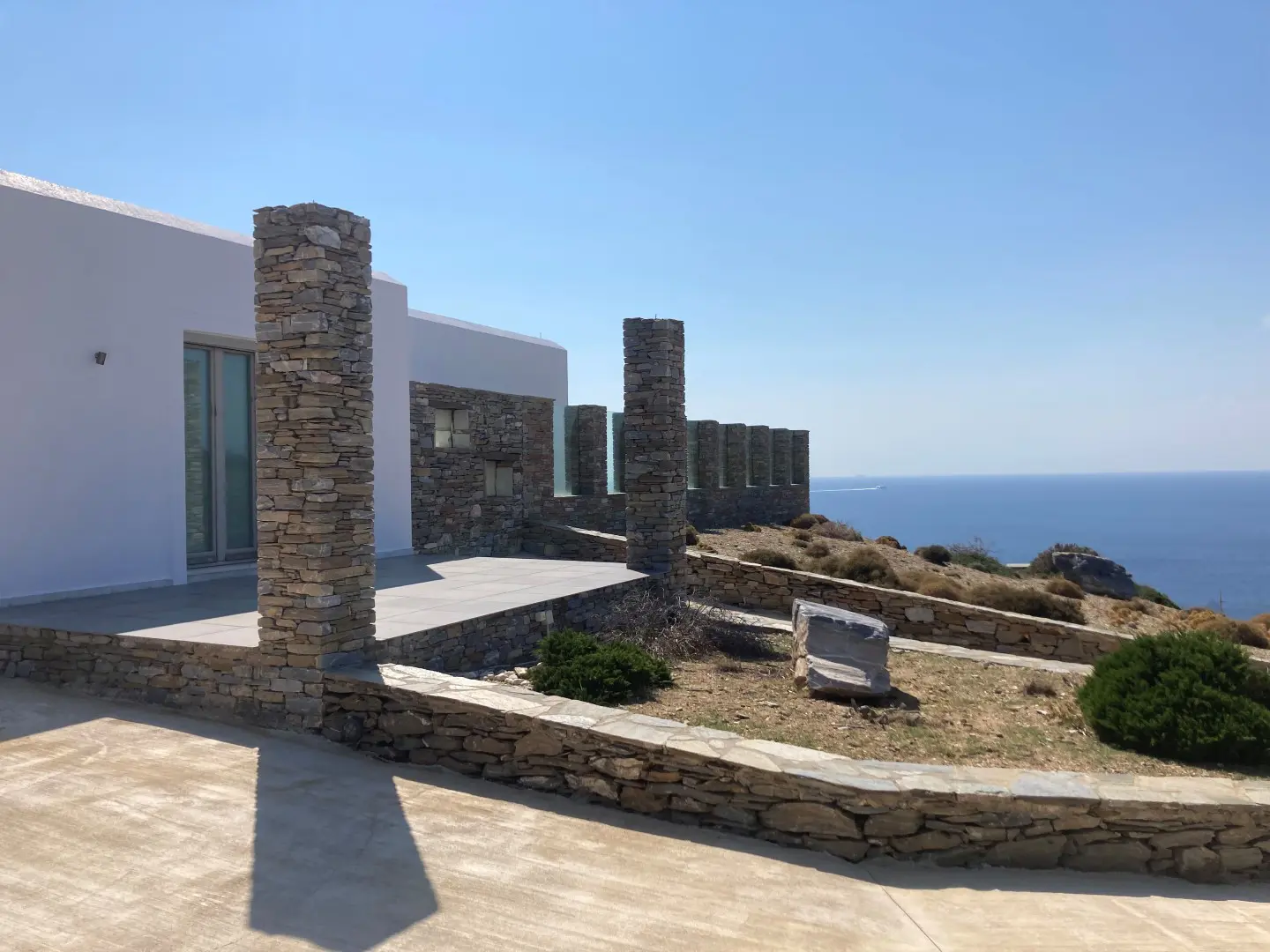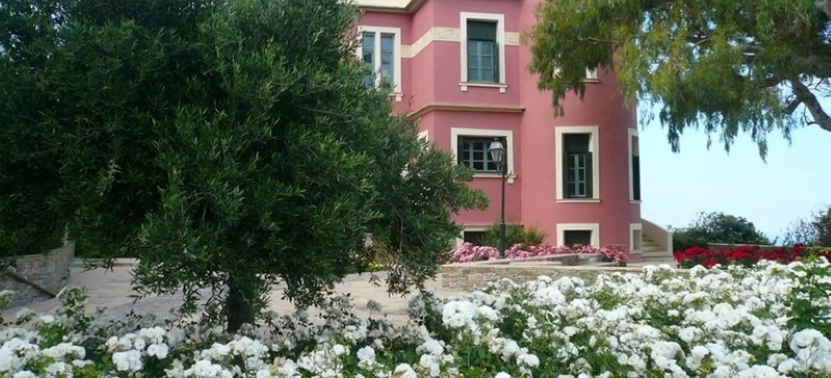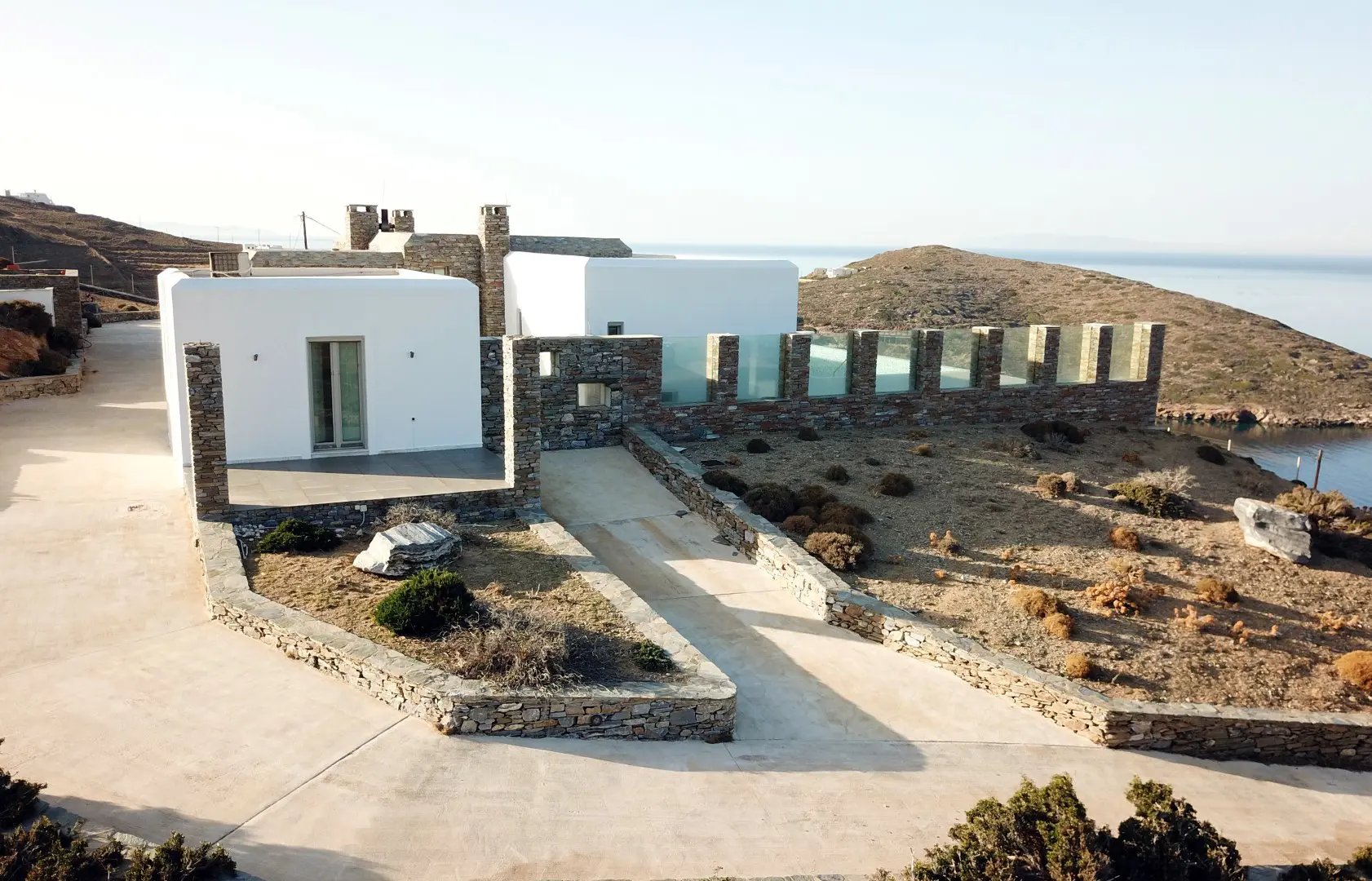The property is situated on the hill slope of Apoikia, close to the Sariza spring famous for its mineral water, and offers panoramic views of the Aegean Sea and the surrounding hills. It contains the main residence, two old farm houses that have been turned into guest houses and a storehouse. It was built in the ‘40s and its architectural style refers to the noble tower-houses prominent in Andros over the course of three centuries (from 17th to the 19th). They belonged to the families of sea captains and were built in selected inland spots, thus offering protection from pirate invasions. They are characterized by a rectangular layout and they usually comprise three levels and a terrace. The residence has been fully renovated and has a central heating, two fireplaces and a fully equipped kitchen. The garden surrounding the residence and the total landscaping of the plot are a source of delight for the senses. The space around the main residence and the guesthouses is enclosed with a stone fence and has been paved with local stone interrupted by wonderful flower-beds. It has outdoor sitting facilities including a beautiful white marble dinner table, a BBQ and a large parking area. The rest of the plot is divided into terraces supported by dry stone walls that follow the inclination of the ground and is filled with olive and citrus fruit trees, flower and vegetable gardens.