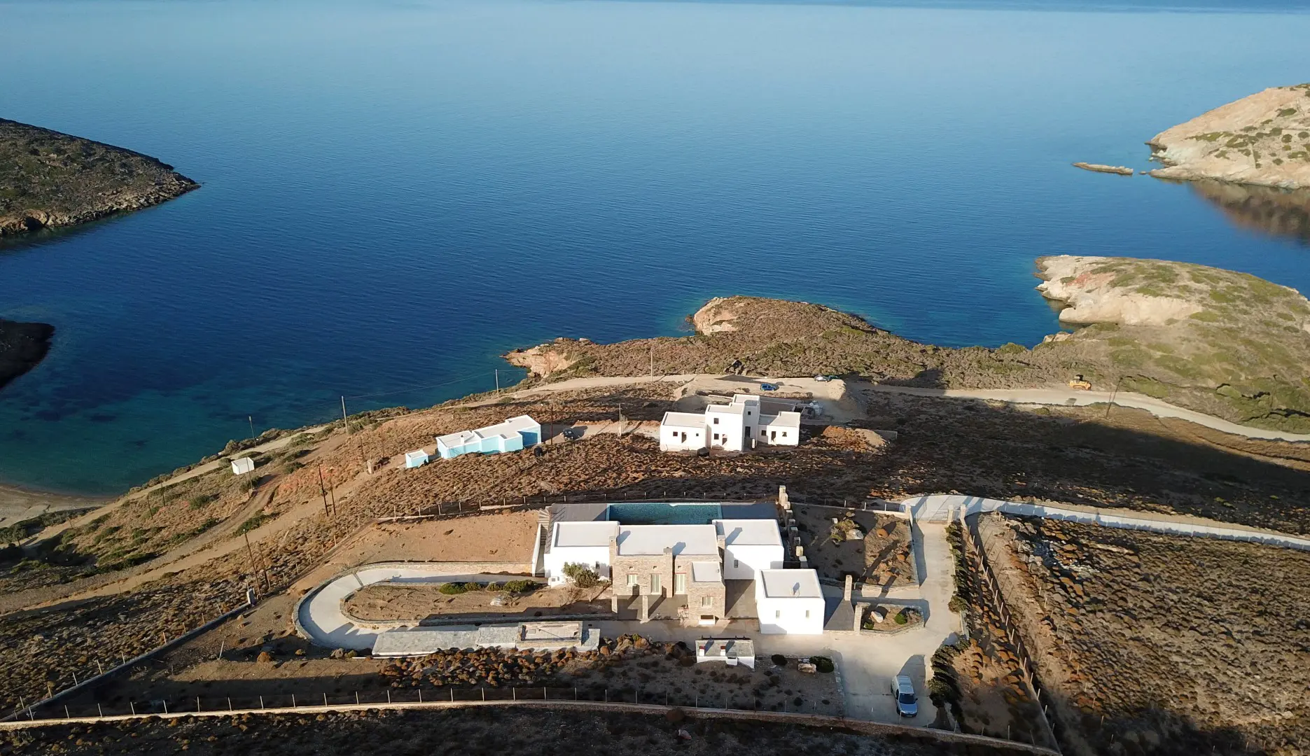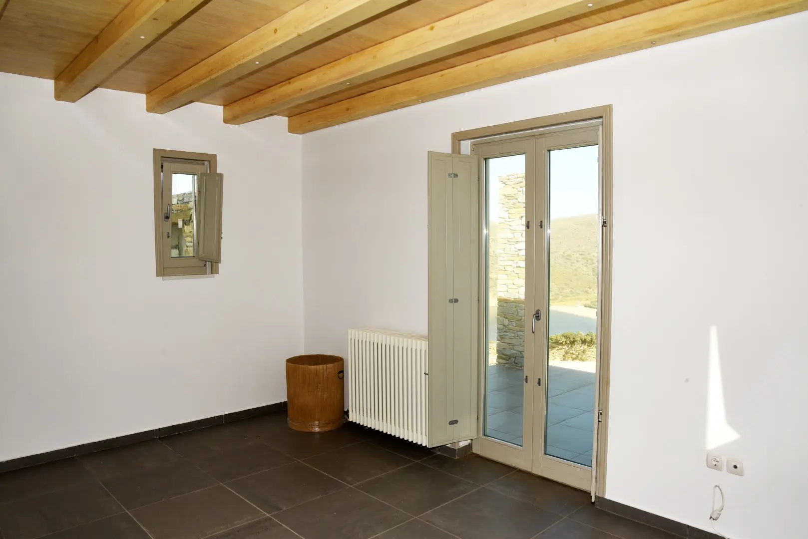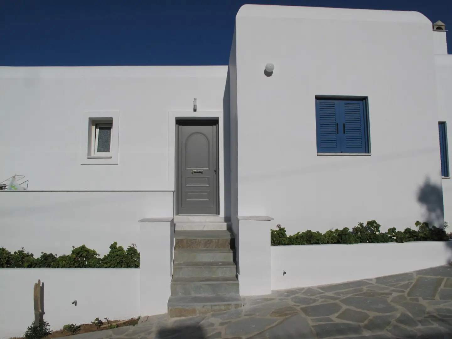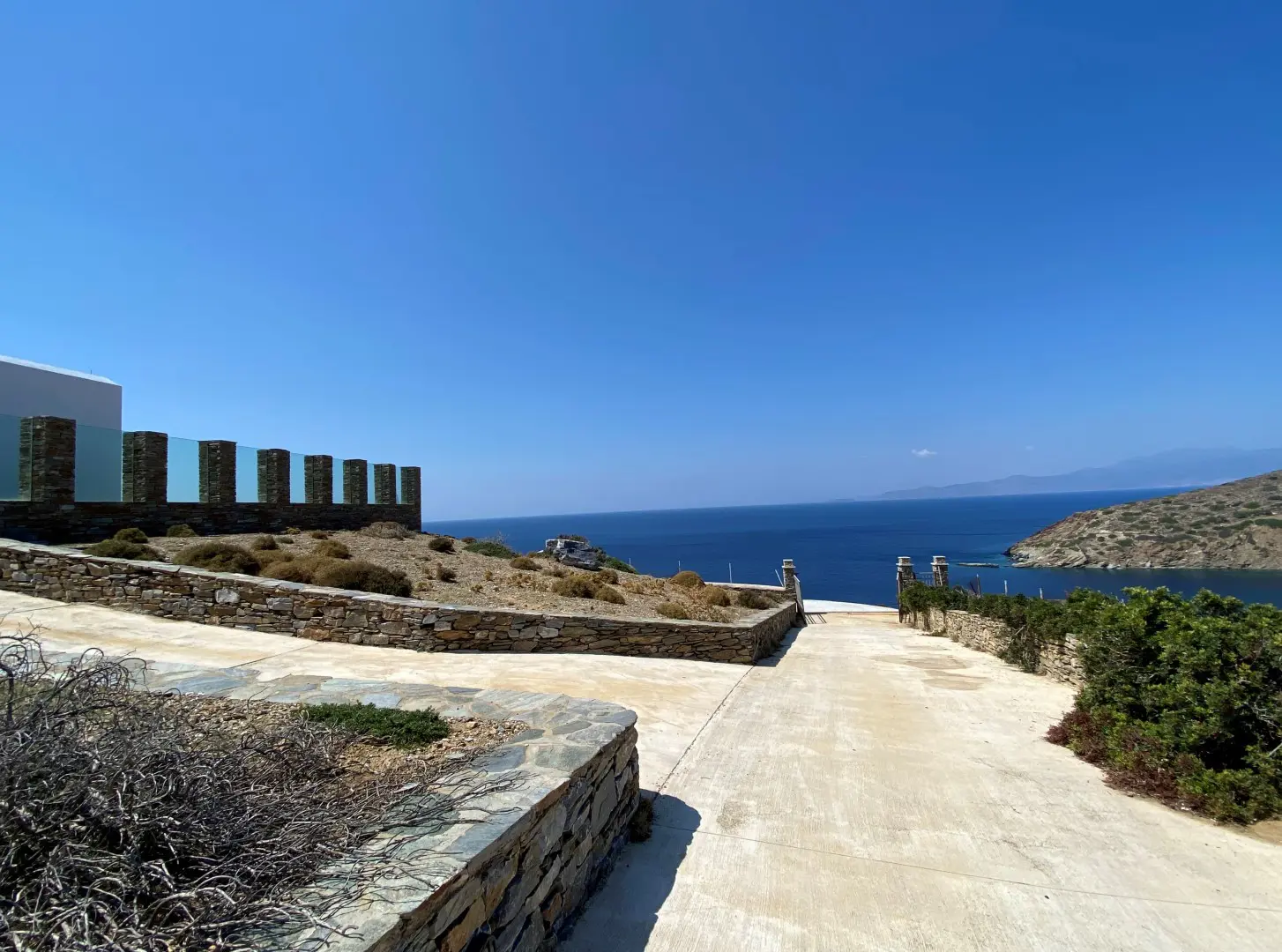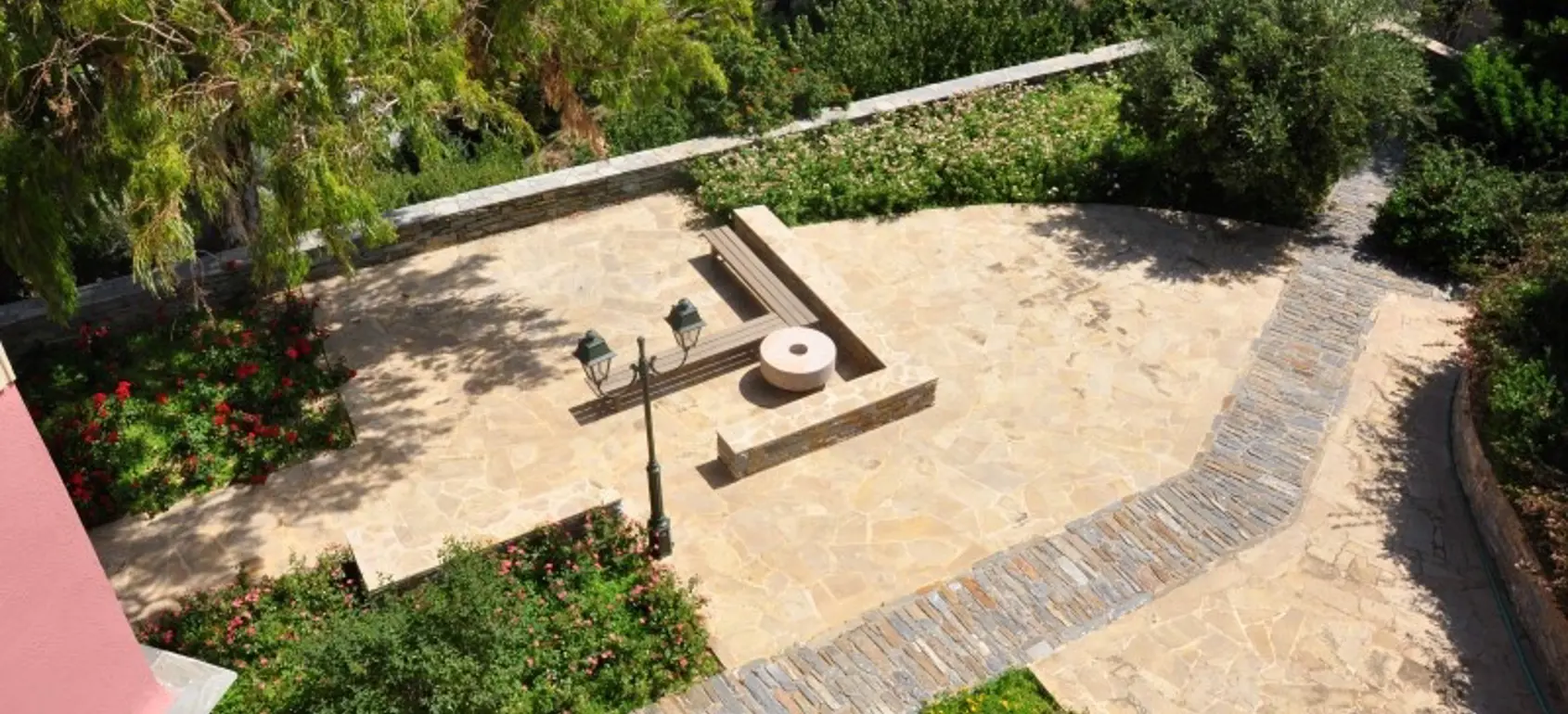 The property is situated on the hill slope of Apoikia, close to the Sariza spring famous for its mineral water, and offers panoramic views of the Aegean Sea and the surrounding hills. It contains the main residence, two old farm houses that have been turned into guest houses and a storehouse. It was built in the ‘40s and its architectural style refers to the noble tower-houses prominent in Andros over the course of three centuries (from 17th to the 19th). They belonged to the families of sea captains and were built in selected inland spots, thus offering protection from pirate invasions. They are characterized by a rectangular layout and they usually comprise three levels and a terrace. The residence has been fully renovated and has a central heating, two fireplaces and a fully equipped kitchen. The garden surrounding the residence and the total landscaping of the plot are a source of delight for the senses. The space around the main residence and the guesthouses is enclosed with a stone fence and has been paved with local stone interrupted by wonderful flower-beds. It has outdoor sitting facilities including a beautiful white marble dinner table, a BBQ and a large parking area. The rest of the plot is divided into terraces supported by dry stone walls that follow the inclination of the ground and is filled with olive and citrus fruit trees, flower and vegetable gardens.