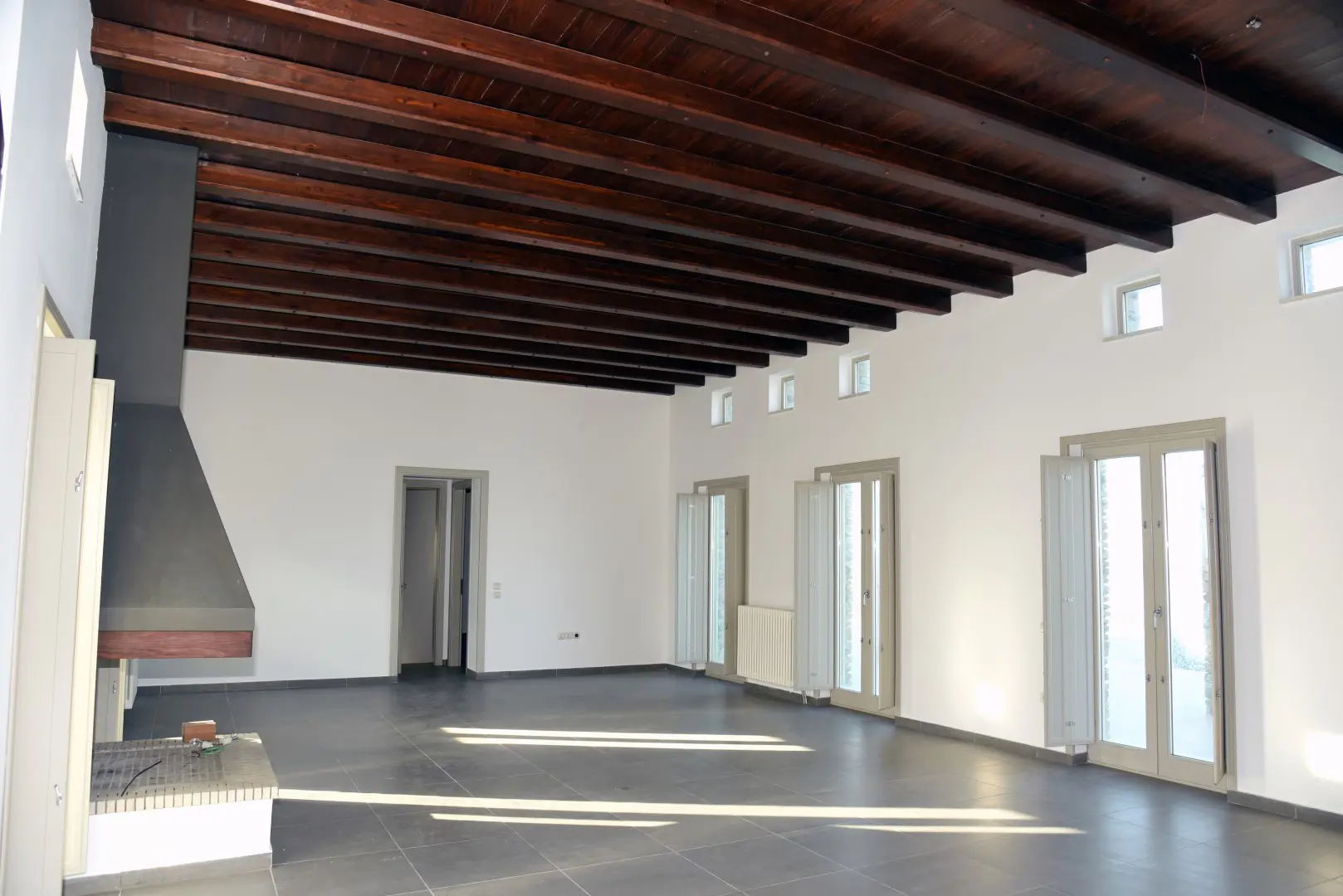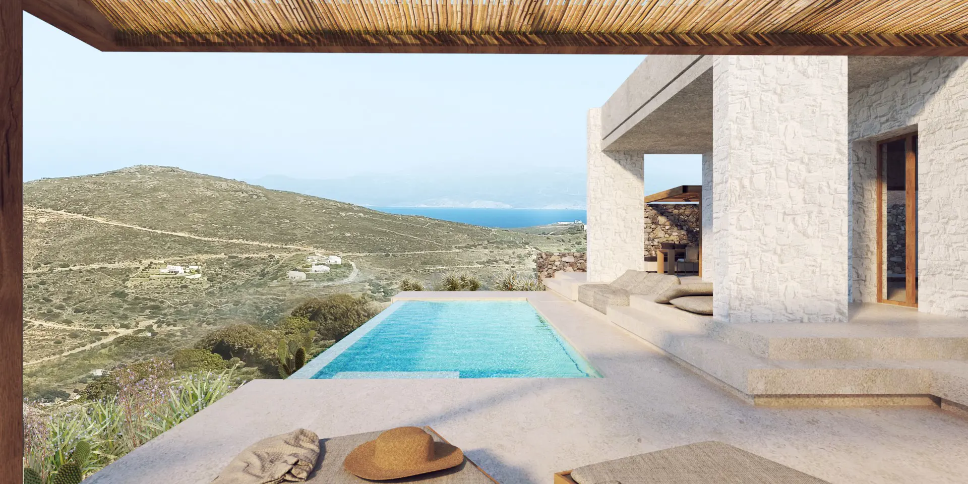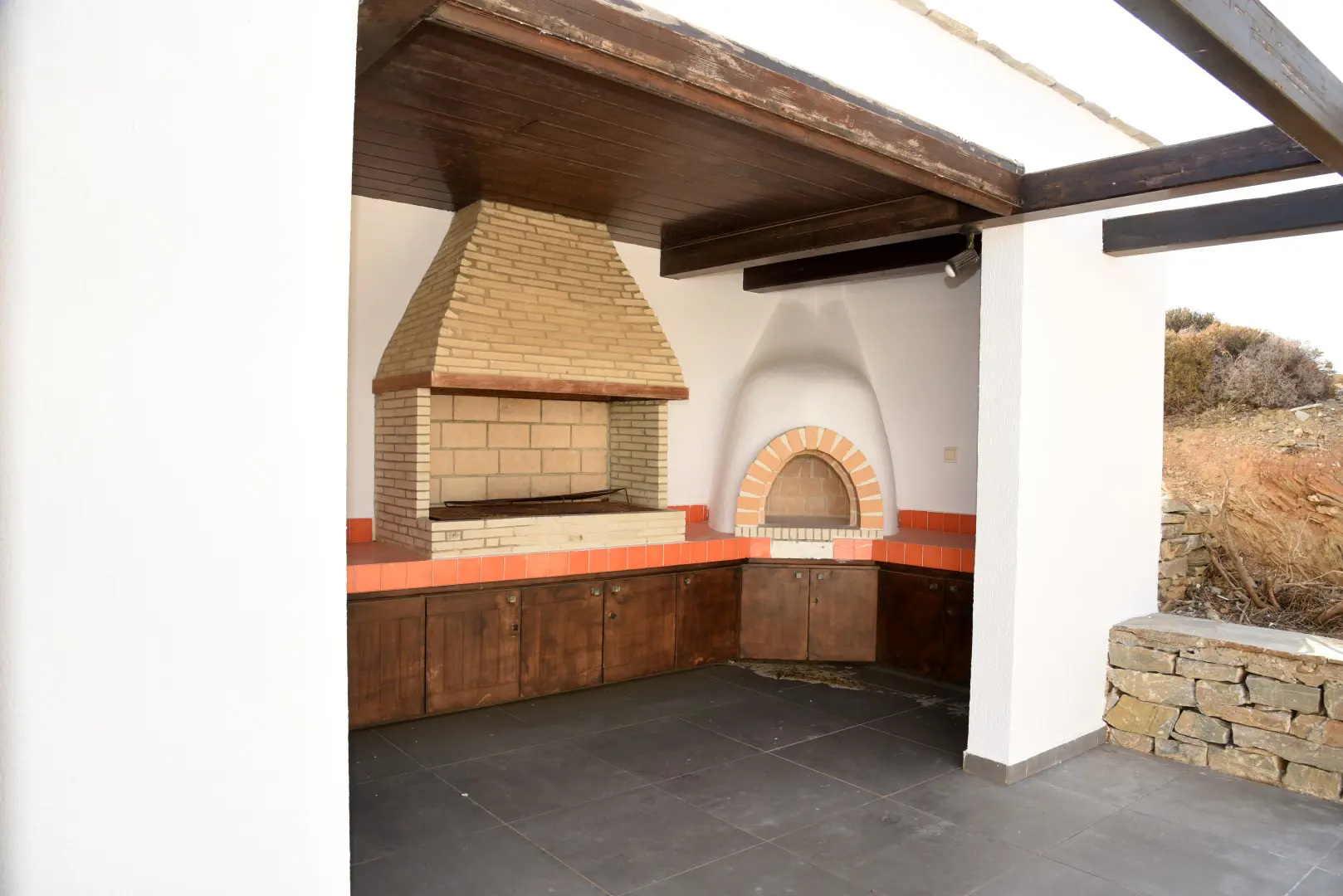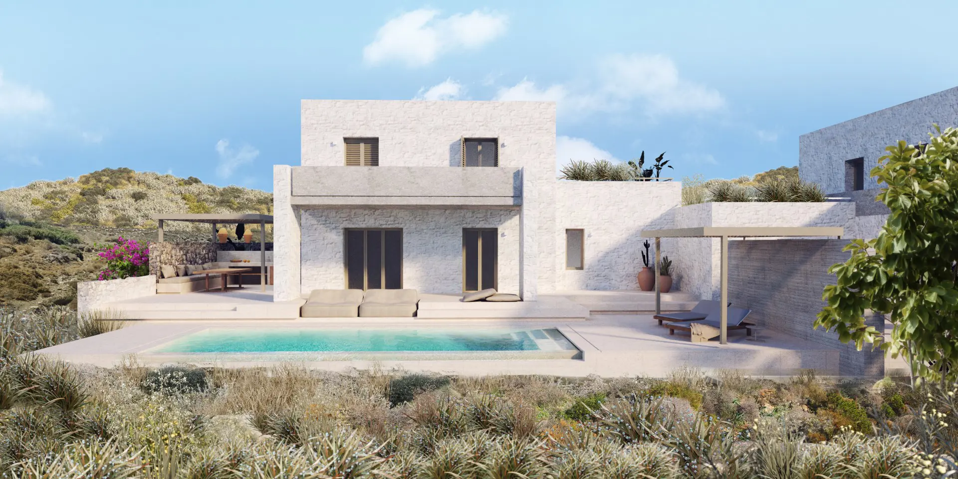 The property is situated on the hill slope of Apoikia, close to the Sariza spring famous for its mineral water, and offers panoramic views of the Aegean Sea and the surrounding hills. It contains the main residence, two old farm houses that have been turned into guest houses and a storehouse. It was built in the ‘40s and its architectural style refers to the noble tower-houses prominent in Andros over the course of three centuries (from 17th to the 19th). They belonged to the families of sea captains and were built in selected inland spots, thus offering protection from pirate invasions. They are characterized by a rectangular layout and they usually comprise three levels and a terrace. The residence has been fully renovated and has a central heating, two fireplaces and a fully equipped kitchen. The garden surrounding the residence and the total landscaping of the plot are a source of delight for the senses. The space around the main residence and the guesthouses is enclosed with a stone fence and has been paved with local stone interrupted by wonderful flower-beds. It has outdoor sitting facilities including a beautiful white marble dinner table, a BBQ and a large parking area. The rest of the plot is divided into terraces supported by dry stone walls that follow the inclination of the ground and is filled with olive and citrus fruit trees, flower and vegetable gardens.