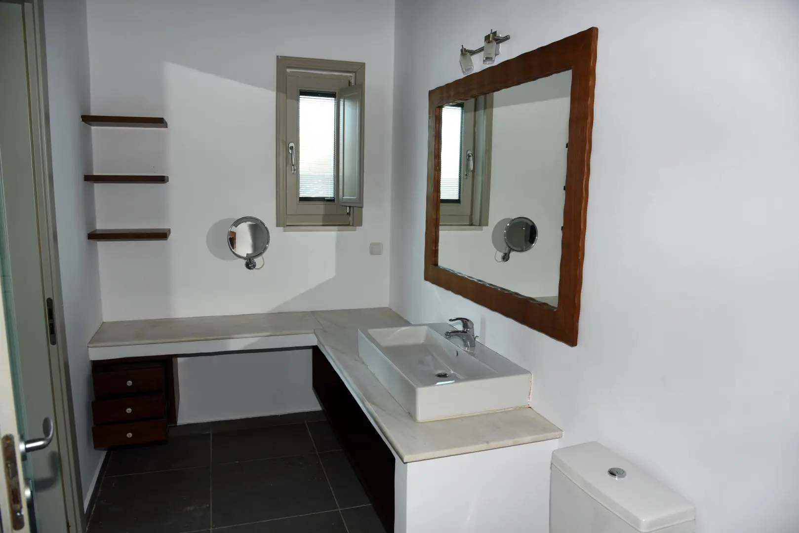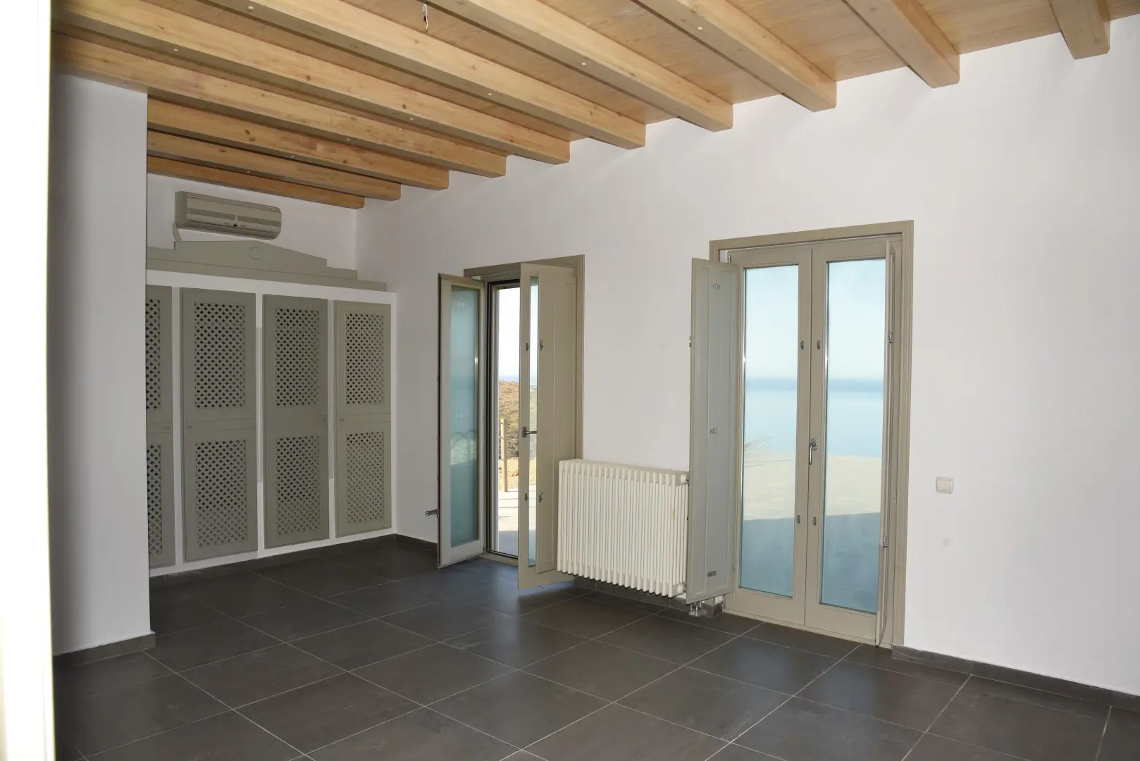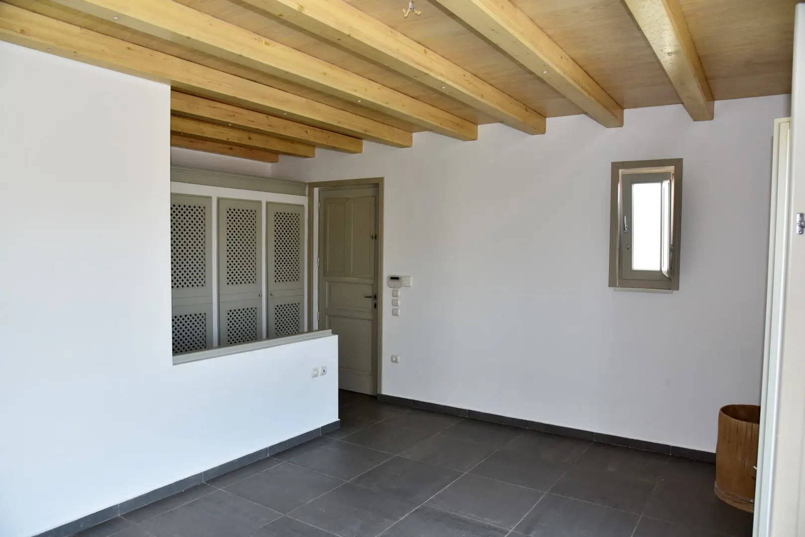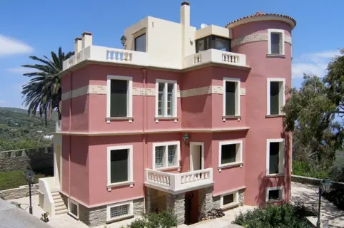 The villa is built on four levels that are connected by a wooden staircase. The ground floor consists of the living room with its fireplace opening to a large covered veranda with a table overlooking the sea, the dining room and a fully equipped kitchen. The first floor consists of three bedrooms, two of which have en-suite bathrooms. All three bedrooms have high ceilings and spacious verandas. The lower lever comprises of a large bedroom with private bathroom, a storage and a laundry room, the boiler room and a WC. It has access to the central staircase of the house and to the garden via a separate entrance. Within the garden two autonomous fully renovated guest houses are situated at some distance from the main villa.