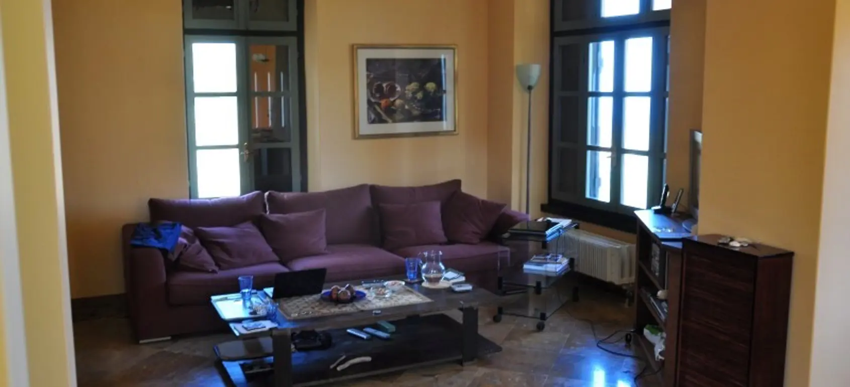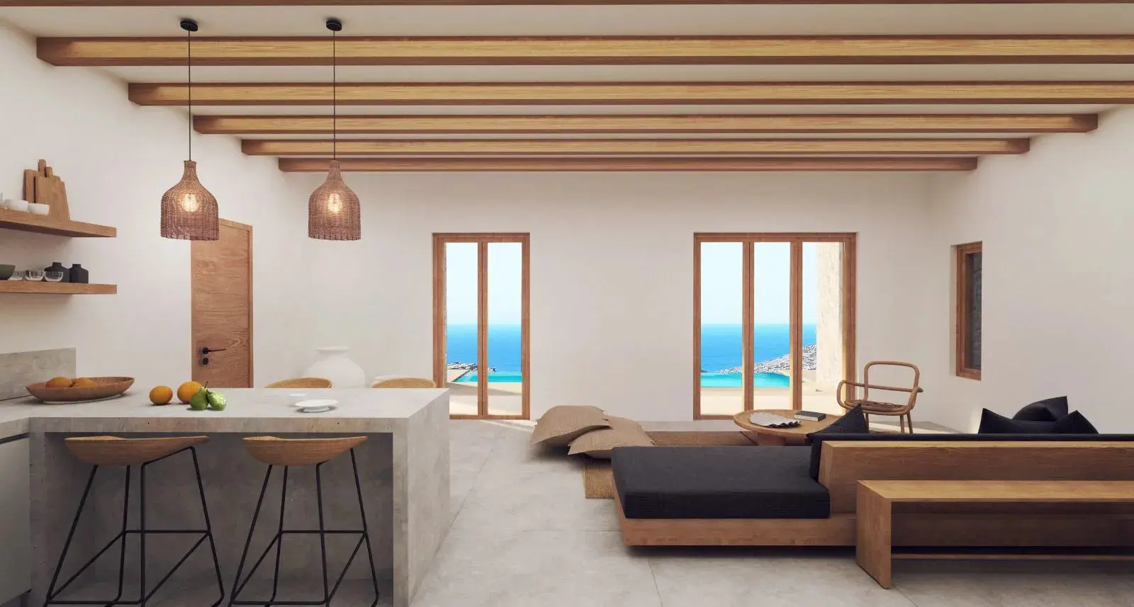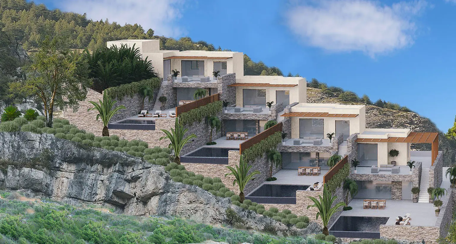 The villa is built on four levels that are connected by a wooden staircase. The ground floor consists of the living room with its fireplace opening to a large covered veranda with a table overlooking the sea, the dining room and a fully equipped kitchen. The first floor consists of three bedrooms, two of which have en-suite bathrooms. All three bedrooms have high ceilings and spacious verandas. The lower lever comprises of a large bedroom with private bathroom, a storage and a laundry room, the boiler room and a WC. It has access to the central staircase of the house and to the garden via a separate entrance. Within the garden two autonomous fully renovated guest houses are situated at some distance from the main villa.