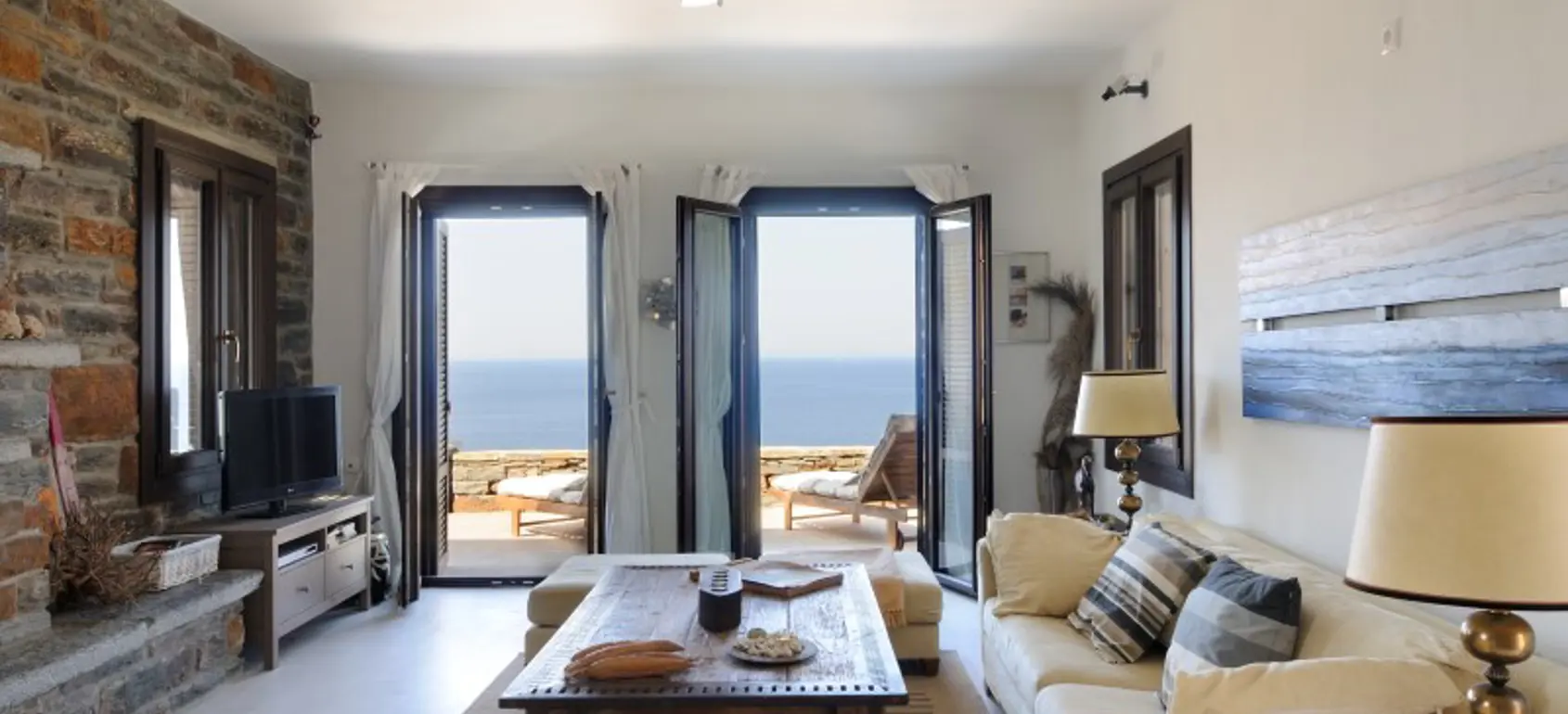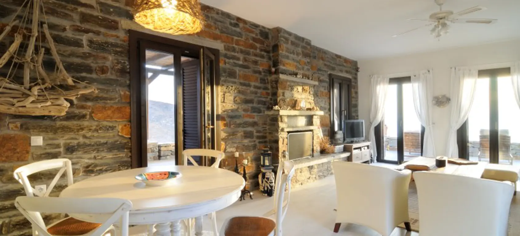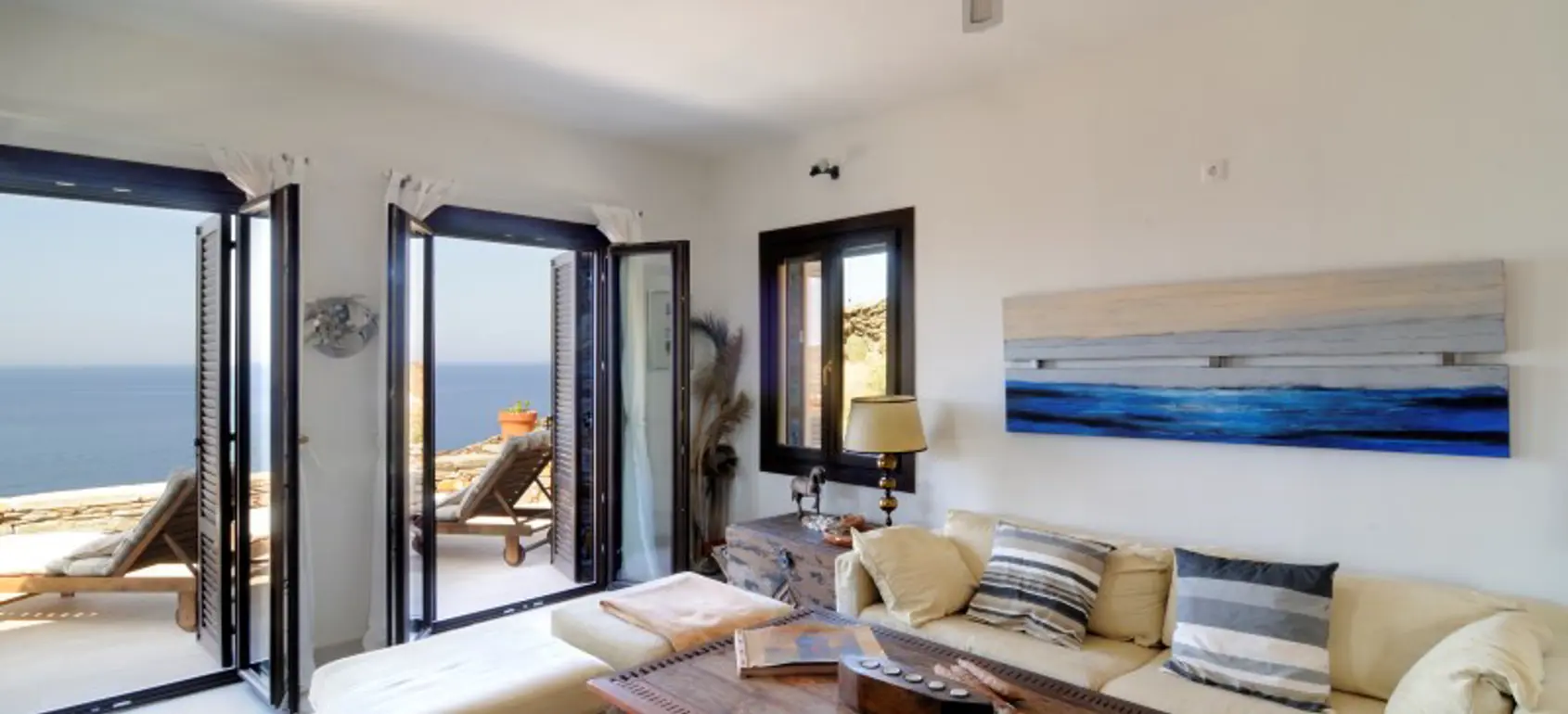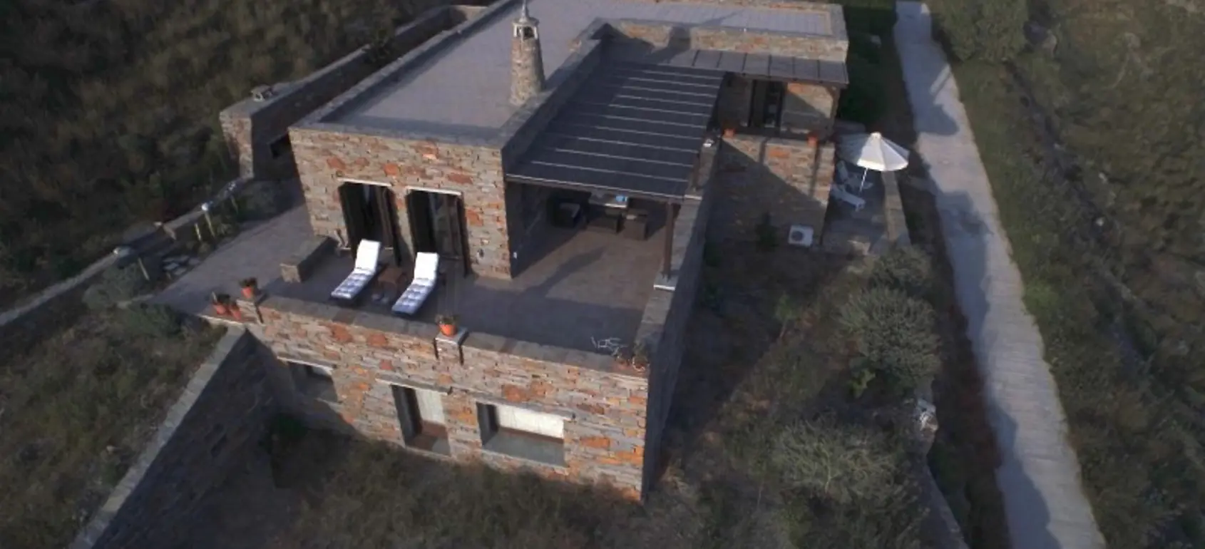 The villa sits on its own terrain of 4,150 square meters on the north side of the Kastellakia Bay valley, 22 meters above sea level, facing south-west into the sunset and well sheltered from the NE meltemi winds, 60 meters approx. from the end of the water. The terrain is not shared with any other property and is one of the few of its kind still for sale in Kea, this close to the sea. A network of shared roads with adjoining properties lead either to the main road or to the Kastellakia beach. There is the possibility of building a pool with the use of sea water. At the upper level with total living space of 135 sqm, there is a living room with an impressive stone fireplace, an open-plan kitchen, 2 bedrooms, 2 bathrooms, storage & laundry room and also a very large terrace with 270-degree sea view. The 35 sqm independent guest studio and the 107 sqm apartment at the garden level offering privacy and comfort. There is also a new modern minimal apartment of 109 sqm with immediate garden access and excellent sea views.