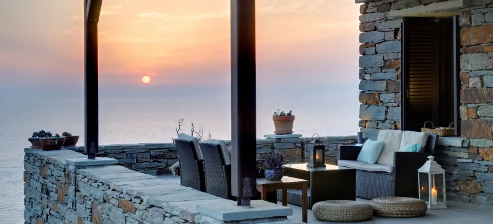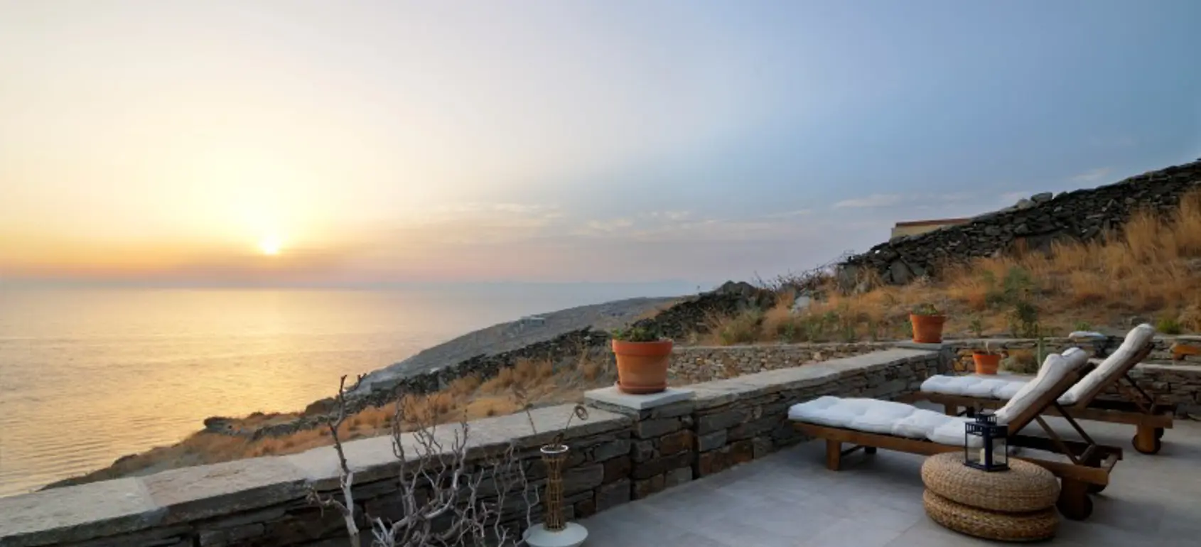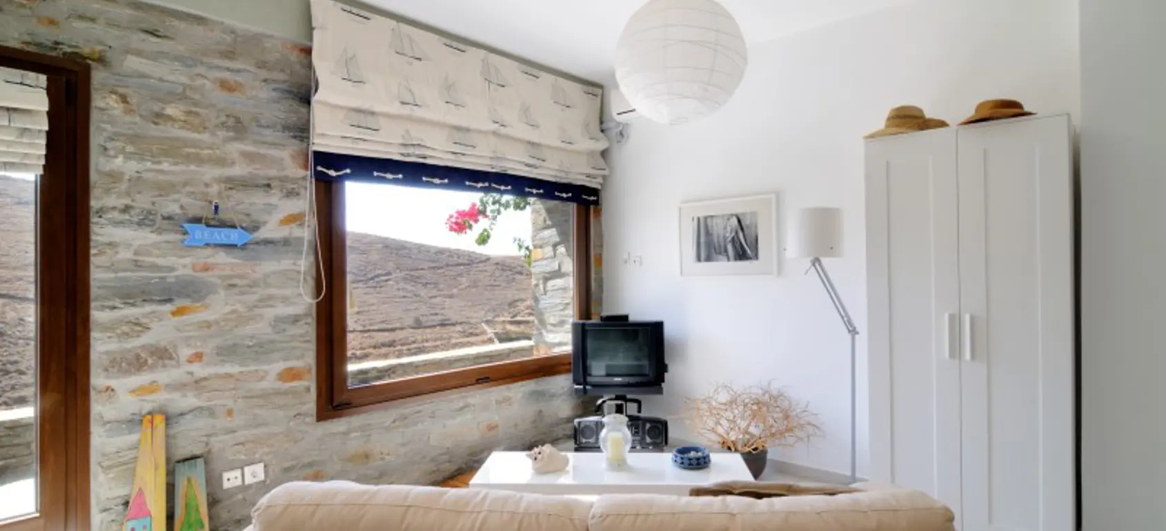 The villa sits on its own terrain of 4,150 square meters on the north side of the Kastellakia Bay valley, 22 meters above sea level, facing south-west into the sunset and well sheltered from the NE meltemi winds, 60 meters approx. from the end of the water. The terrain is not shared with any other property and is one of the few of its kind still for sale in Kea, this close to the sea. A network of shared roads with adjoining properties lead either to the main road or to the Kastellakia beach. There is the possibility of building a pool with the use of sea water. At the upper level with total living space of 135 sqm, there is a living room with an impressive stone fireplace, an open-plan kitchen, 2 bedrooms, 2 bathrooms, storage & laundry room and also a very large terrace with 270-degree sea view. The 35 sqm independent guest studio and the 107 sqm apartment at the garden level offering privacy and comfort. There is also a new modern minimal apartment of 109 sqm with immediate garden access and excellent sea views.