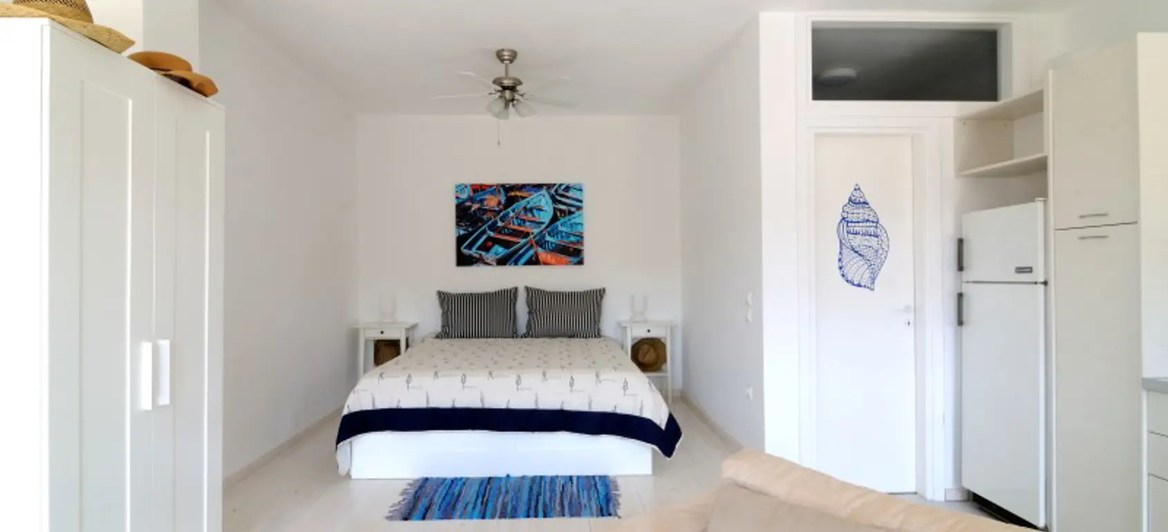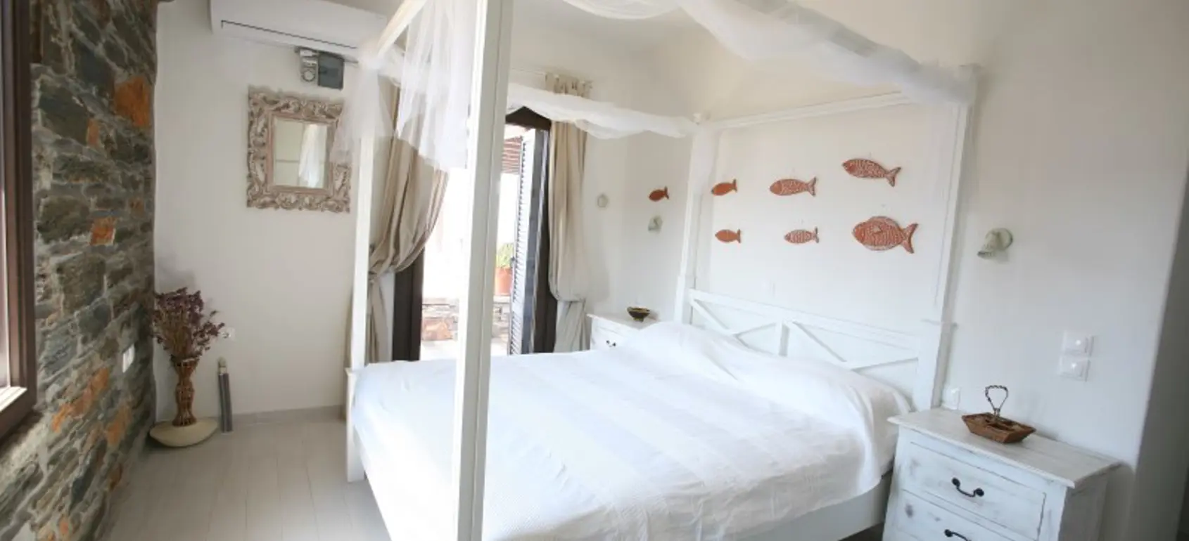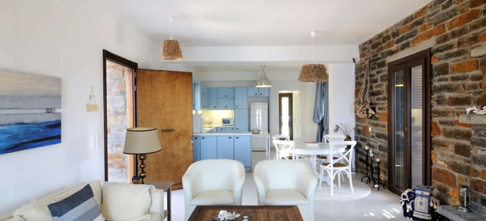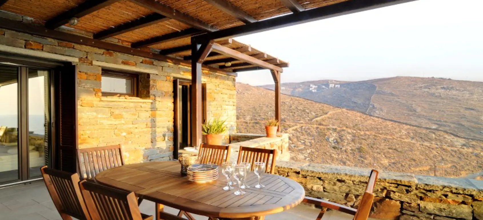 The villa sits on its own terrain of 4,150 square meters on the north side of the Kastellakia Bay valley, 22 meters above sea level, facing south-west into the sunset and well sheltered from the NE meltemi winds, 60 meters approx. from the end of the water. The terrain is not shared with any other property and is one of the few of its kind still for sale in Kea, this close to the sea. A network of shared roads with adjoining properties lead either to the main road or to the Kastellakia beach. There is the possibility of building a pool with the use of sea water. At the upper level with total living space of 135 sqm, there is a living room with an impressive stone fireplace, an open-plan kitchen, 2 bedrooms, 2 bathrooms, storage & laundry room and also a very large terrace with 270-degree sea view. The 35 sqm independent guest studio and the 107 sqm apartment at the garden level offering privacy and comfort. There is also a new modern minimal apartment of 109 sqm with immediate garden access and excellent sea views.