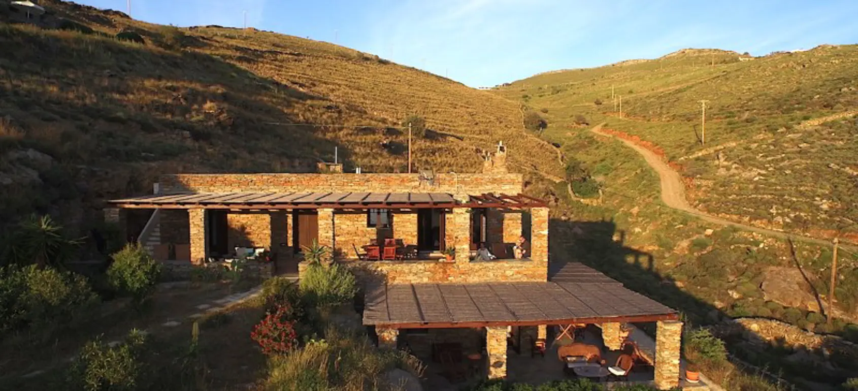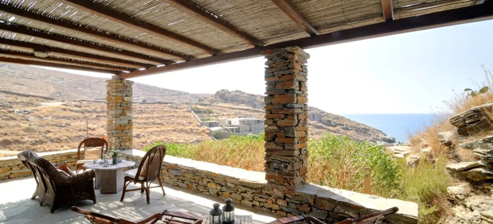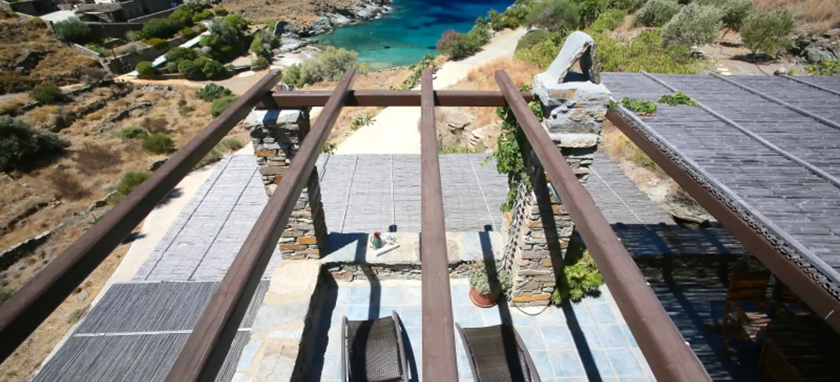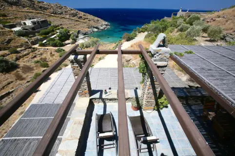 This seaside year-round home offers immediate accessibility from Athens, high standards of living and enjoyment of the outdoors and indoors year-round, built to high technical standards & materials to provide comfort, withstand extreme weather conditions (salt, wind, sun, rain) in the depth of time, minimize maintenance and operational cost and respect the surrounding environment and local ecology. The great advantages of this property is its amazing proximity to the beach, sense of really being close to the water (sounds, smell), tranquillity, autonomy amazing sea views and solid, issue-free construction and a brand name property on the rental market for several years with significant returns. The Villa sits on its own terrain of 4,190 sq meters on the north-west side of the Kastellakia Bay, some 12 meters above sea level, facing south-west into the sunset and well sheltered from the NE meltemi winds. At the upper level with total living space of 96 sqm, there is a living room with a fireplace, an open-plan kitchen, 2 bedrooms, 2 bathrooms (one en-suite). The house features ample shaded front and back terraces with pergolas & reed and a staircase to the roof for dreamy views. At the garden level there is an independent apartment of 79 sqm with 2 bedrooms, 1 bathroom, a living room & a full kitchen with sweeping sea view. A fully grown garden (olives, succulents, trees, shrubs) surrounds the villa.