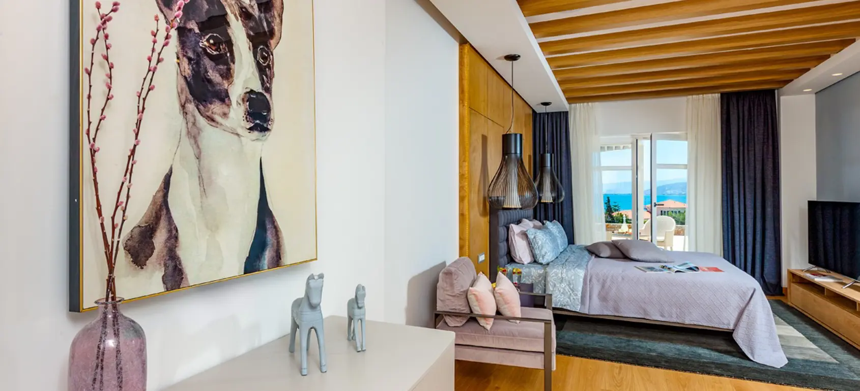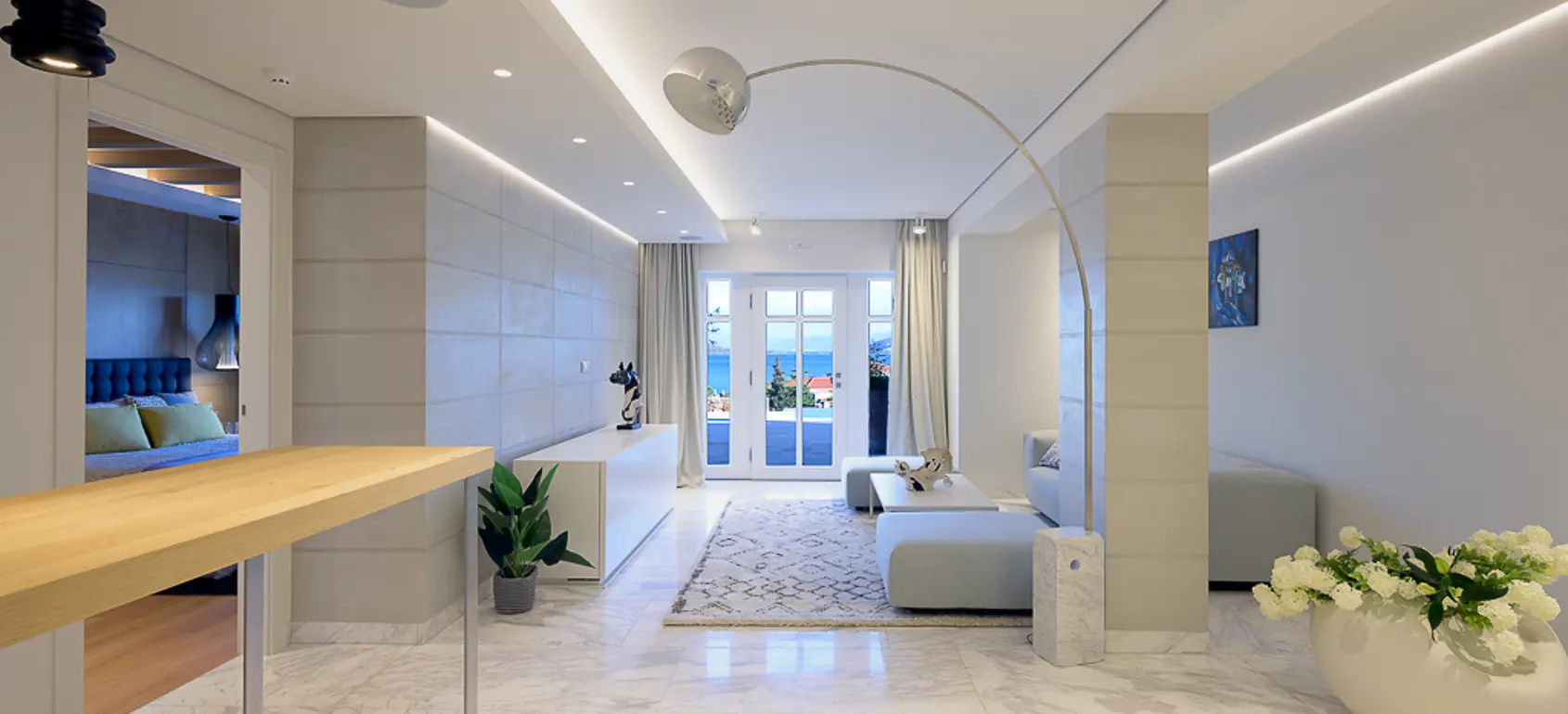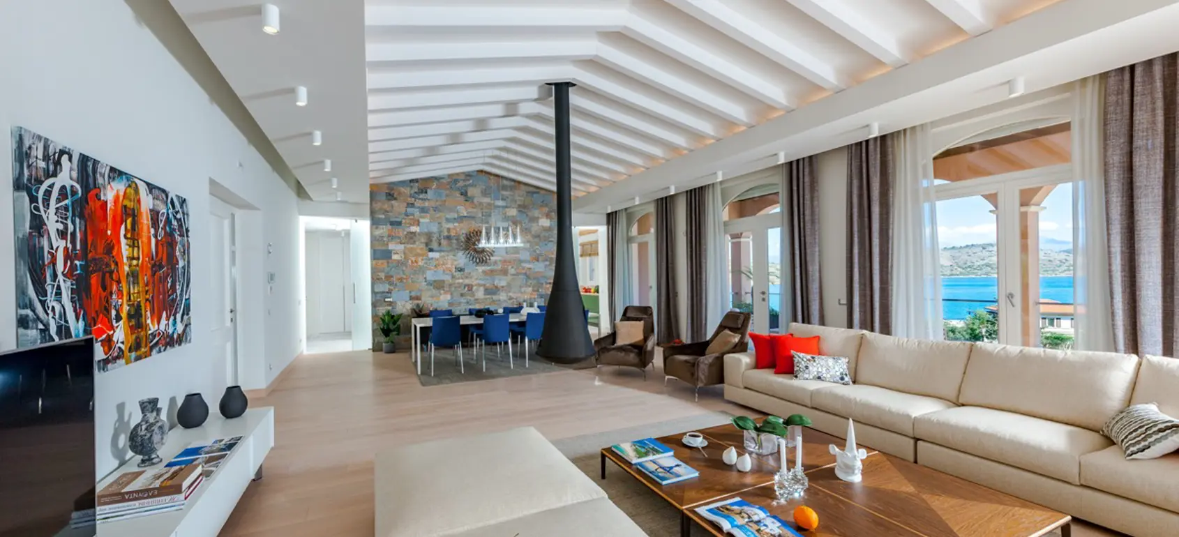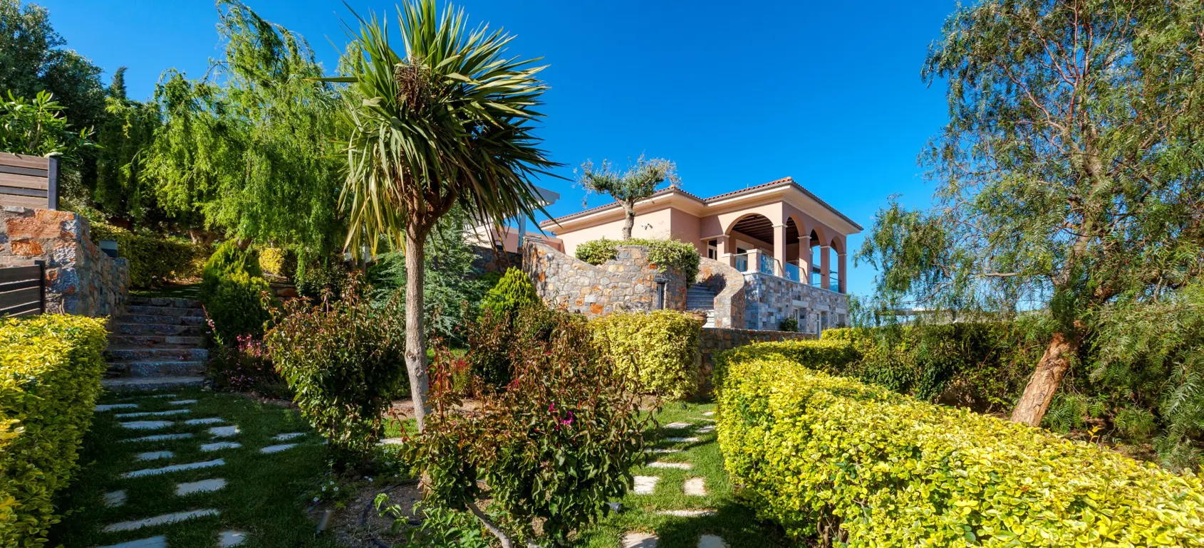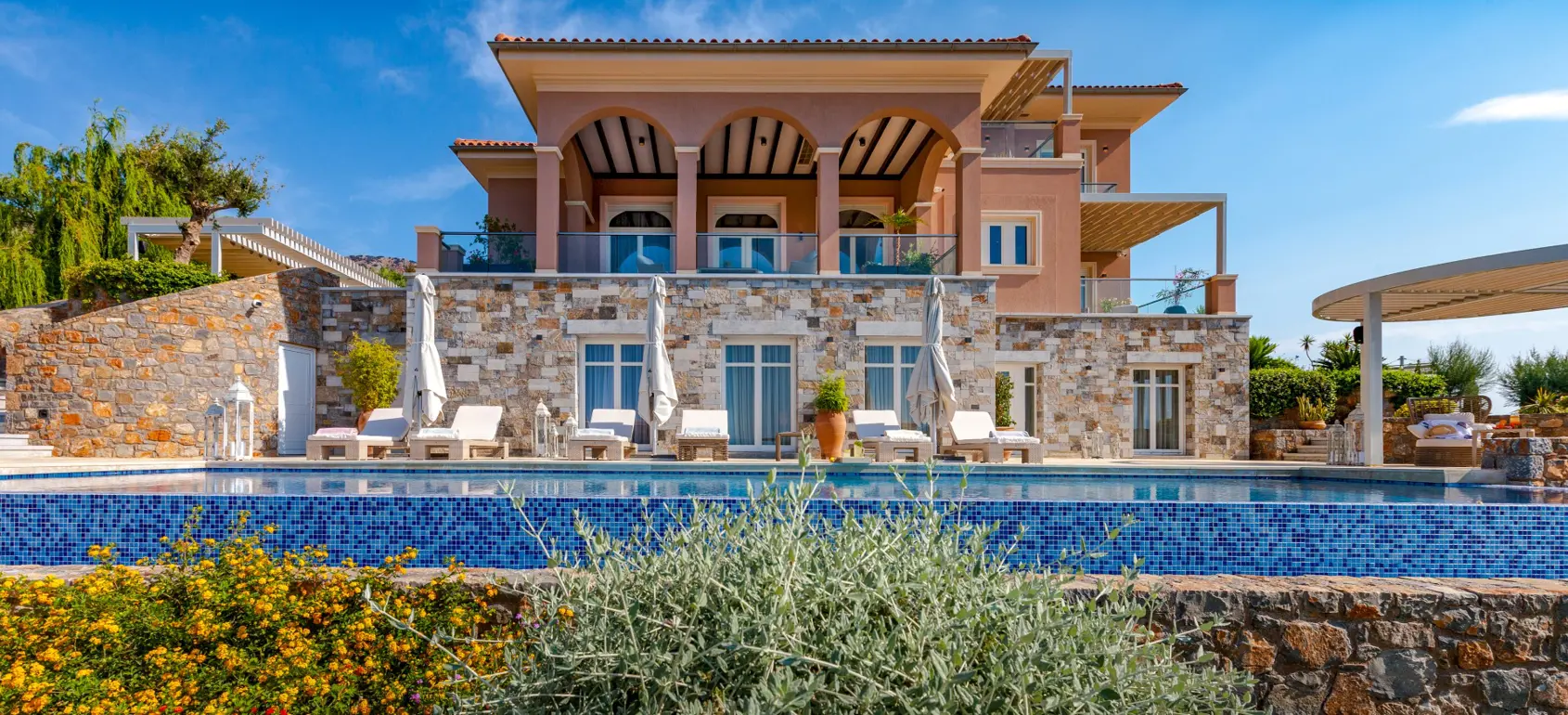 The villa comprise two large living areas and four bedrooms, each with its private bathroom. The lovely outdoor area includes terraces, an infinity pool and a landscaped garden facing the sea. A rich choice of views from the villa on to the sea and its beautiful coast line invites to contemplation. The house also has a view to the renowned Spinalonga island. A minute walk will take you to a fine private sandy beach.
