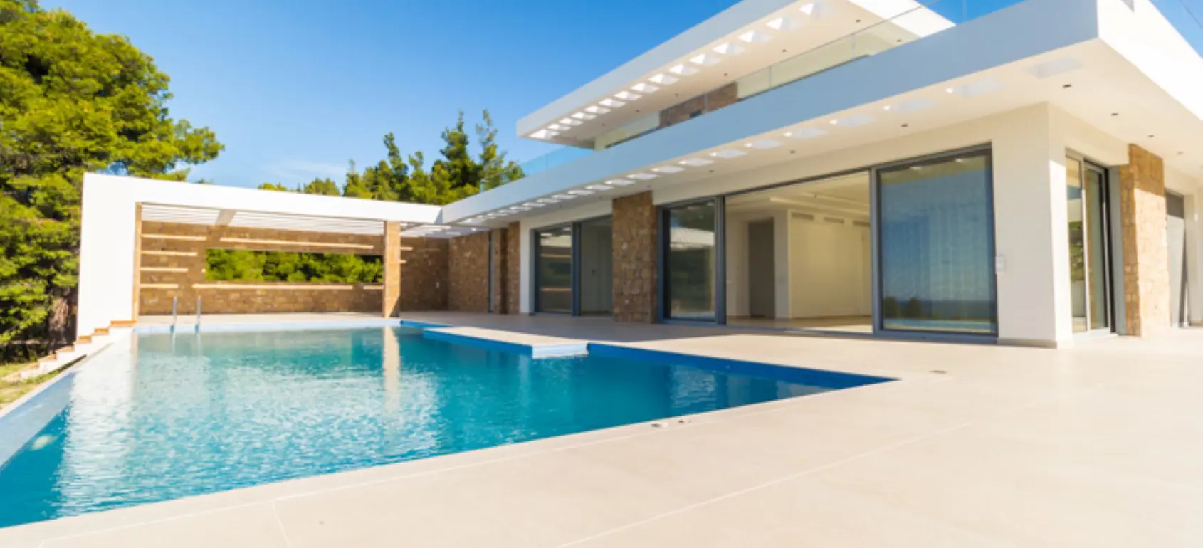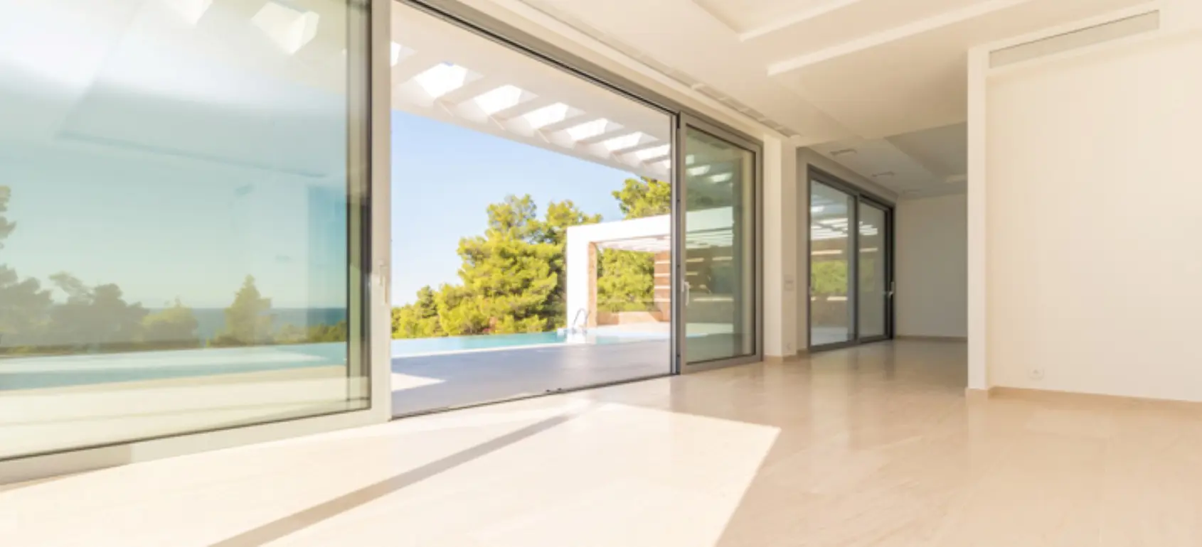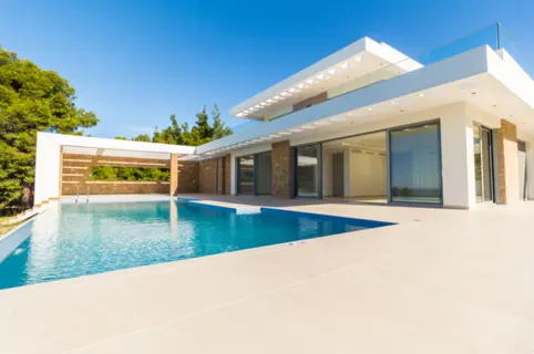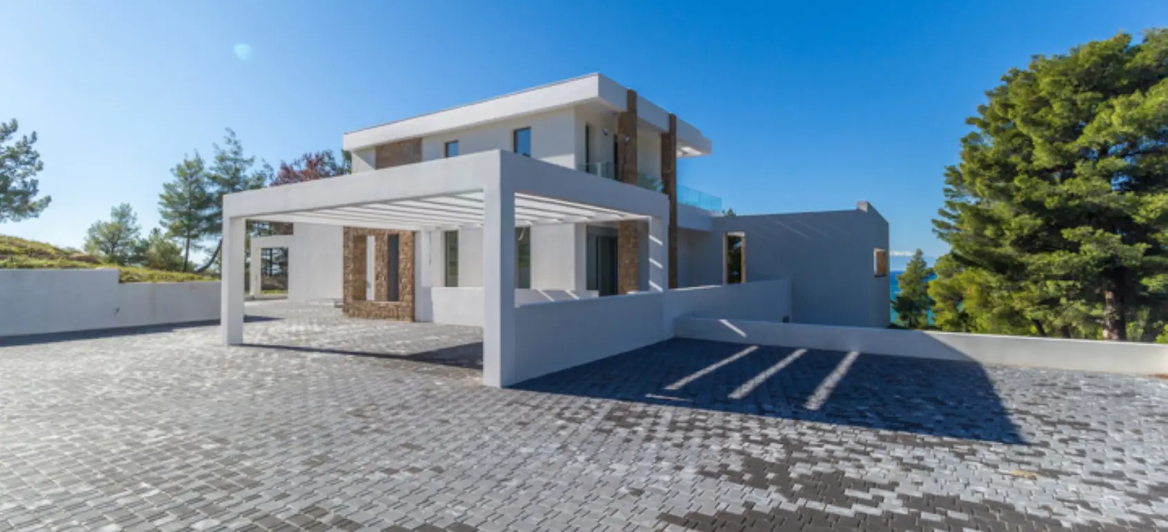 Surrounding the villa there is a private landscaped plot with a 45 sqm pergola with a parking capacity of 3 cars. The private swimming pool of 15 meters in length has a 4-seater hydro massage and swimming system. There is also a 60 sqm pergola on the pool level and an open parking for 2 additional cars. Additionally, each residence has a private garden with unobstructed views to the Aegean Sea and Mount Olympus. Each villa features a modern underfloor heating/cooling installation for winter and summer, with a Hitachi heat pump and a second independent air conditioning system with an external VRV unit.