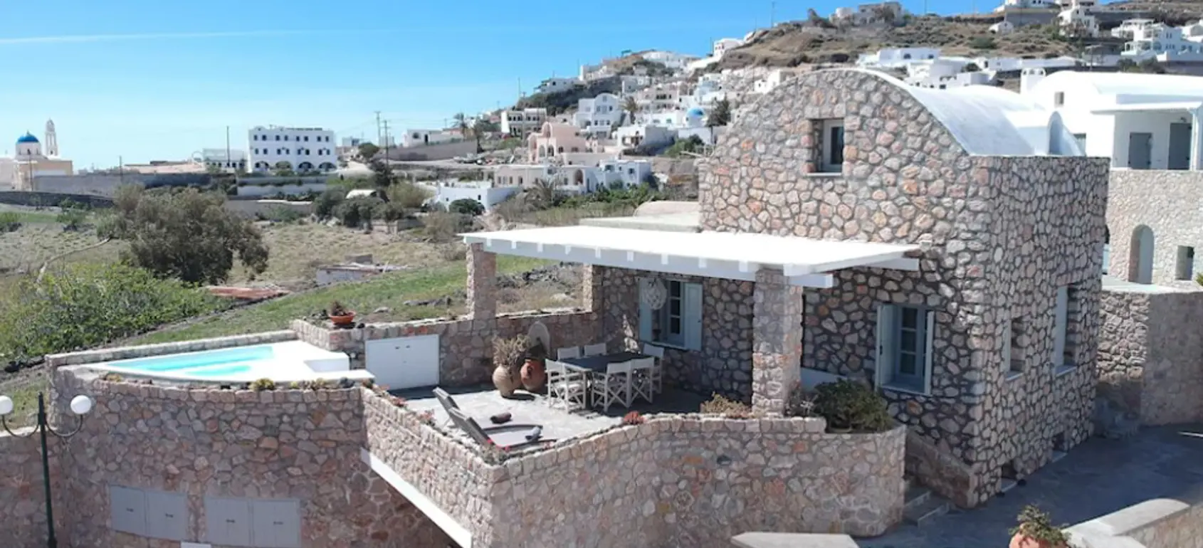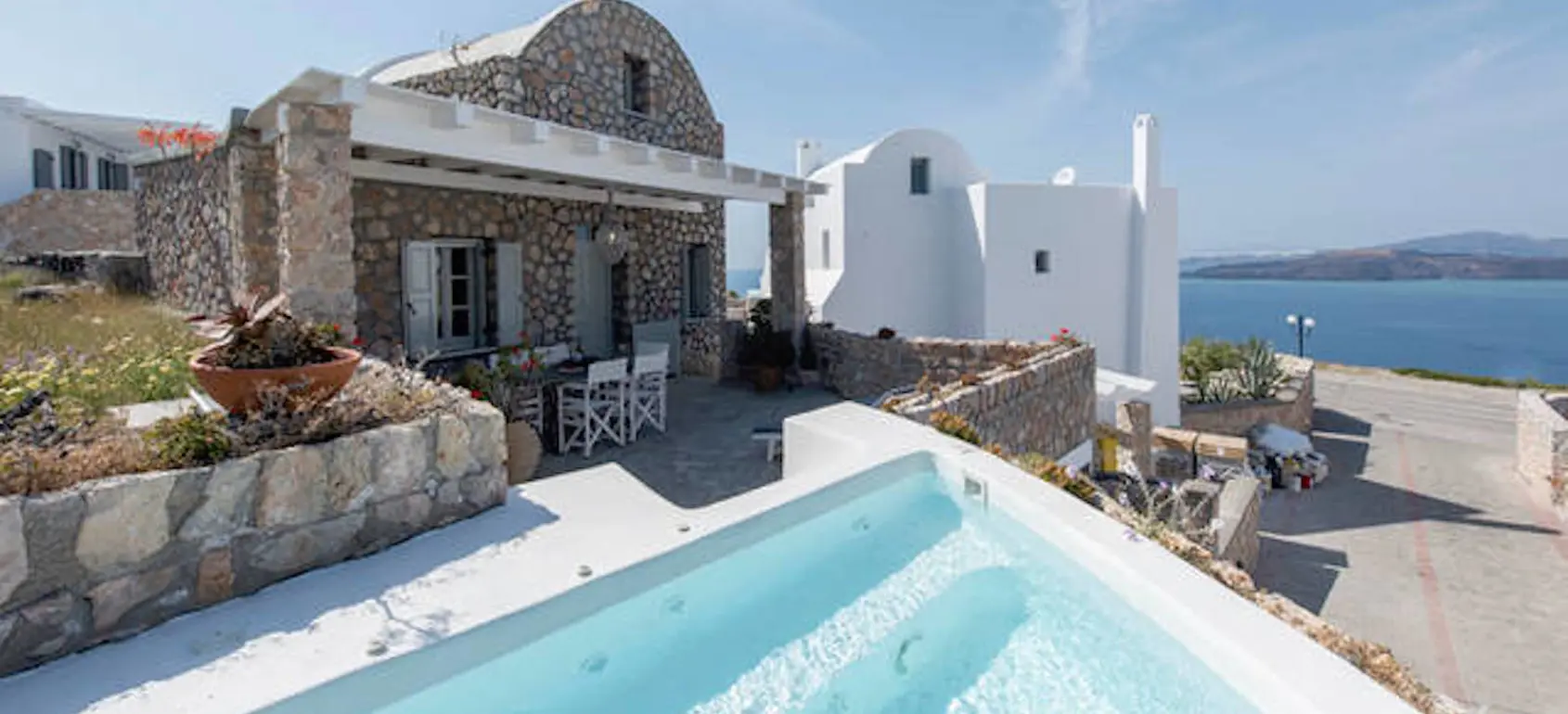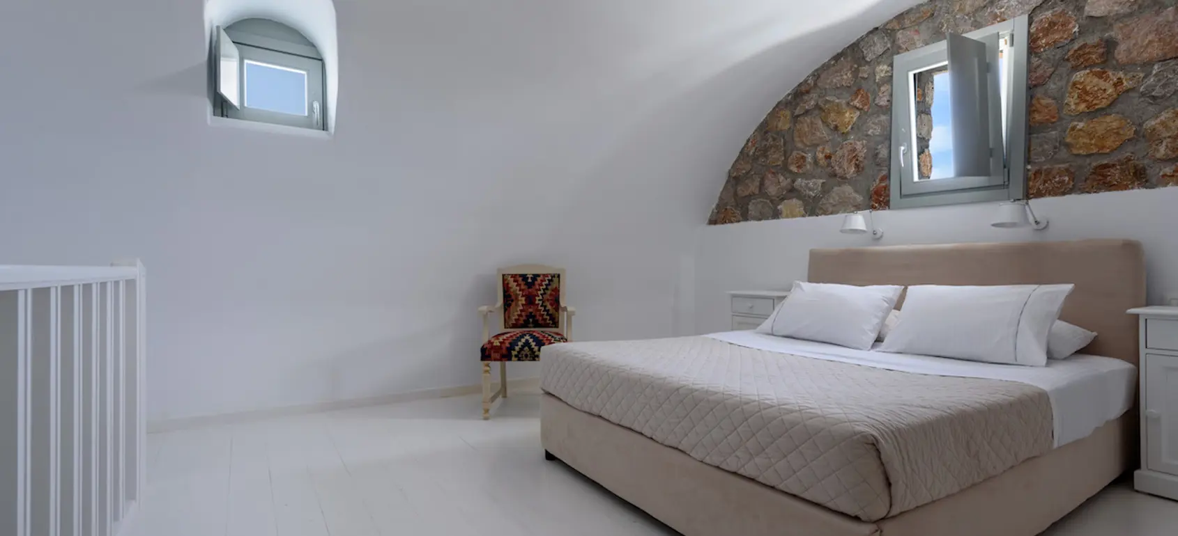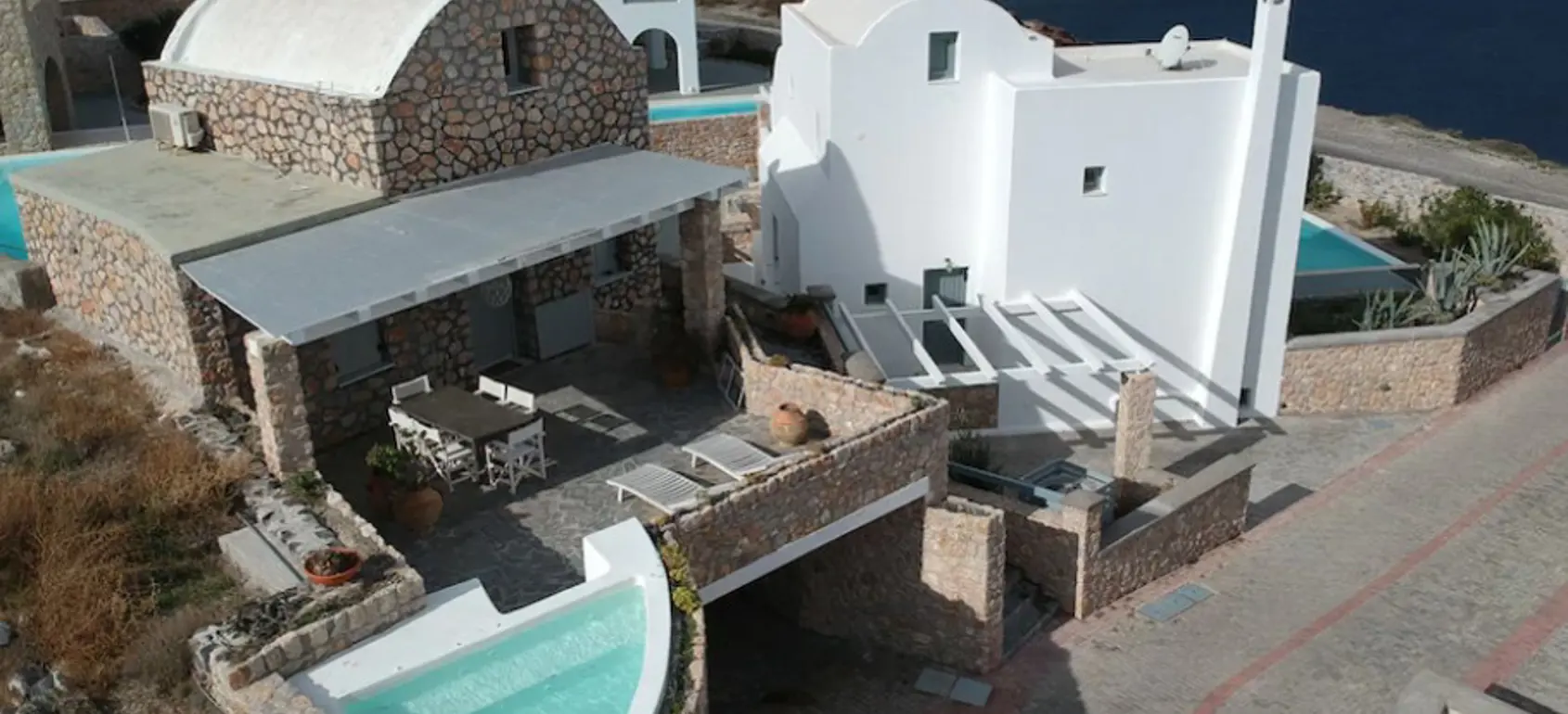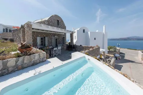 Located in Akrotiri, the Villa stands between the view of the caldera and the view of Akrotiri and its fortress. Situated in a complex of houses, but remain very private with its own entrance and outdoor heated plunge pool, the villa consists of three levels. A master bedroom with en suite bathroom is situated on the lower level, a second living room with an extra sofa bed, a fully equipped kitchen with a second entrance to the house; a second kitchen as well as the main living room and a spacious bathroom occupy the main level, where guests can also indulge themselves and relax on the big veranda with the outdoor dining area, heated plunge pool and lie in the sun. Finally a private double bedroom inhabits the upper level of the villa.