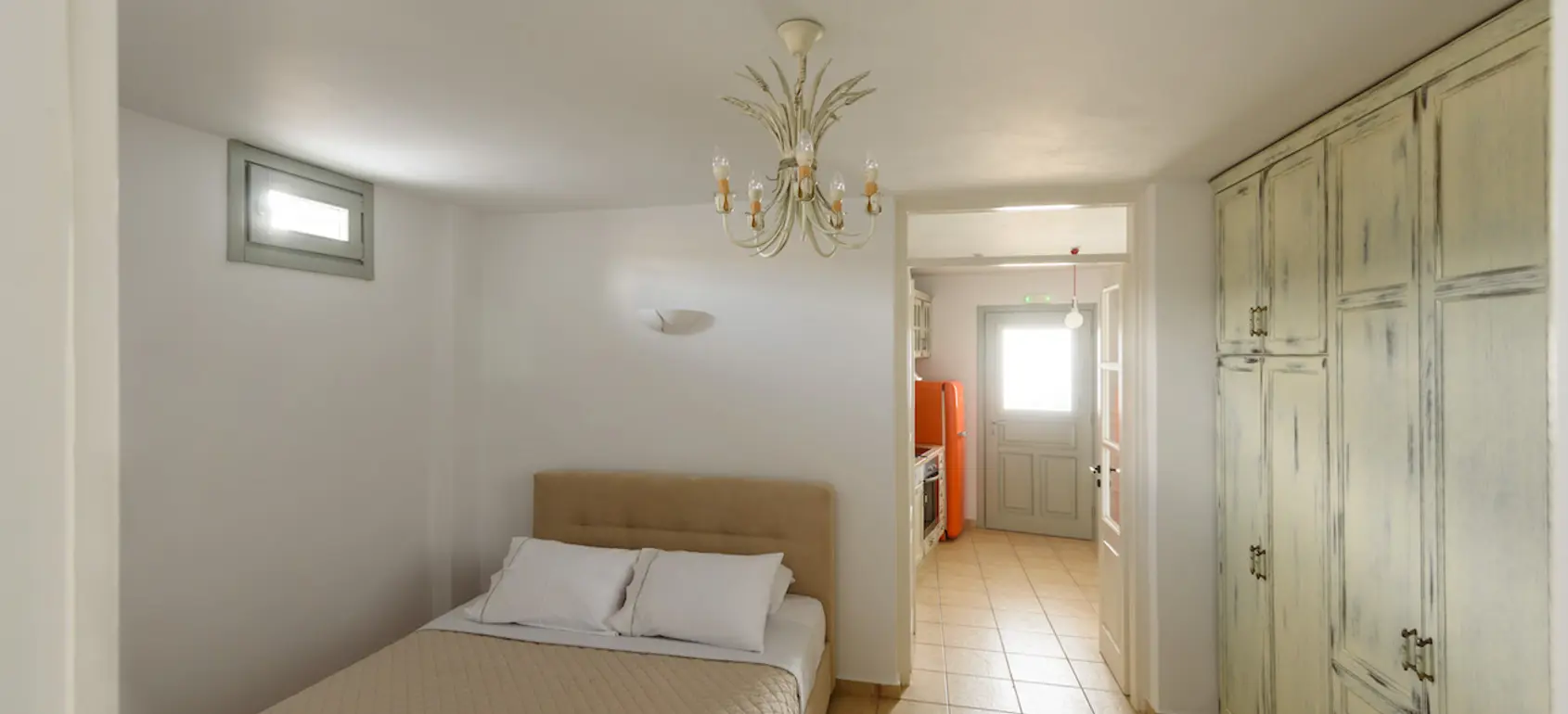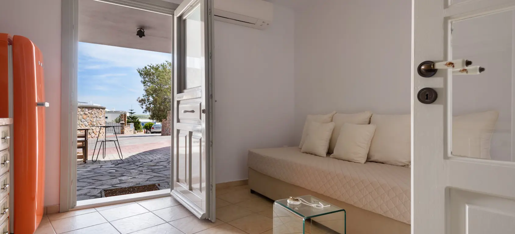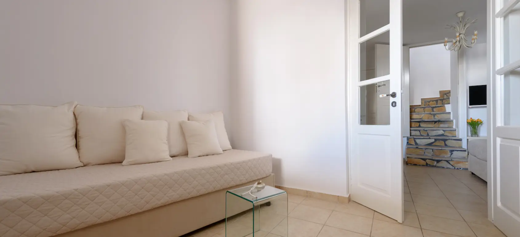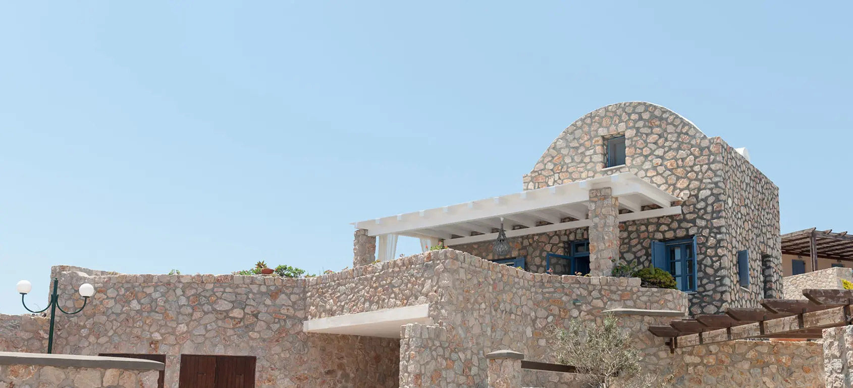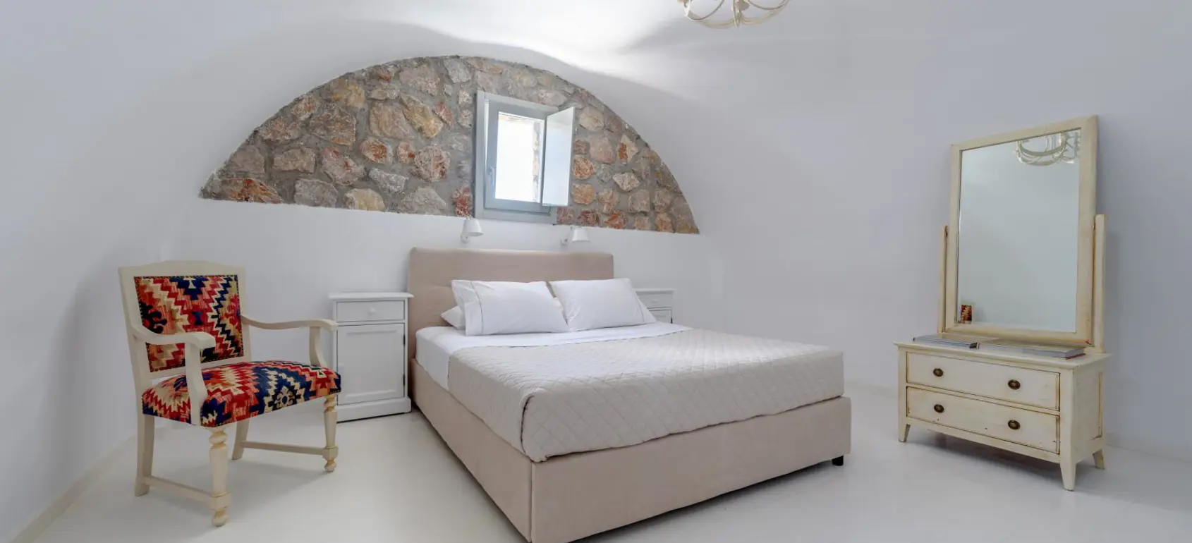 Located in Akrotiri, the Villa stands between the view of the caldera and the view of Akrotiri and its fortress. Situated in a complex of houses, but remain very private with its own entrance and outdoor heated plunge pool, the villa consists of three levels. A master bedroom with en suite bathroom is situated on the lower level, a second living room with an extra sofa bed, a fully equipped kitchen with a second entrance to the house; a second kitchen as well as the main living room and a spacious bathroom occupy the main level, where guests can also indulge themselves and relax on the big veranda with the outdoor dining area, heated plunge pool and lie in the sun. Finally a private double bedroom inhabits the upper level of the villa.