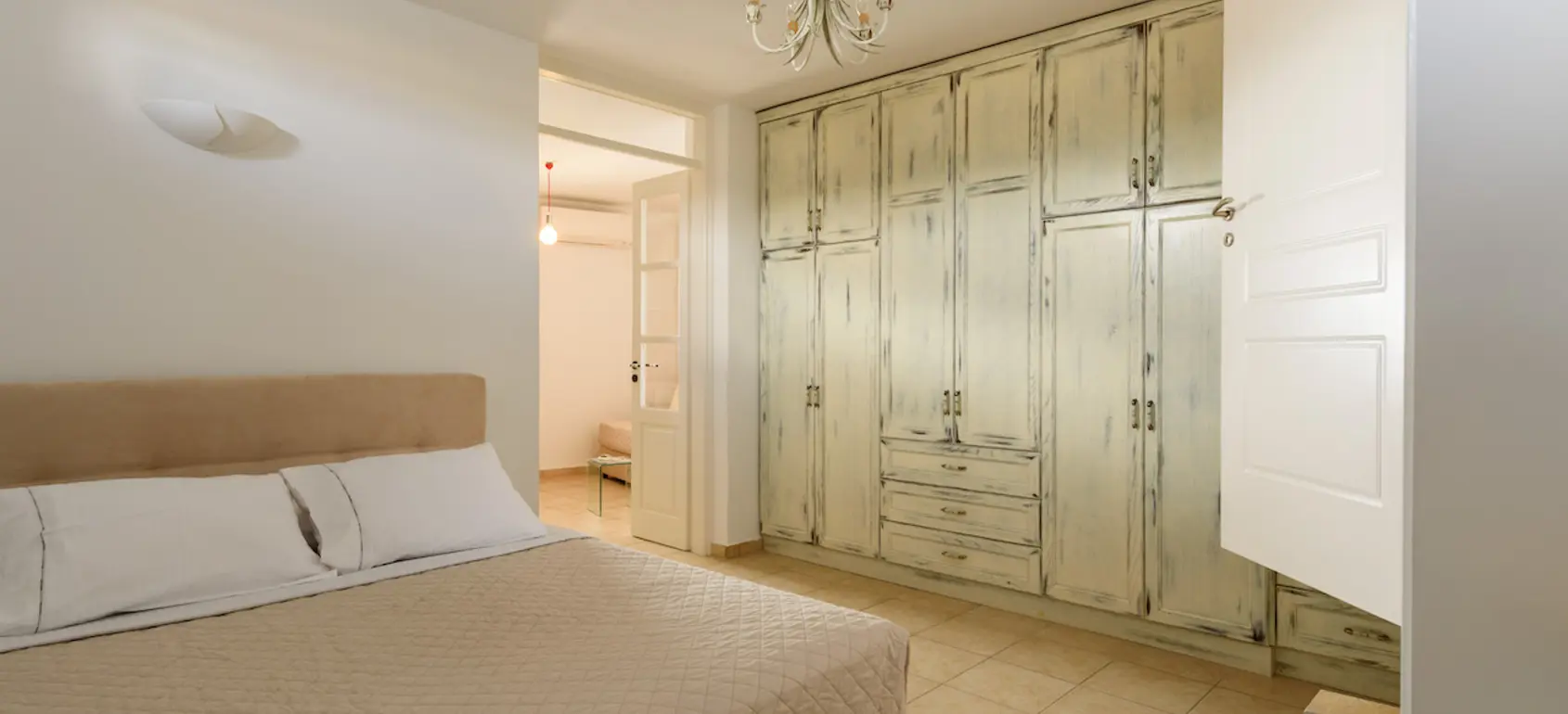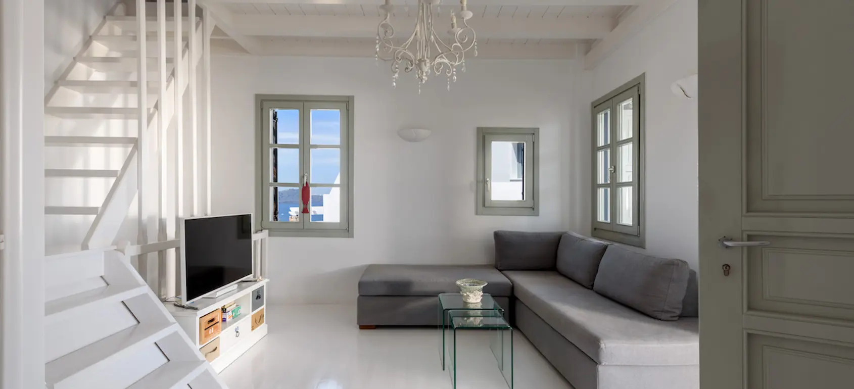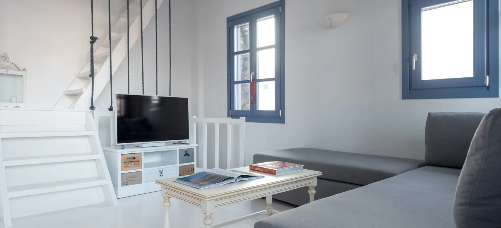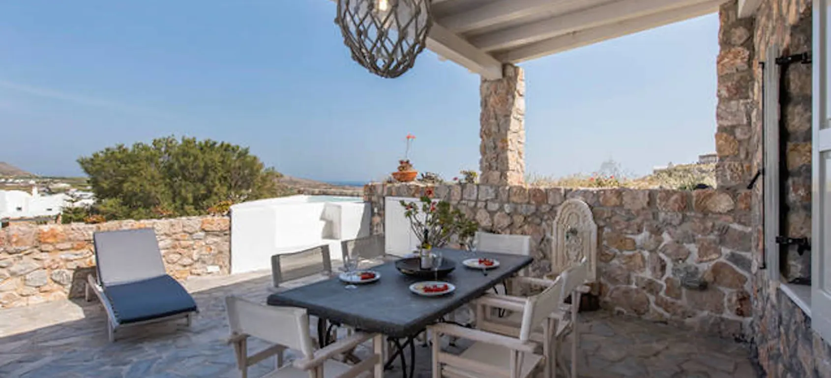 Located in Akrotiri, the Villa stands between the view of the caldera and the view of Akrotiri and its fortress. Situated in a complex of houses, but remain very private with its own entrance and outdoor heated plunge pool, the villa consists of three levels. A master bedroom with en suite bathroom is situated on the lower level, a second living room with an extra sofa bed, a fully equipped kitchen with a second entrance to the house; a second kitchen as well as the main living room and a spacious bathroom occupy the main level, where guests can also indulge themselves and relax on the big veranda with the outdoor dining area, heated plunge pool and lie in the sun. Finally a private double bedroom inhabits the upper level of the villa.