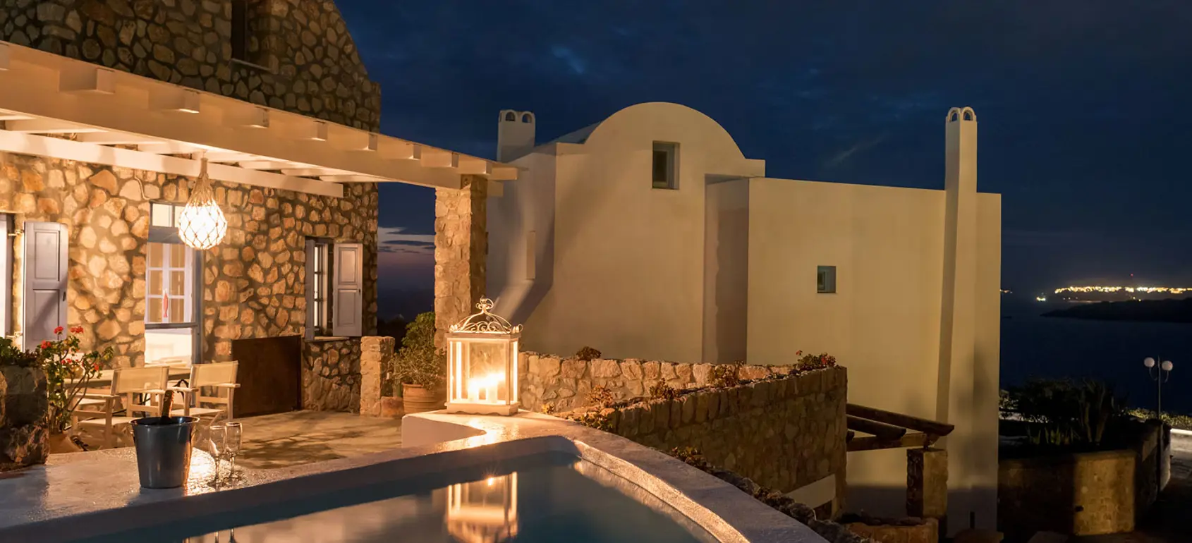 Panoramic views properties of the azure Aegean Sea and the world-famous Santorini sunset