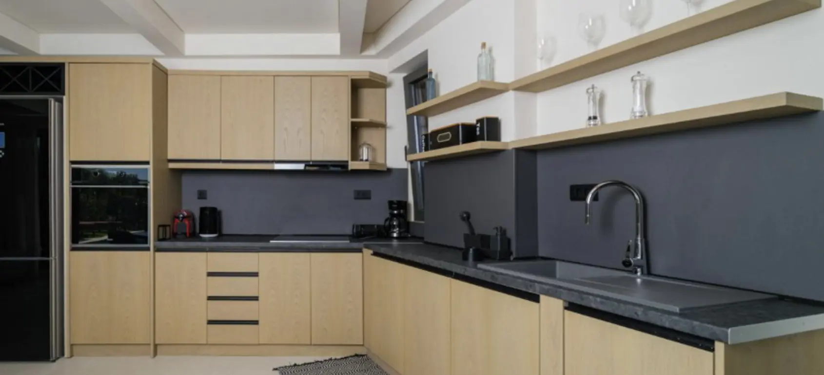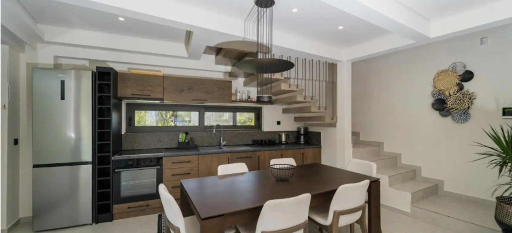The second level, elevated to the height of the lush garden and the captivating pool, houses a fully equipped open plan kitchen, an elegant dining area, a spacious living room, a well- appointed bathroom and a master bedroom with its own en-suit bathroom and terrace. The bedroom on this level features a King size double bed, a mirrored boudoir doubling as an office space, an expansive open closet and a private bathroom with a waterfall shower, complete with every comfort for your ultimate relaxation.