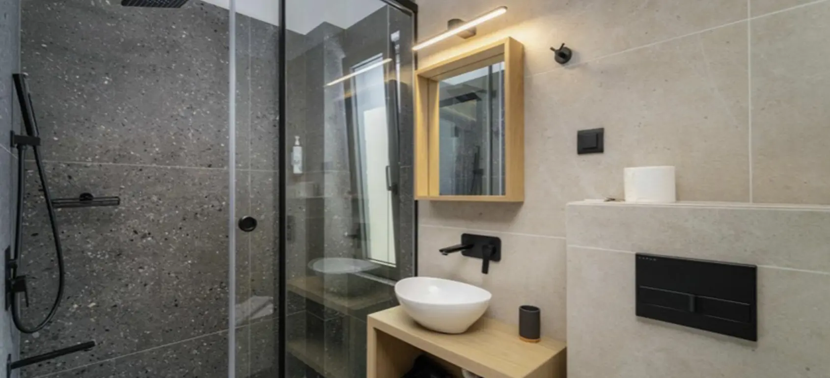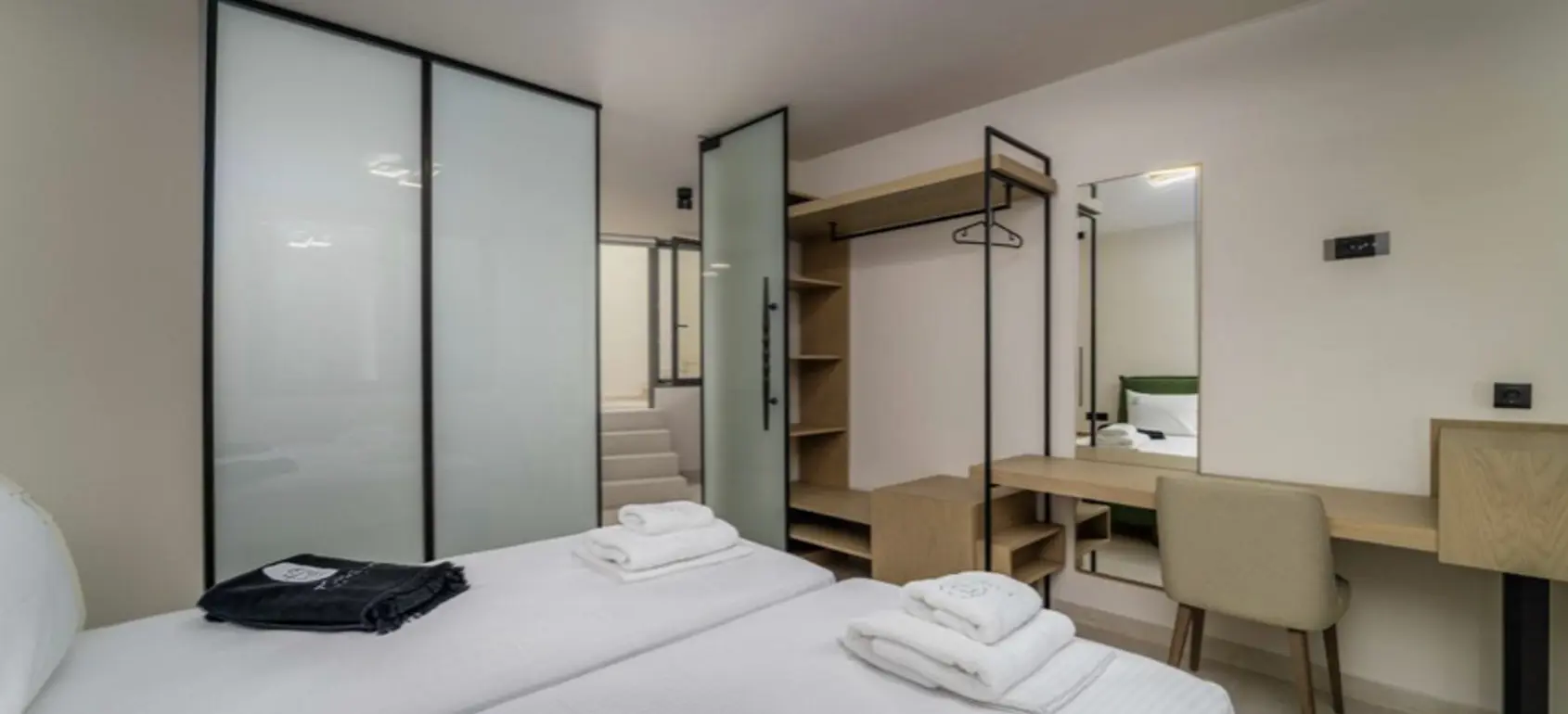 On the first level you will find a spacious bedroom with two convertible single beds, a sophisticated boudoir doubling as an office space, an expansive open closet with ample storage and an en-suite bathroom featuring a soothing waterfall shower. This level also houses an entertainment enclave equipped with generous sofa and a home cinema featuring a 60-inch Smart T.V, perfect for movie nights or thrilling video games sessions. Last but not least, the sauna area, where ancient techniques meld with contemporary comforts, offering you the ultimate retreat for rejuvenation. Thanks to its subterranean construction, it is considered to be the coolest level of the villa. An outdoor staircase connects it to the other two levels.