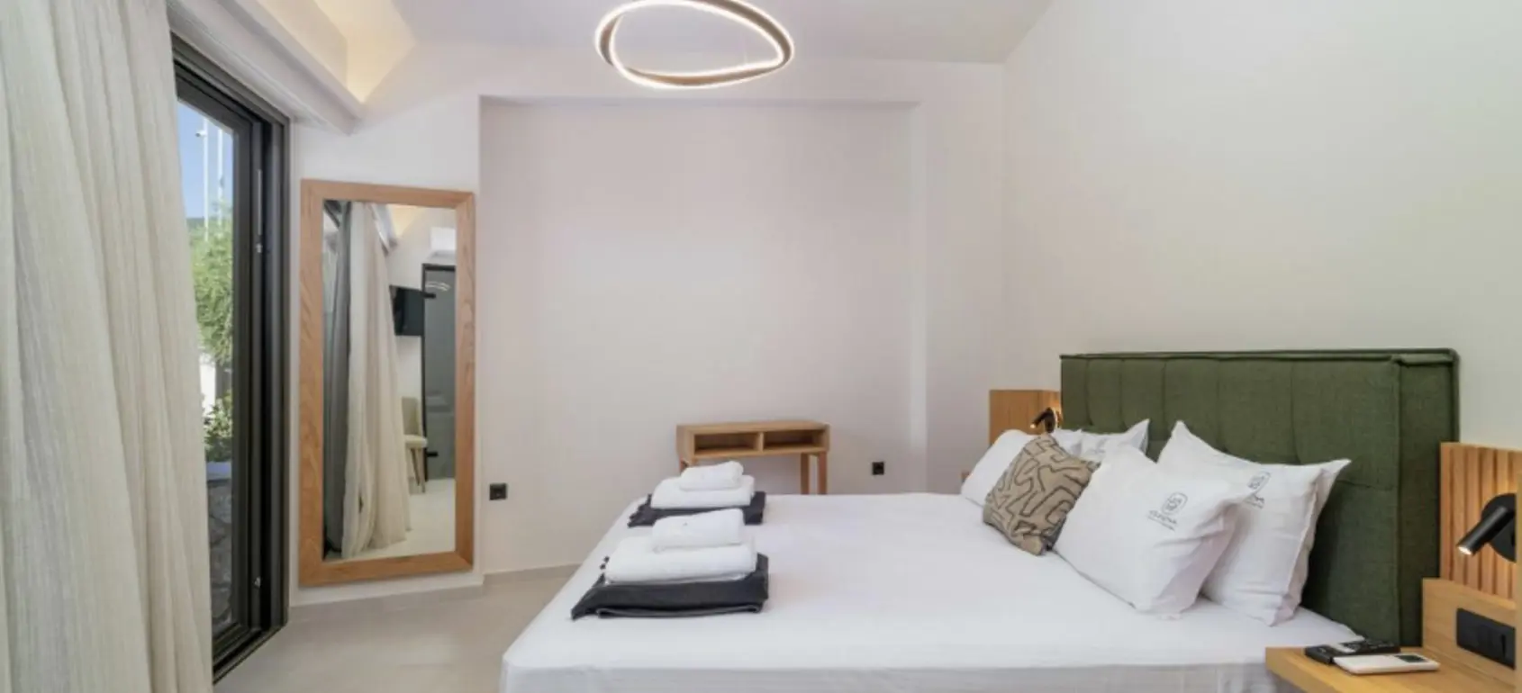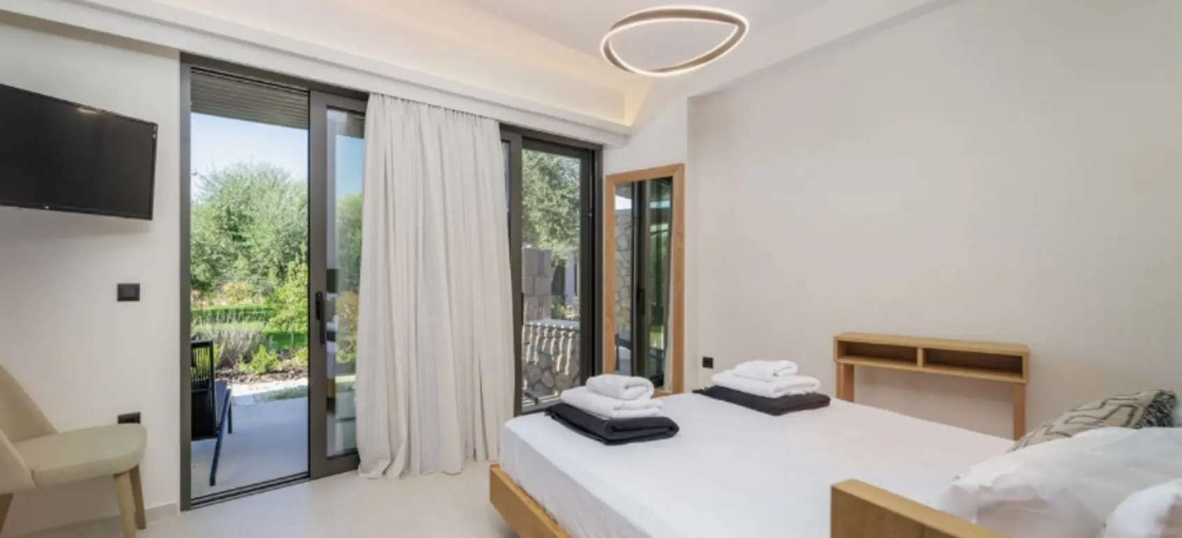 The outdoor area is equipped with comfortable recliners, dining area and bbq. On the third level that is connected to the second via indoor staircase is a celestial bedroom with a charming slopped roof, a king size double bed, a sophisticated boudoir doubling as an office space, an open closet with generous storage and an en-suite bathroom with a soothing waterfall shower. The room and its terrace offer a panoramic view of the picturesque settlement of Lygia, the swimming pool and the amazing garden.