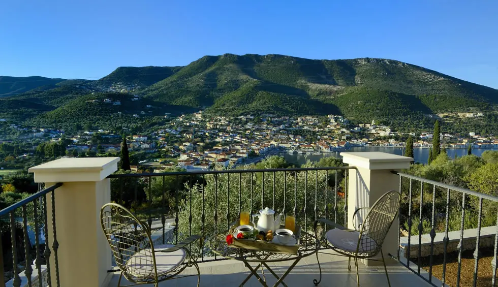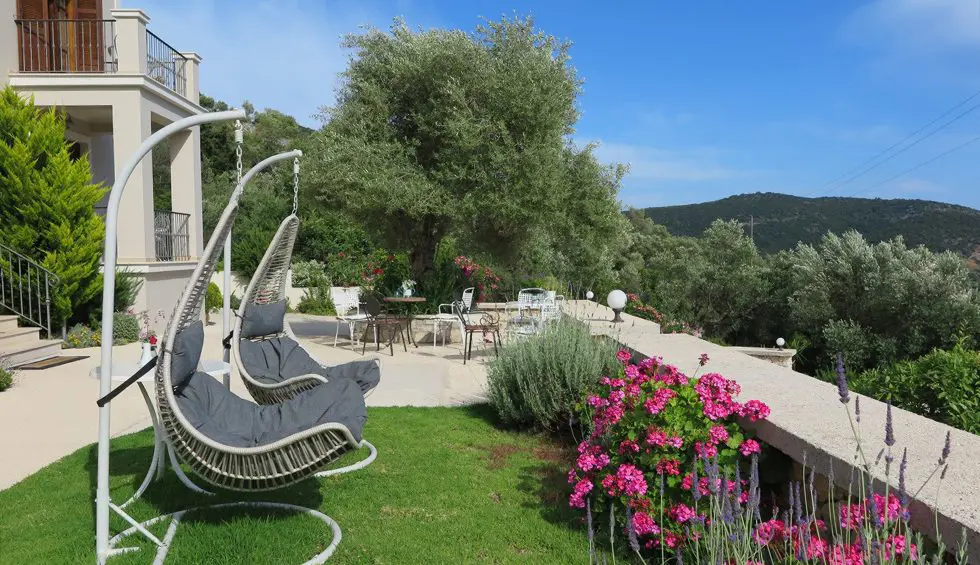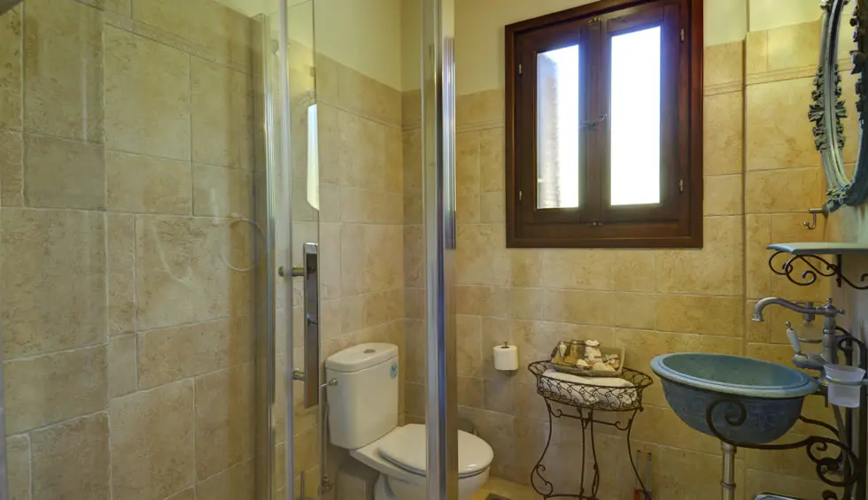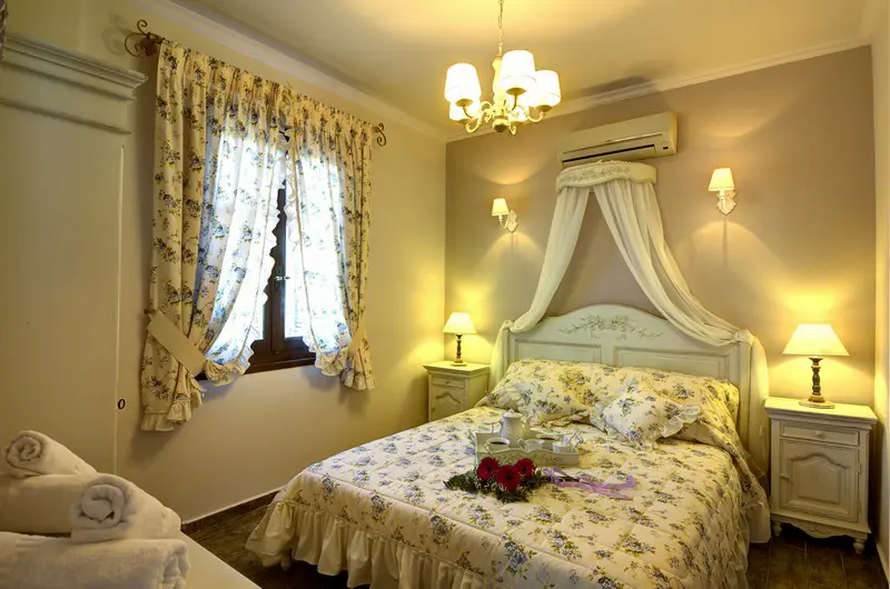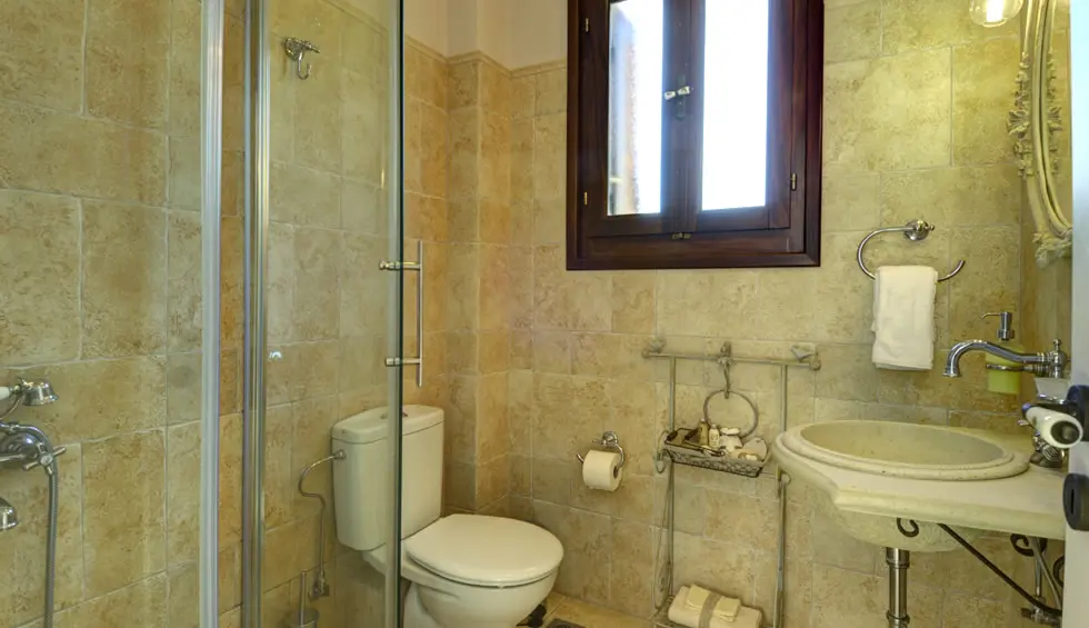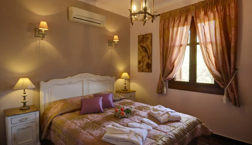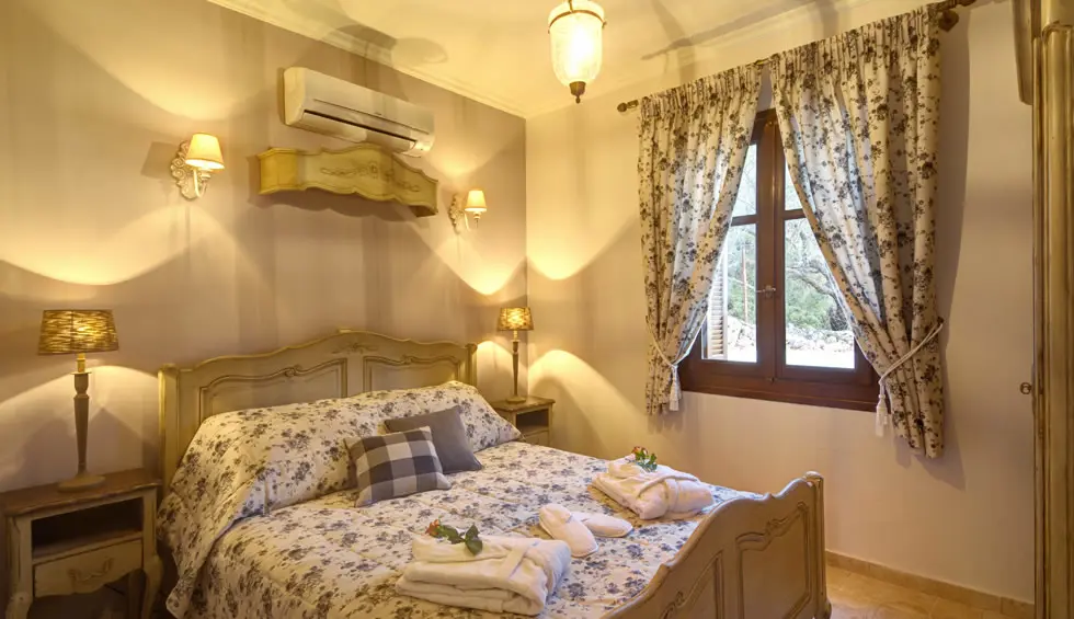 The solid wood handmade staircase leads to the first floor where there are six en-suite bedrooms with individual balconies and stunning views of the surrounding mountains, the garden and the swimming pools. All the bedrooms are furnished in an elegant English country style with handmade furniture especially designed for each room. Rich, elegant fabrics in different styles and colours give each room an individual style.