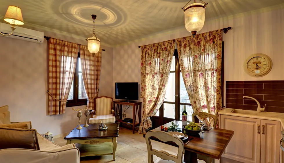 The ground level consists of the entrance/reception area which leads to the dining room and the living room, both furnished with especially designed, handmade furniture influenced by the elegant English country style. There are 2 fully equipped kitchens, one of which is equipped with professional inox appliances, one fully equipped bar, a storage room, two WCs, one en-suite bedroom and a big balcony with amazing views of the mountains, furnished in French country style wrought iron tables and chairs.