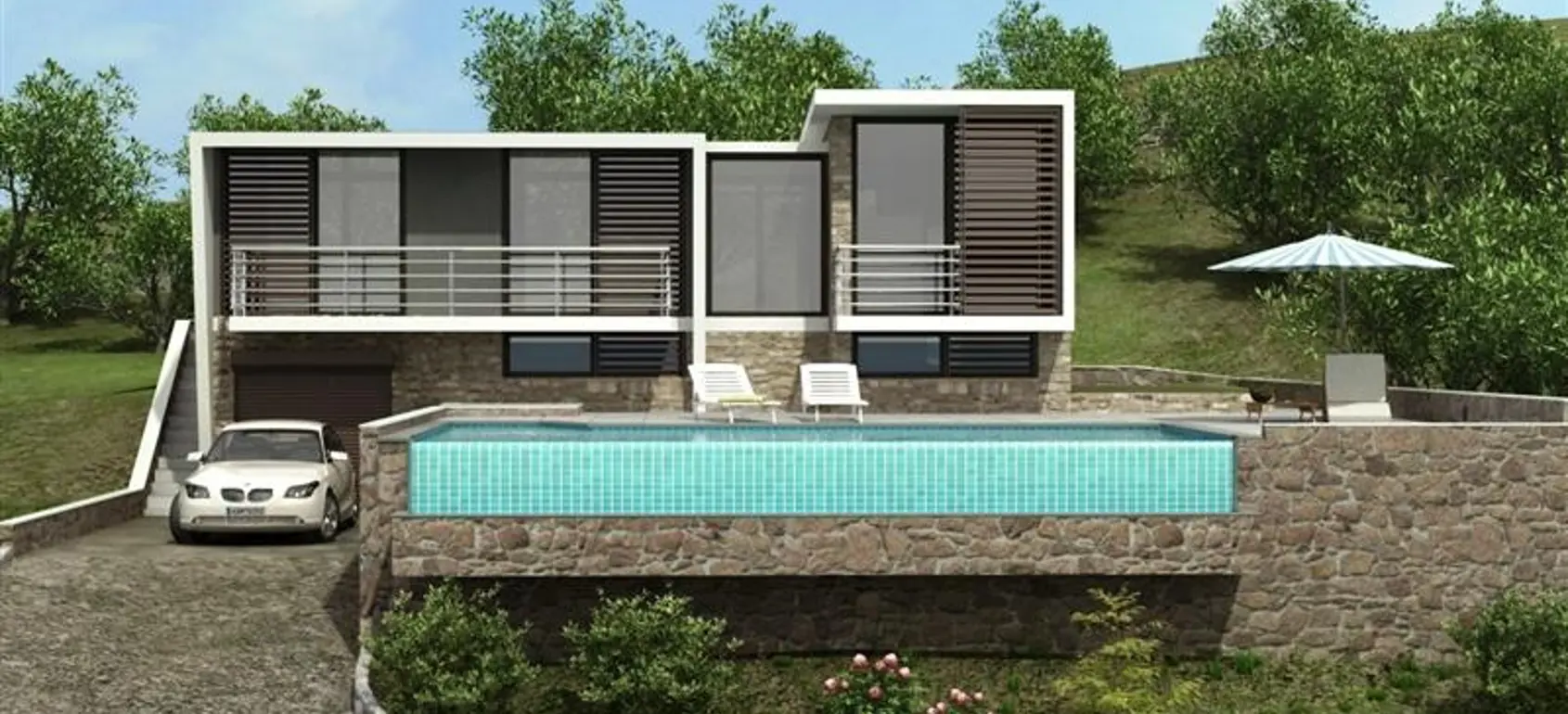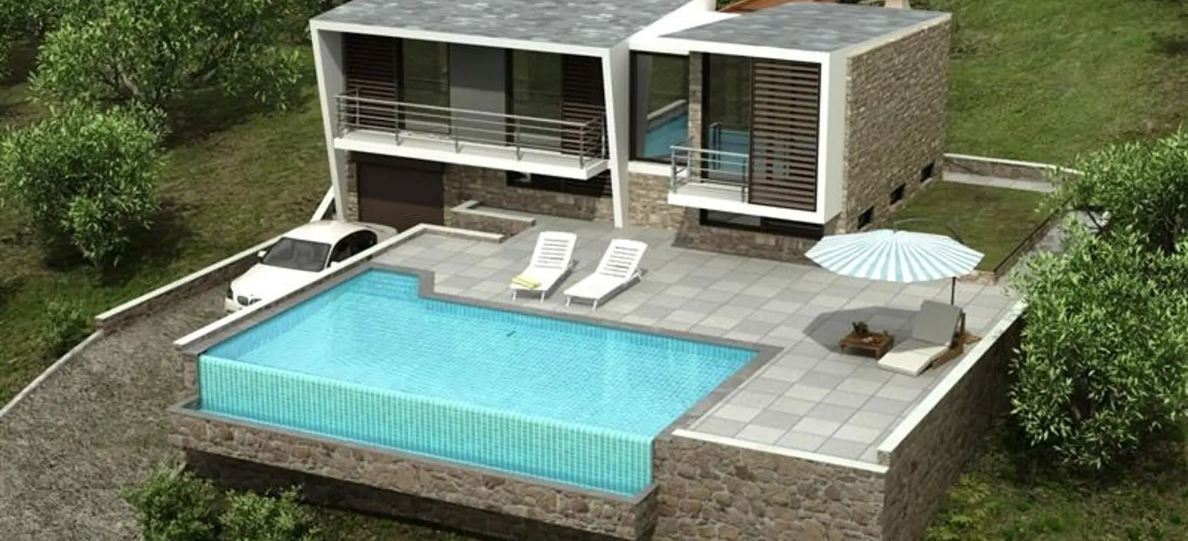 The complex will consist of 6 separate villas of 120 sqm total space, arranged in 2 levels. All villas will be standard equipped with an autonomous heating system and air conditioning. They will be fully furnished and equipped with high quality objects that will be chosen by their buyers. The ground level of the house includes two bedrooms, one with en-suite bathroom, one extra bathroom and access to the open areas and the swimming pool. The top floor disposes of a spacious sitting room, open plan dining area and kitchen, one bedroom and a bathroom.