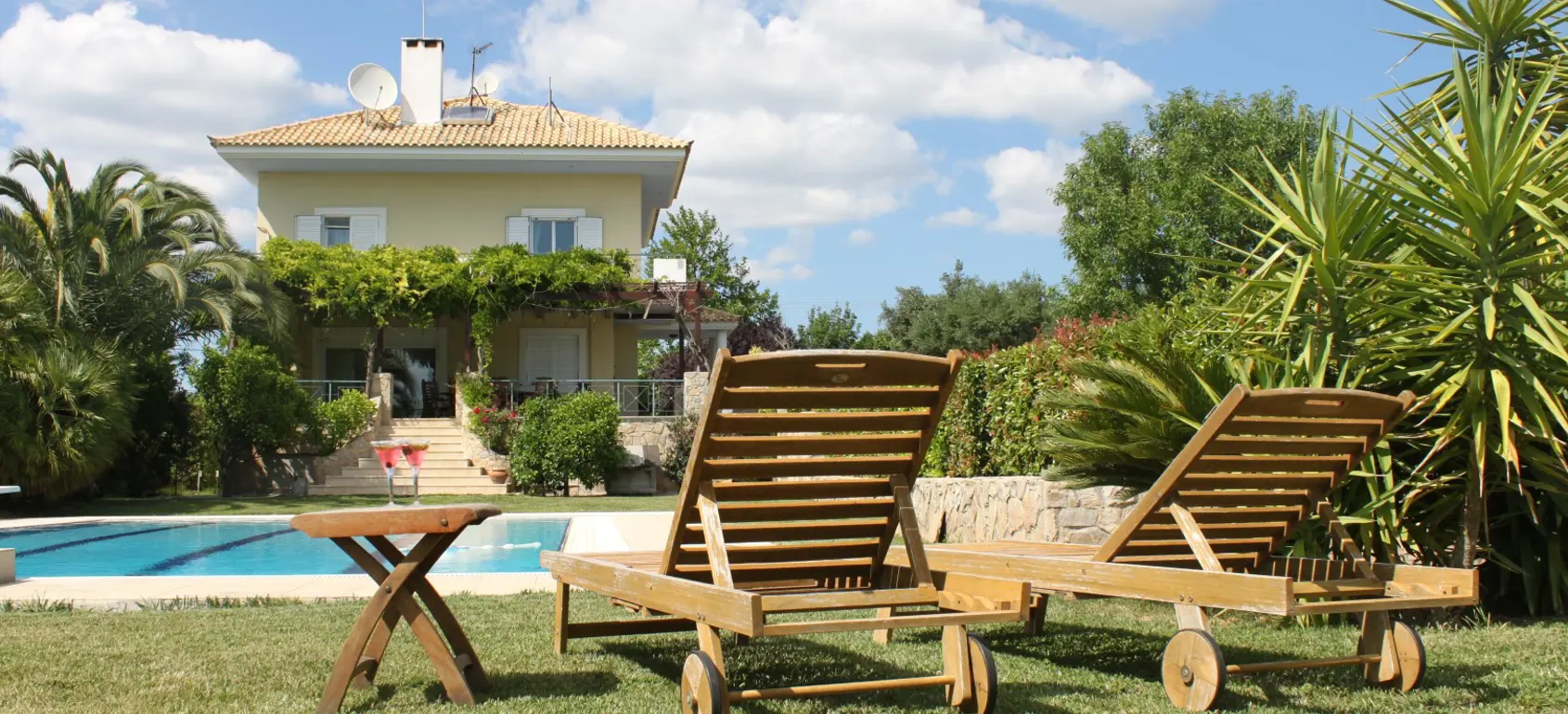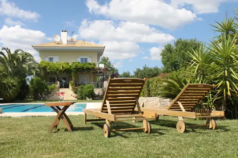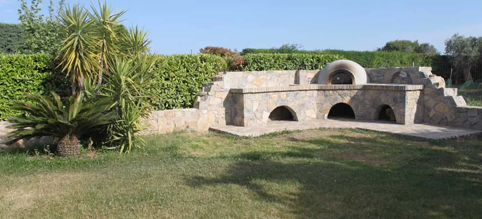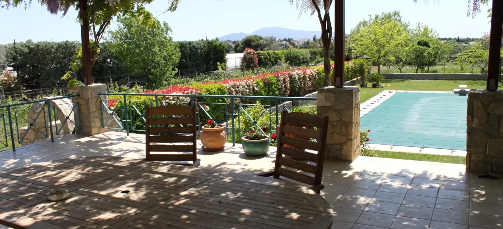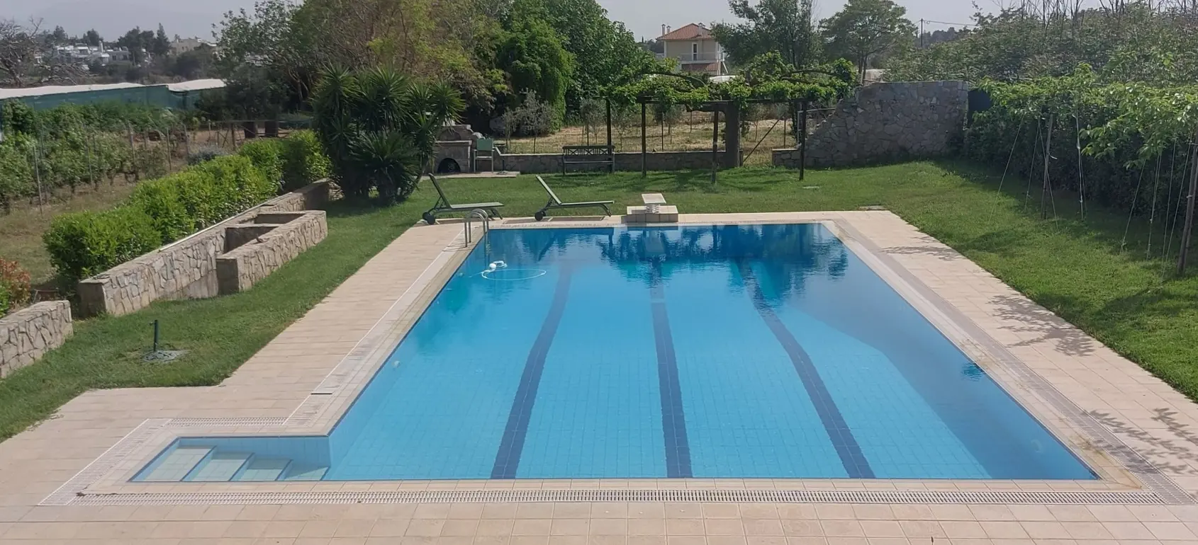 The villa is surrounded by private gardens which includes an established grapevine, olive trees, a football and badminton area, and area designated for a full-sized tennis court (not yet developed), extensive grassed areas, a poultry area and vegetable gardens. In the corner of the grassed area near the swimming pool there is an external cooking area with BBQ and a classic Greek village style brick oven, and a sink.