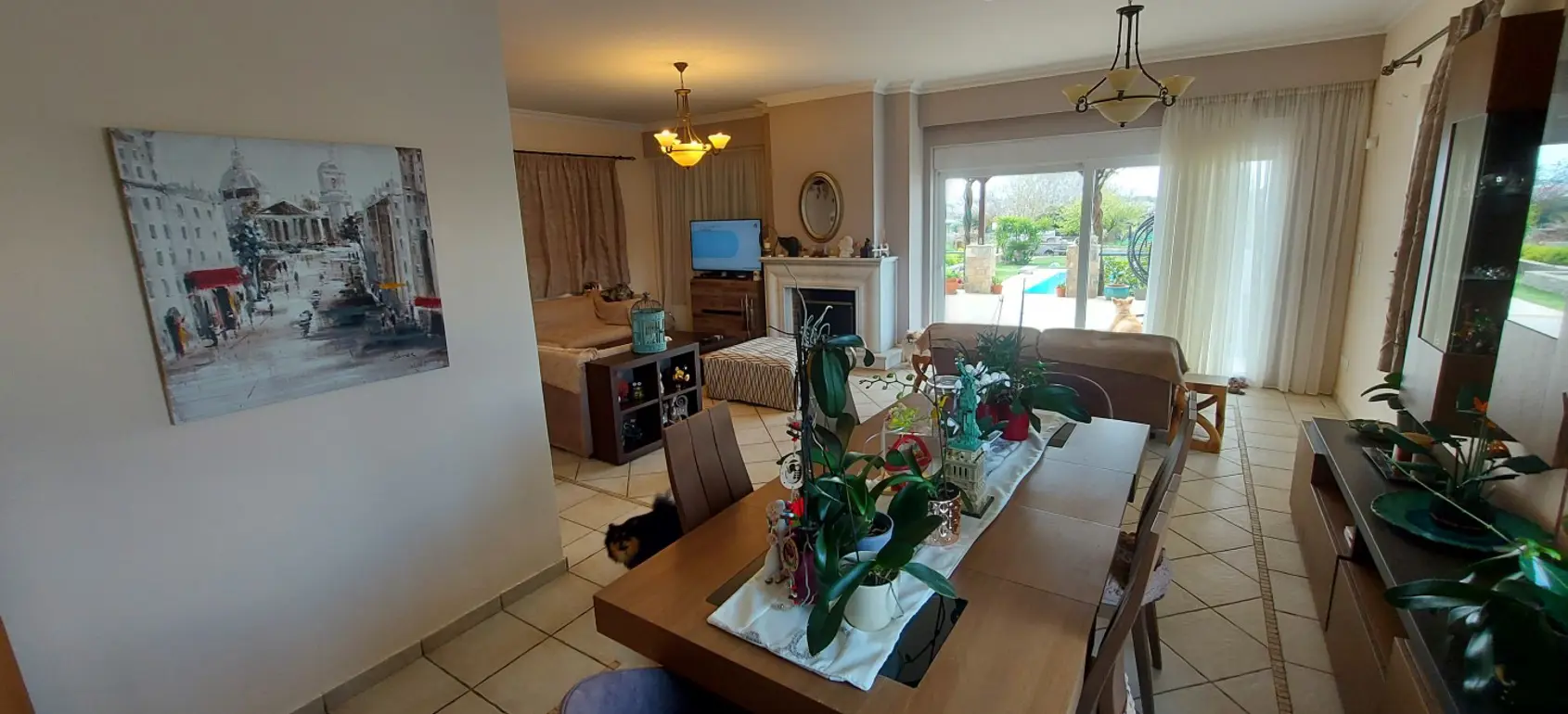 The charming and well laid out spacious villa was constructed in 2,000. It has a 450sqm floor area spread over three floors and includes a kitchen-family room, living-dining area, living-taverna area, office, snooker room (with an antique Victorian full sized snooker table which may be available as an optional extra), 5 bedrooms, 4 bathrooms, WC, music room, laundry room, mechanical room, extensive storage. The structure of the building was designed and built to an extremely high specification far exceeding normal earth quake codes and this is fully documented.