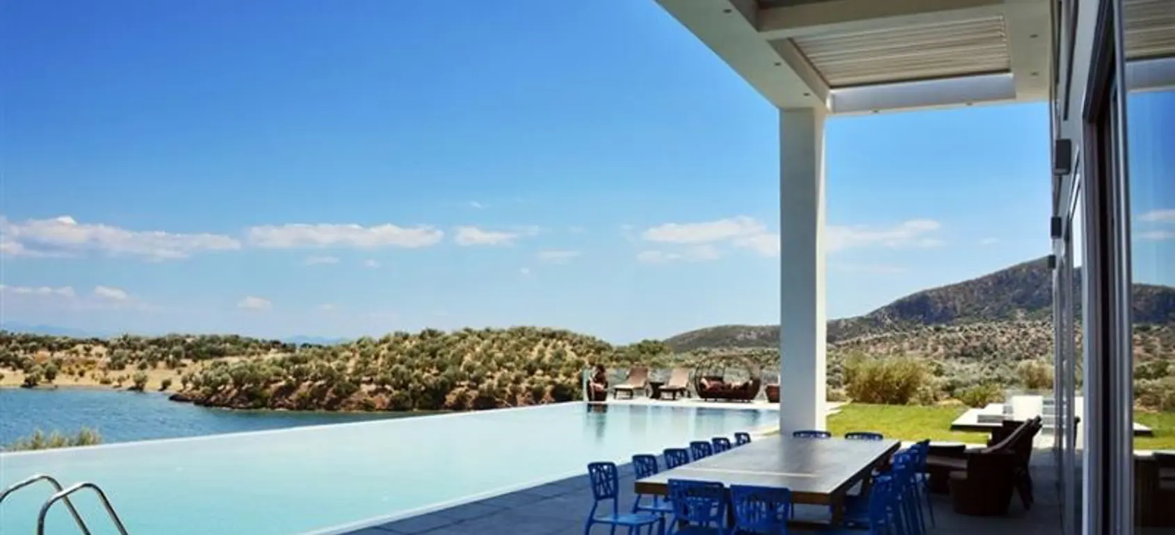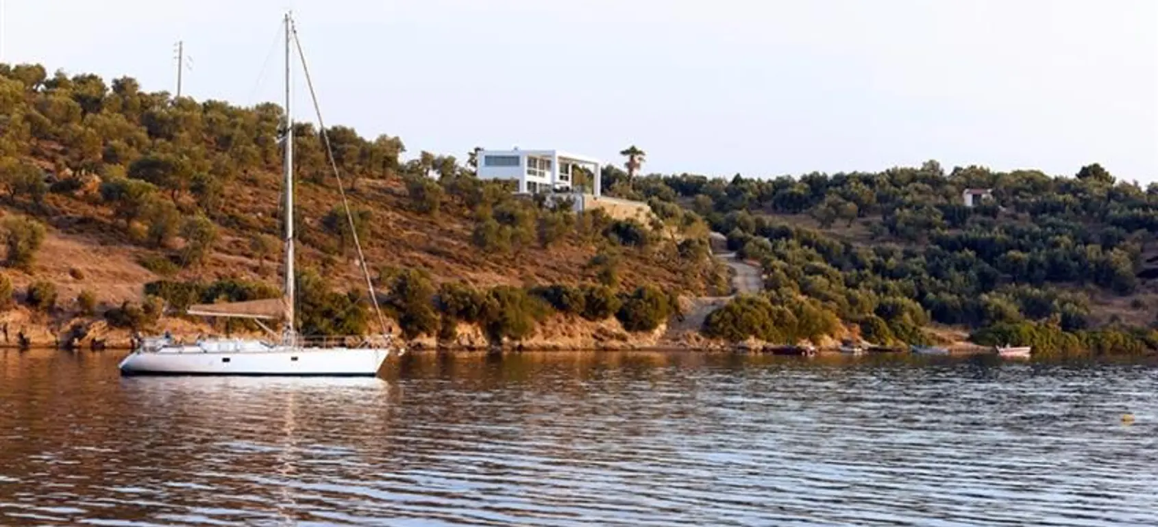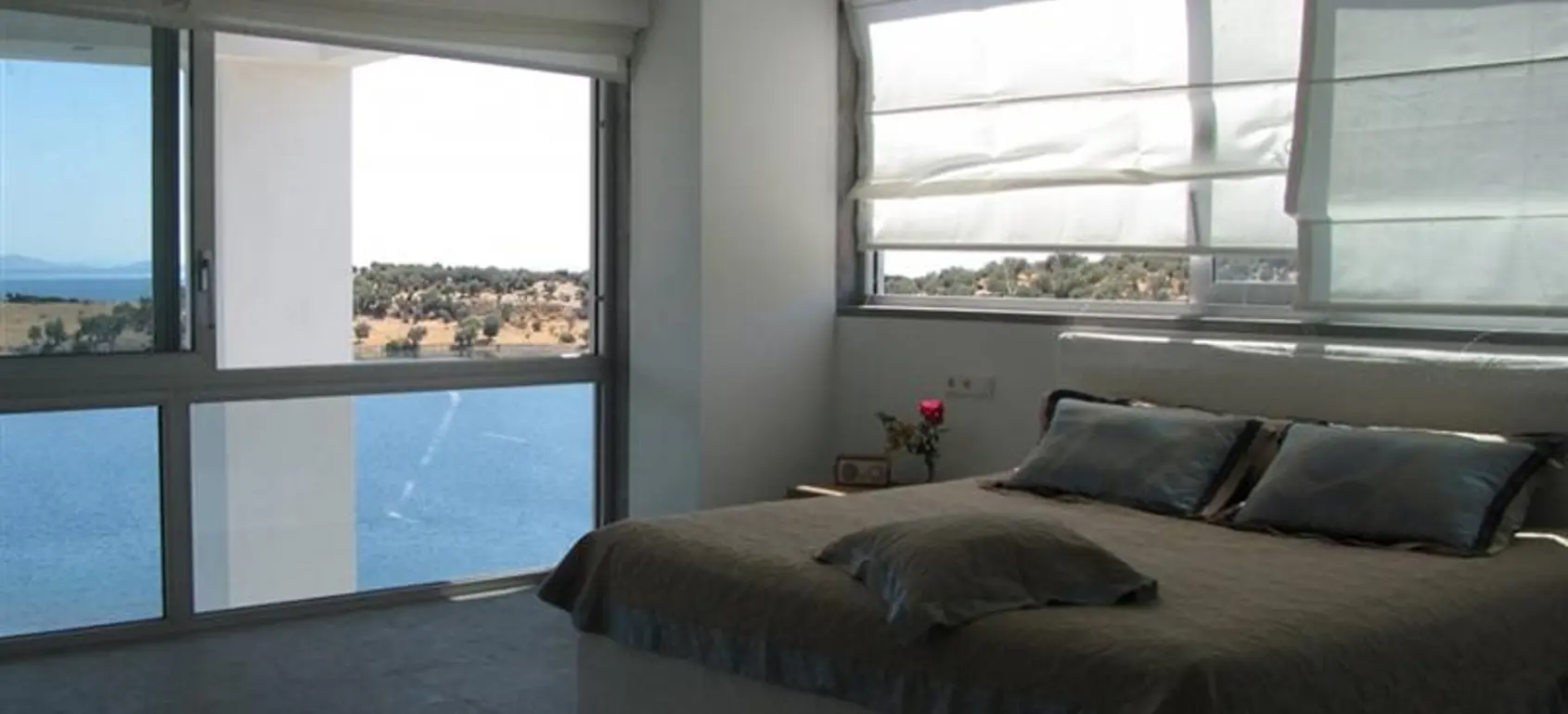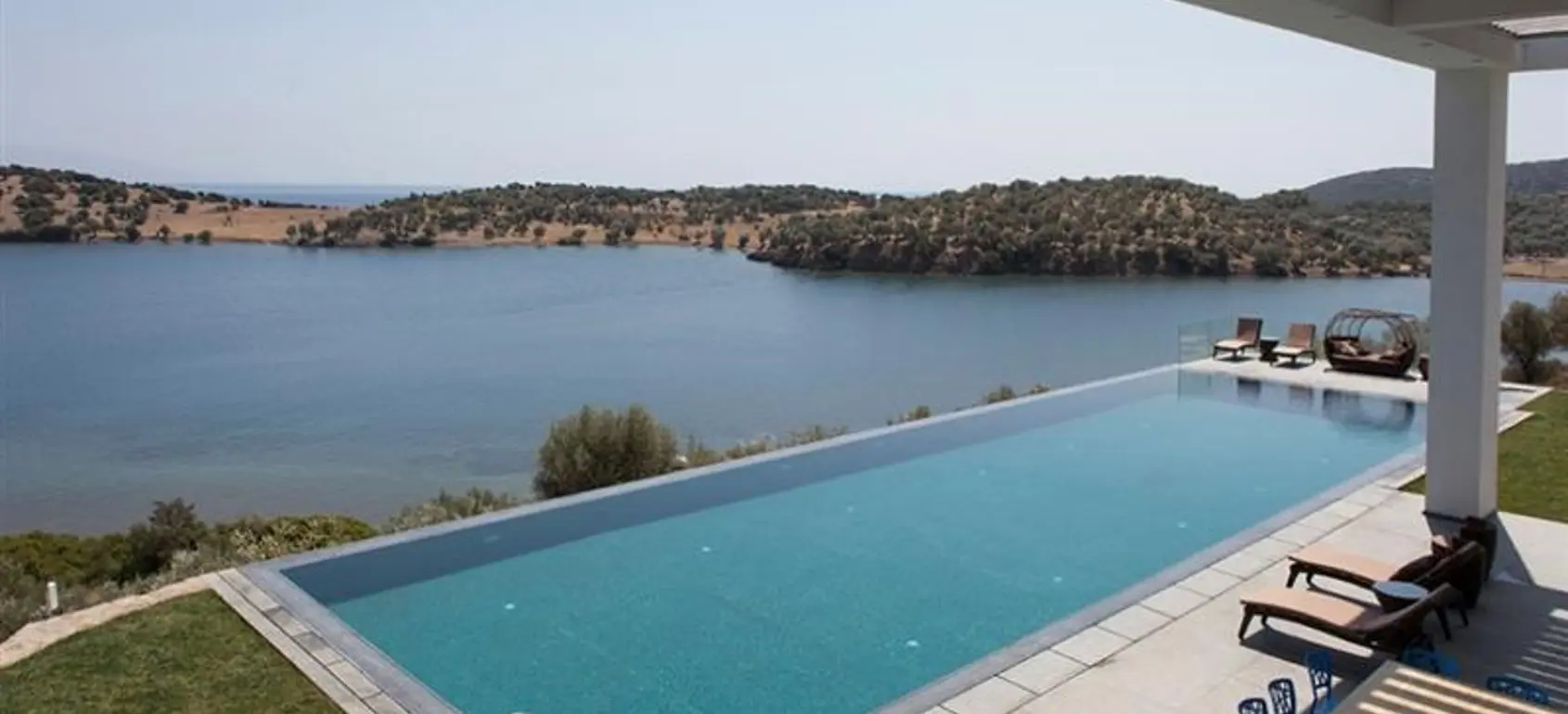 The modernly designed villa comprises of 2 floors and a lower-ground level with 5 bedrooms and 6 full bathrooms, totaling over 500 sq. meters. The villa is situated in a 4,000 sq. meter of garden and terrace garden, featuring a half size Olympic pool, jacuzzi and a private pathway to the sea and floating dock. The villa is just 30 meters away from the Aegean seafront and 25 minutes away from Mitilini Airport. Due to its superb location, offers the possibility to anchor any sized yacht in any sea condition, in that bay, right in front of the property. The Villa’s water supply comes from its own well. It comes fully furnished and equipped with top of the line appliances and amenities. The villa has been constructed to the highest standard using the most luxurious decor, fittings and fixtures. The interior is furnished with contemporary high end furniture and bright decor. The huge living space is extremely well equipped with the latest technology. This includes satellite TV, high speed Wifi, security alarm, oversized kitchen appliances, BBQ. Each room has its own temperature controlled a.c through a central system. The infinity pool is catered for both professional sports training as well as recreational swimming. The water is 40% sea water and 60% sweet water. There is no need to add any chemicals as the pool system produces a natural chlorine effect from the salt of the seawater. Just by the pool there is a vast Jacuzzi that can accommodate up to 10 people. The villa overlooks the picturesque bay and the peninsula, behind spreads the Aegean Sea. The area is a coast-lined oasis in an olive forest, with beautiful views of lush green trees and sea-blue waters.