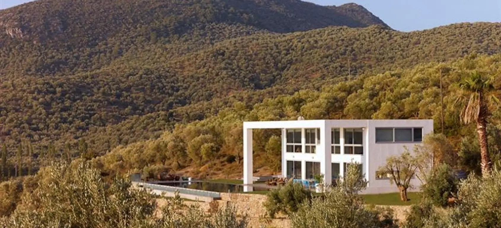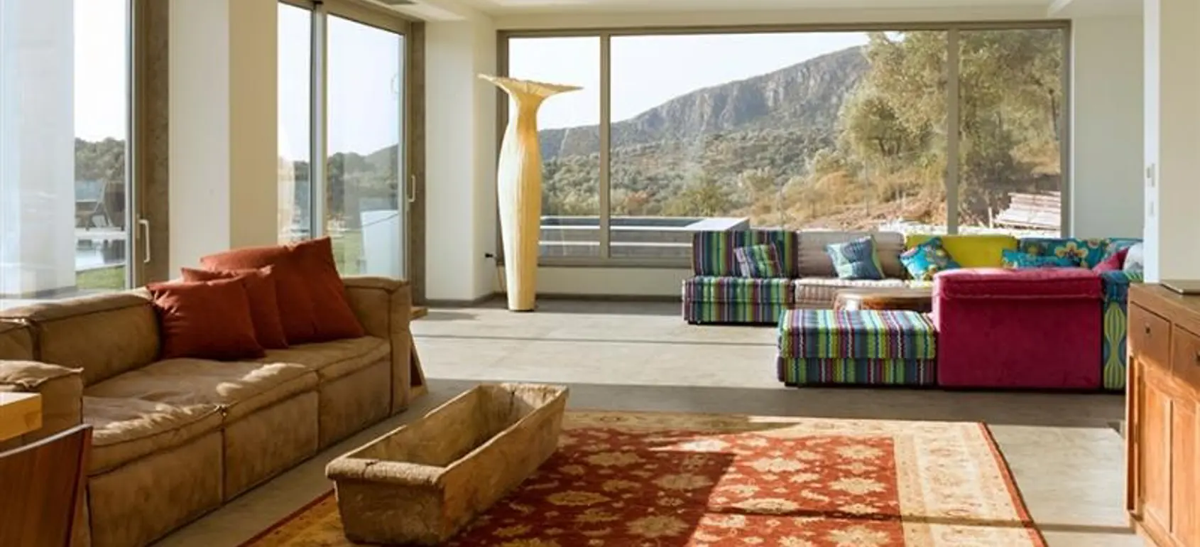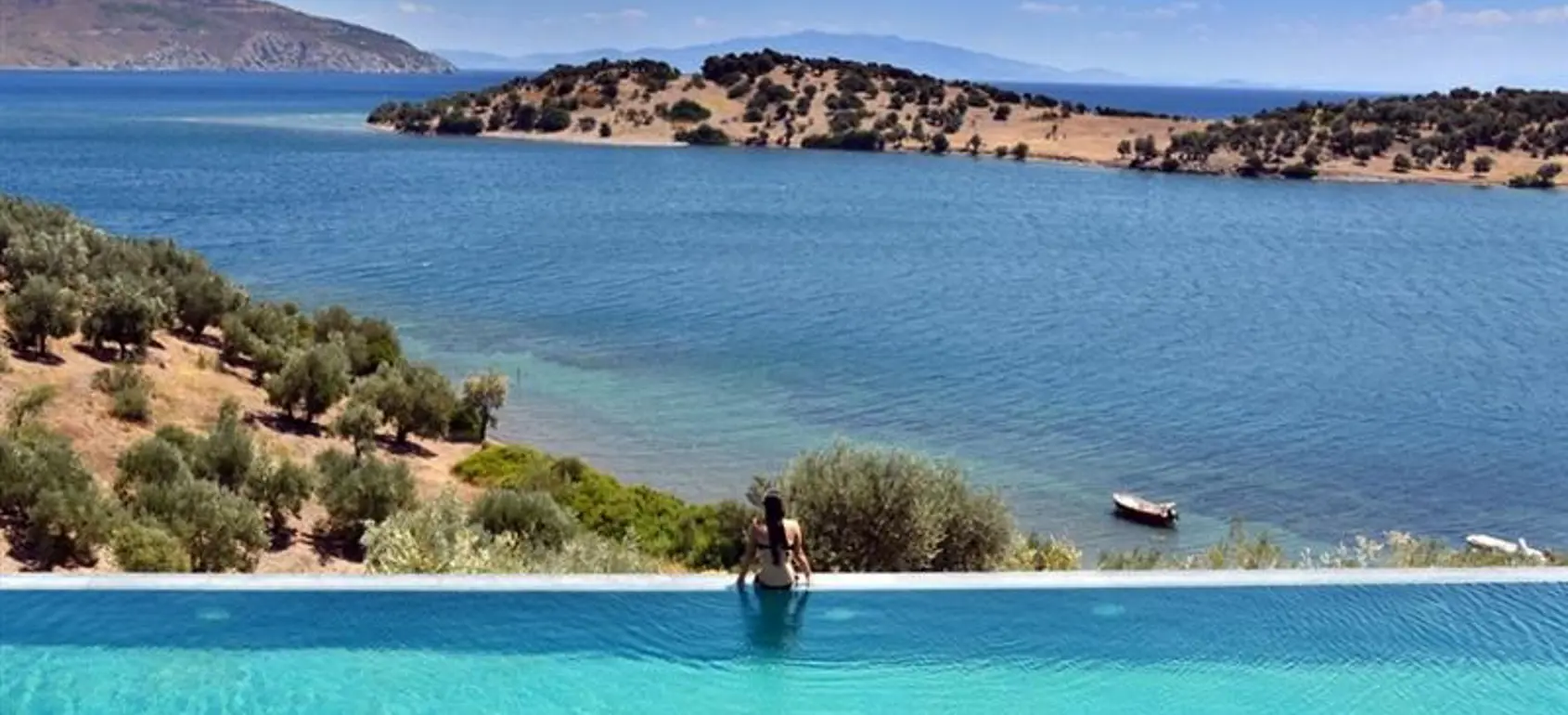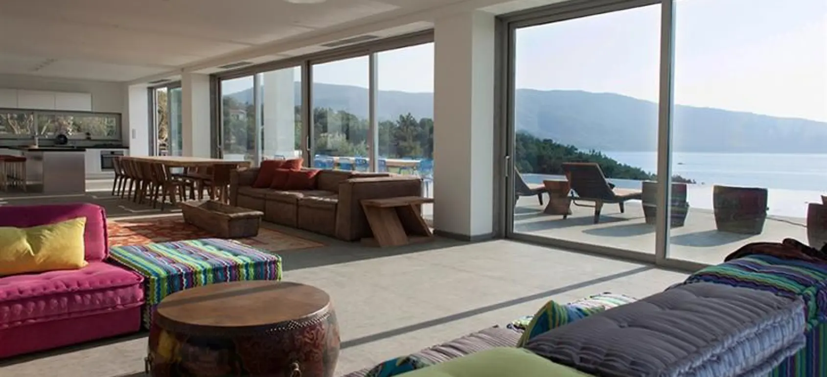 The modernly designed villa comprises of 2 floors and a lower-ground level with 5 bedrooms and 6 full bathrooms, totaling over 500 sq. meters. The villa is situated in a 4,000 sq. meter of garden and terrace garden, featuring a half size Olympic pool, jacuzzi and a private pathway to the sea and floating dock. The villa is just 30 meters away from the Aegean seafront and 25 minutes away from Mitilini Airport. Due to its superb location, offers the possibility to anchor any sized yacht in any sea condition, in that bay, right in front of the property. The Villa’s water supply comes from its own well. It comes fully furnished and equipped with top of the line appliances and amenities. The villa has been constructed to the highest standard using the most luxurious decor, fittings and fixtures. The interior is furnished with contemporary high end furniture and bright decor. The huge living space is extremely well equipped with the latest technology. This includes satellite TV, high speed Wifi, security alarm, oversized kitchen appliances, BBQ. Each room has its own temperature controlled a.c through a central system. The infinity pool is catered for both professional sports training as well as recreational swimming. The water is 40% sea water and 60% sweet water. There is no need to add any chemicals as the pool system produces a natural chlorine effect from the salt of the seawater. Just by the pool there is a vast Jacuzzi that can accommodate up to 10 people. The villa overlooks the picturesque bay and the peninsula, behind spreads the Aegean Sea. The area is a coast-lined oasis in an olive forest, with beautiful views of lush green trees and sea-blue waters.