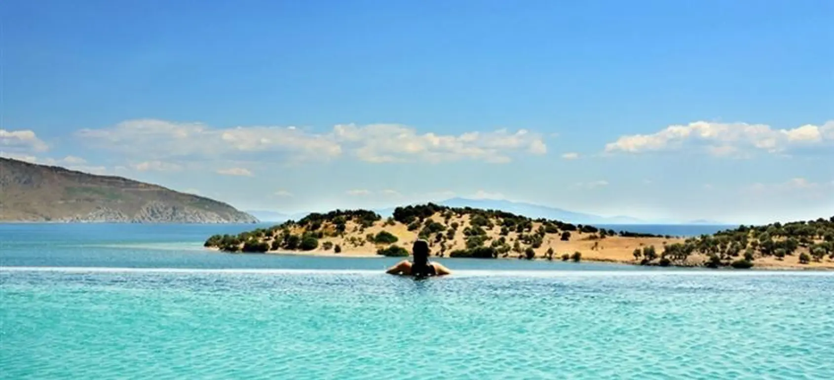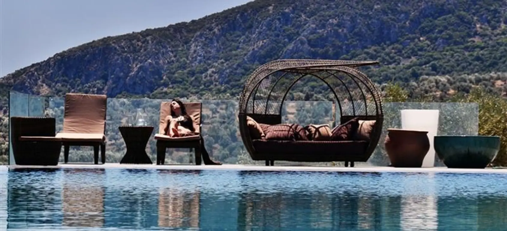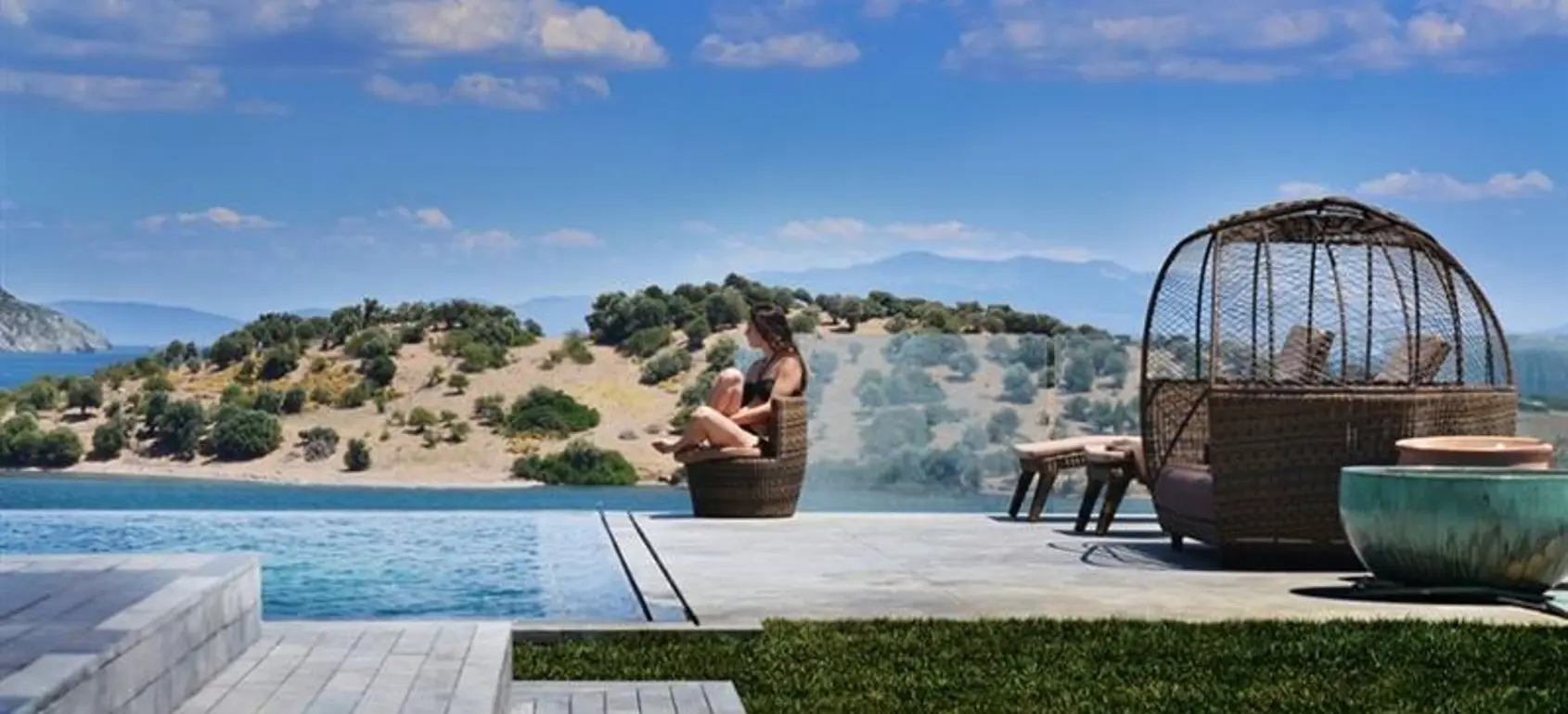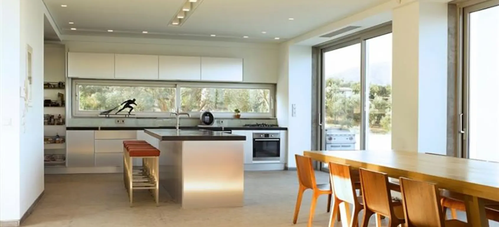 The modernly designed villa comprises of 2 floors and a lower-ground level with 5 bedrooms and 6 full bathrooms, totaling over 500 sq. meters. The villa is situated in a 4,000 sq. meter of garden and terrace garden, featuring a half size Olympic pool, jacuzzi and a private pathway to the sea and floating dock. The villa is just 30 meters away from the Aegean seafront and 25 minutes away from Mitilini Airport. Due to its superb location, offers the possibility to anchor any sized yacht in any sea condition, in that bay, right in front of the property. The Villa’s water supply comes from its own well. It comes fully furnished and equipped with top of the line appliances and amenities. The villa has been constructed to the highest standard using the most luxurious decor, fittings and fixtures. The interior is furnished with contemporary high end furniture and bright decor. The huge living space is extremely well equipped with the latest technology. This includes satellite TV, high speed Wifi, security alarm, oversized kitchen appliances, BBQ. Each room has its own temperature controlled a.c through a central system. The infinity pool is catered for both professional sports training as well as recreational swimming. The water is 40% sea water and 60% sweet water. There is no need to add any chemicals as the pool system produces a natural chlorine effect from the salt of the seawater. Just by the pool there is a vast Jacuzzi that can accommodate up to 10 people. The villa overlooks the picturesque bay and the peninsula, behind spreads the Aegean Sea. The area is a coast-lined oasis in an olive forest, with beautiful views of lush green trees and sea-blue waters.